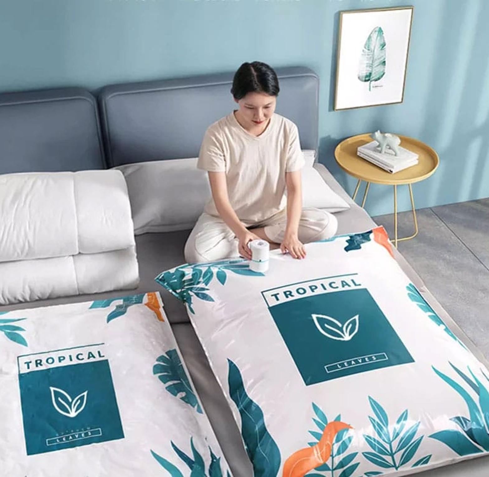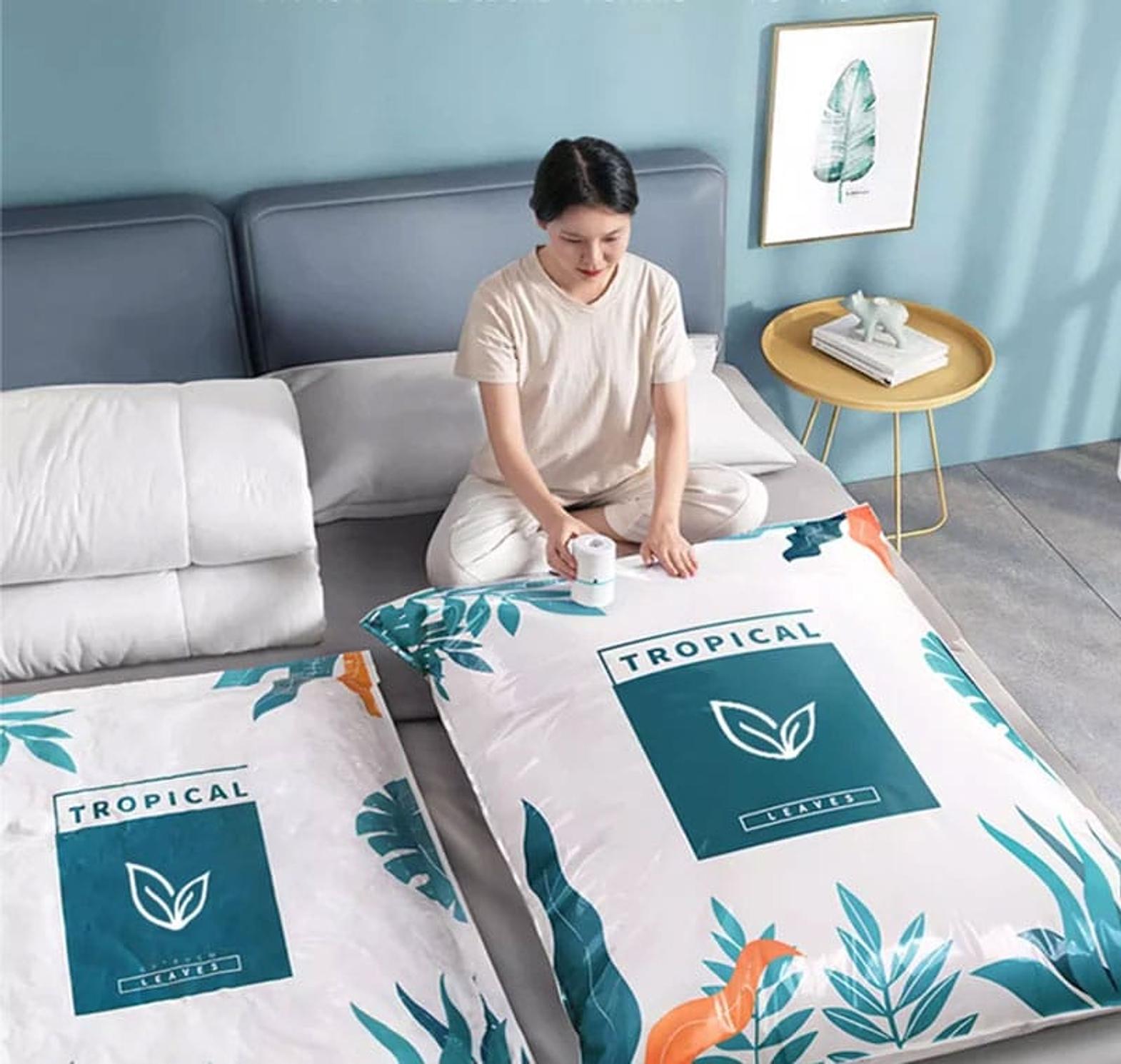 10pcs set vacuum compression storage bags (with electric pump) material: pa+pe material thickness: single layer 9 wire function: save space, moisture and dust, insect and moth comes with: 1 electric rechargeable pump extra large 100x90cm can hold about 11 kg quilt - 3pcs medium 80x60cm can be loaded with thin quilts or coat-3pcs small 70x50cm can hold thin clothing - 3pcs vacuum storage bags for clothes blankets comforters sweaters pillows home compression seal bags space saver bags