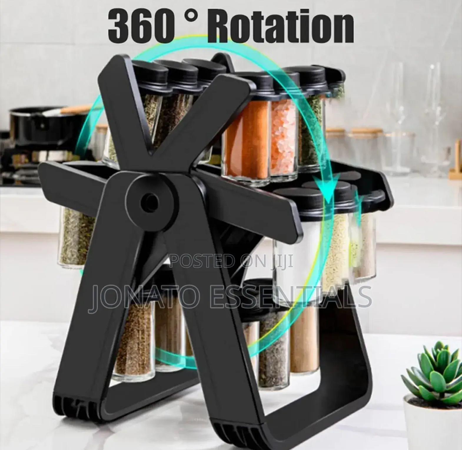 18-hole spice jar organizer with the spice jars windmill 18 jar rotating spice rack (18pc) capacity of each 180ml. features: 1. saves space in the kitchen and keep the countertop organized and neat. 2. 360-degree free rotation design is handy to use and find the spice jars. 3. food-grade materials to make the spice jars safe and reliable to use. 4. 18-hole large capacity design provides more storing space. 5. a stable structure without easy falling to use with convenience in the kitchen, pantry, etc. with bottles 18 cans ferris wheel rotating glass seasoning rack set seasoning bottle jar spice jar seasoning bottle.