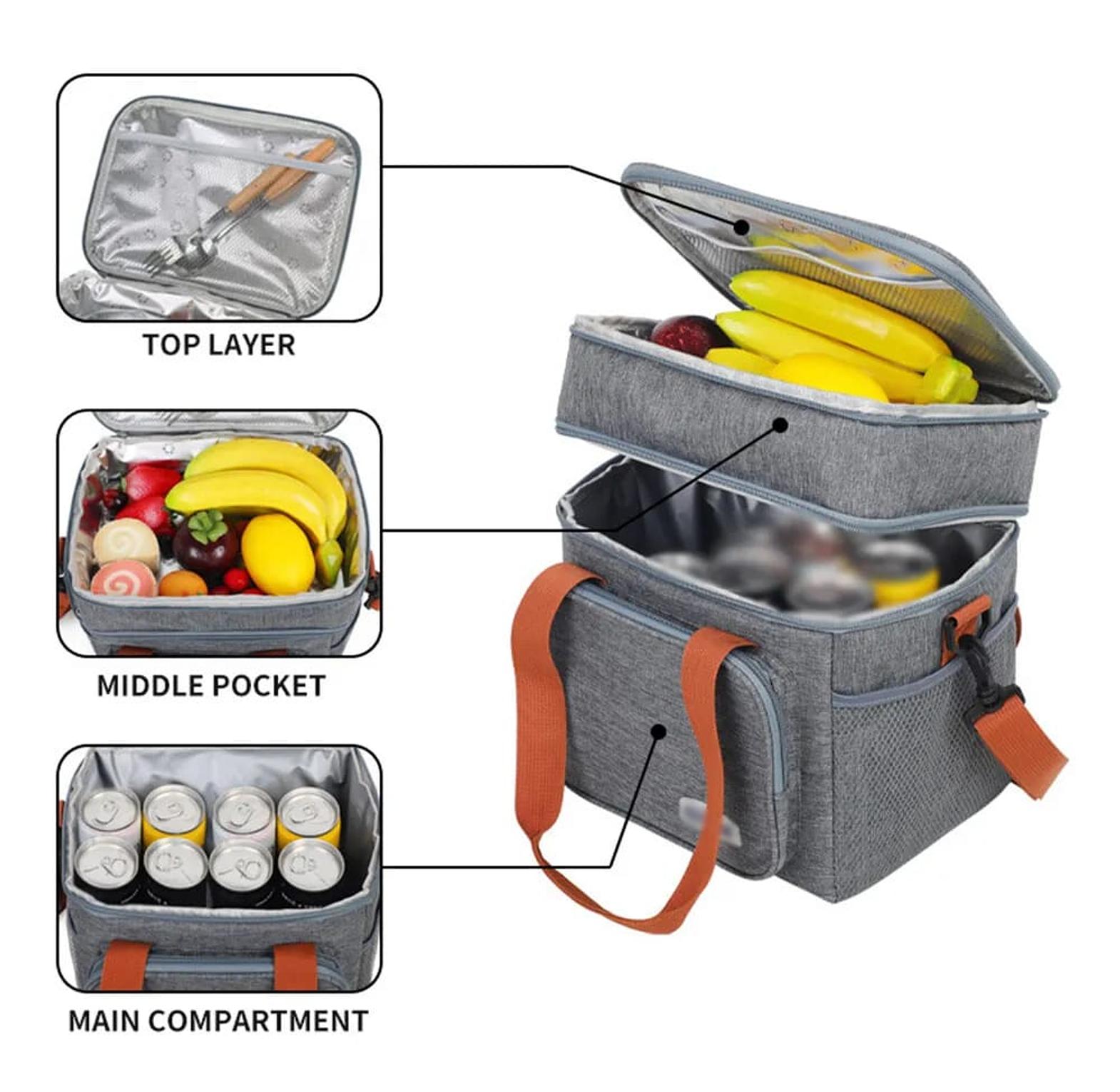 2 layer insulated lunch bag brivilas branded 2 layer insulated food bag size 26x18x28cm it is an ideal choice for camping, hiking, barbecue, dining out, picnics, road trips, office lunches, beaches, and more! the inner lining is made of insulation material, which can keep food warm or cold, keep food cold/warm/fresh for several hours, and can also place ice cubes. insulated lunch bag large portable cooler lunch box for office work picnic beach workout reusable freezable tote lunch bag.