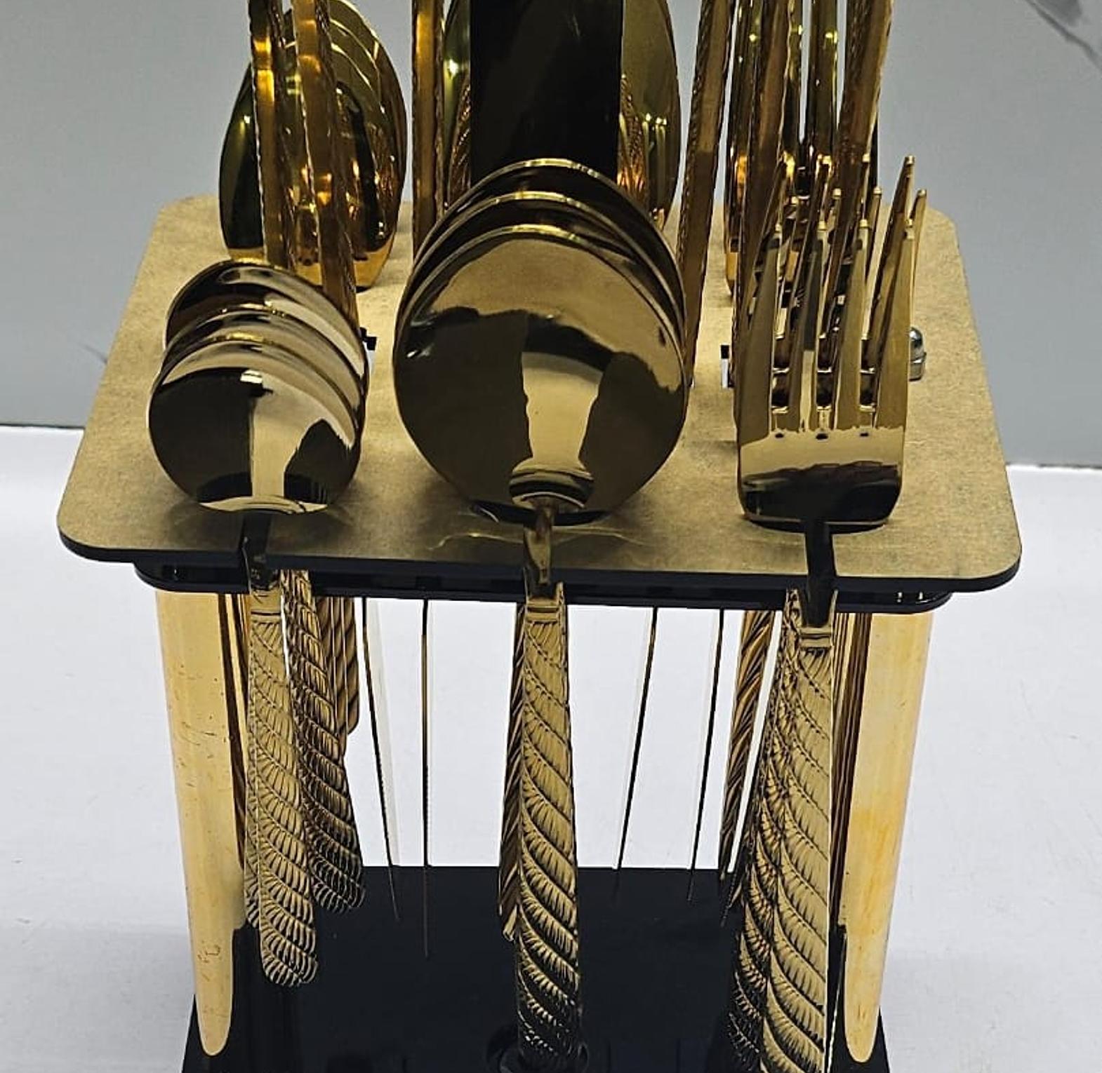 24-piece stainless steel cutlery set with stand high quality heavy golden 24pc cutlery set stand in box upgrade your dining experience with this luxury cutlery set, a 24-piece premium stainless steel flatware set designed for elegance and durability. featuring a stunning finish, this set includes knives, forks, tablespoons, and teaspoons, all ergonomically designed for comfortable grip and effortless dining. the set comes with a sleek black and gold stand, ensuring organized storage and an aesthetic appeal for your kitchen or dining table.