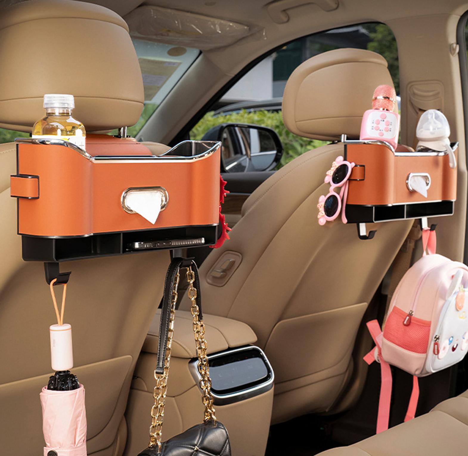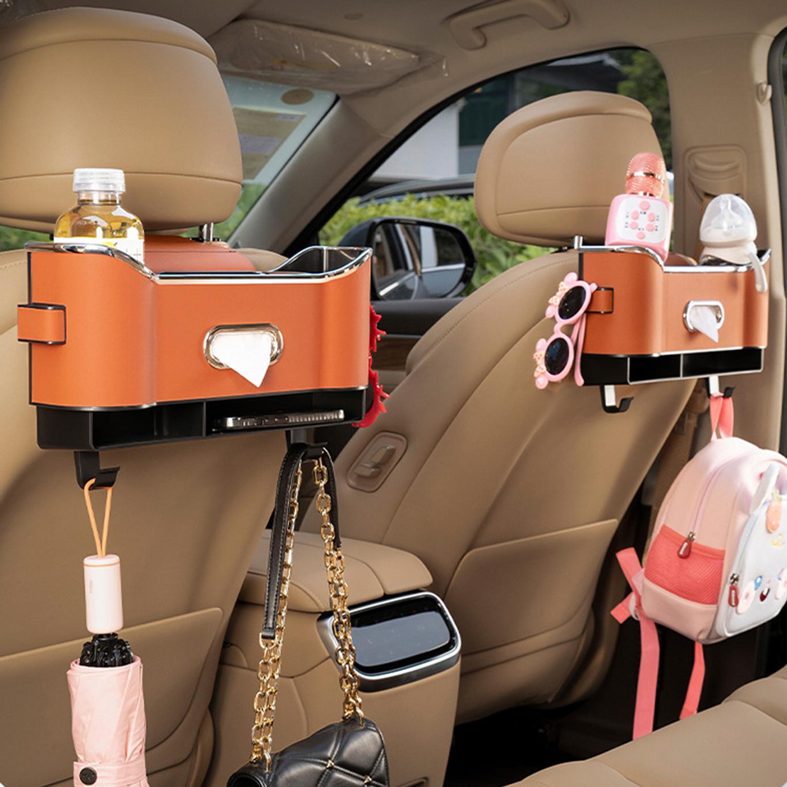 Car Seat Organizer with ABS Box & Tissue Holder. Double Storage for Snacks/Drinks.