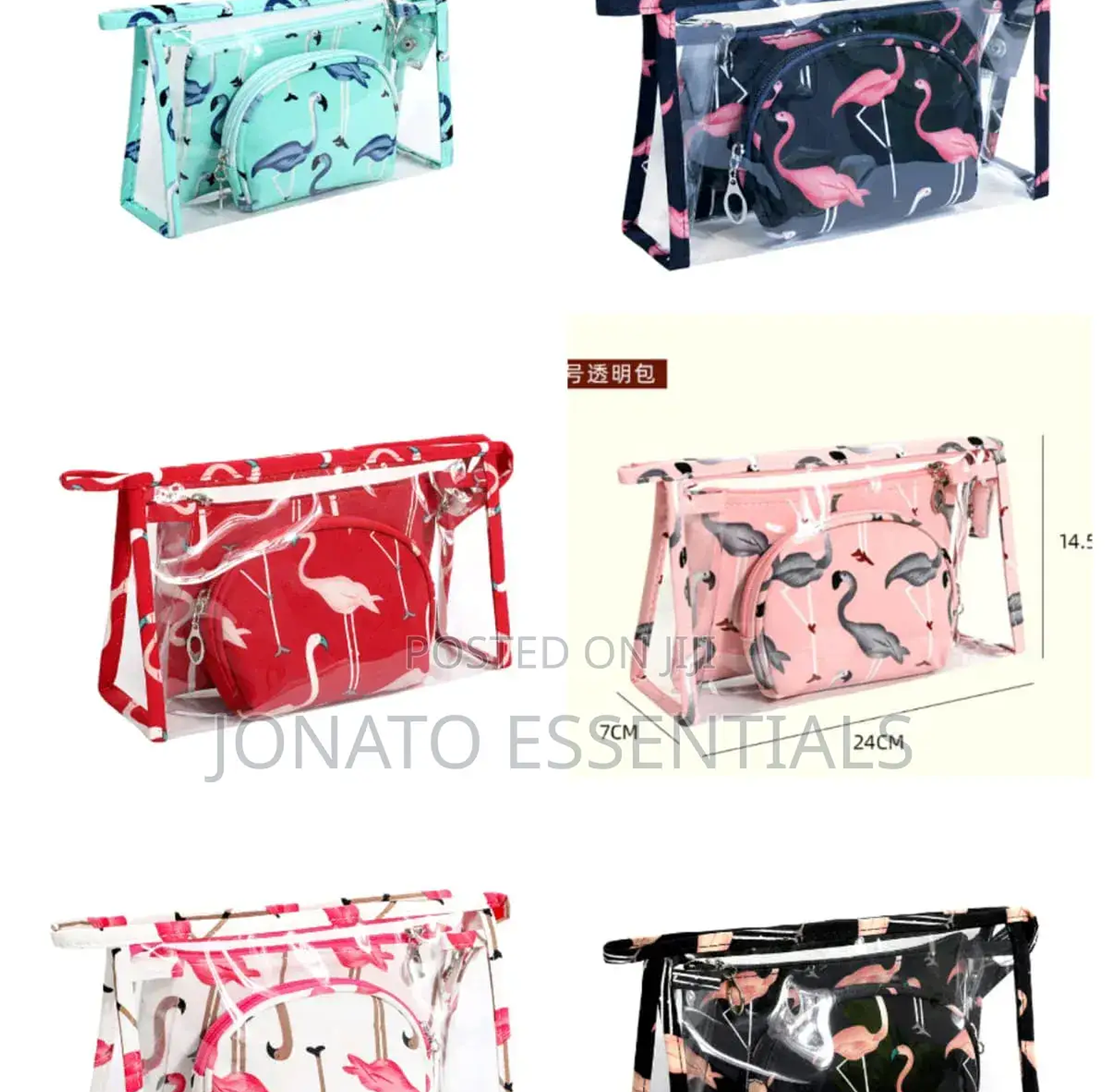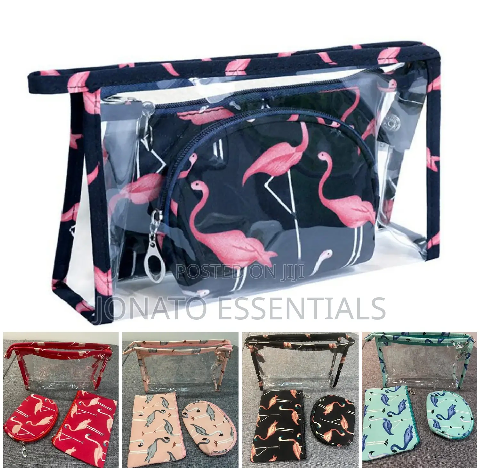 stay stylish and organized with this 3-in-1 transparent flamingo makeup bag set, perfect for storing cosmetics, toiletries, and travel essentials. made from durable, waterproof pvc material, these clear travel pouches allow easy visibility of your items while keeping them protected. the zippered closure ensures secure storage, and the compact, lightweight design makes them ideal for handbags, suitcases, and daily use. perfect for home, travel, gym, and work, these multi-purpose toiletry bags add a fashionable touch to your beauty routine.