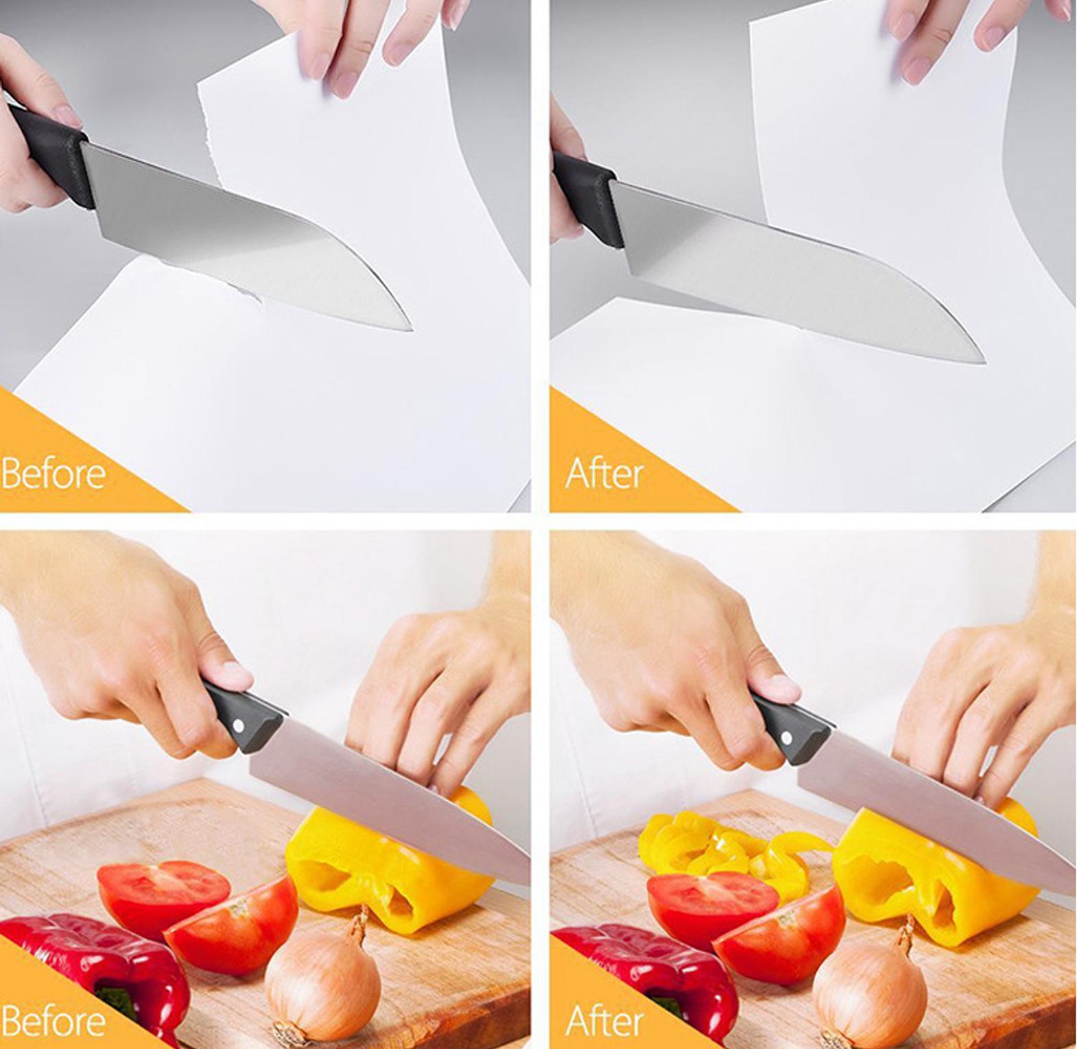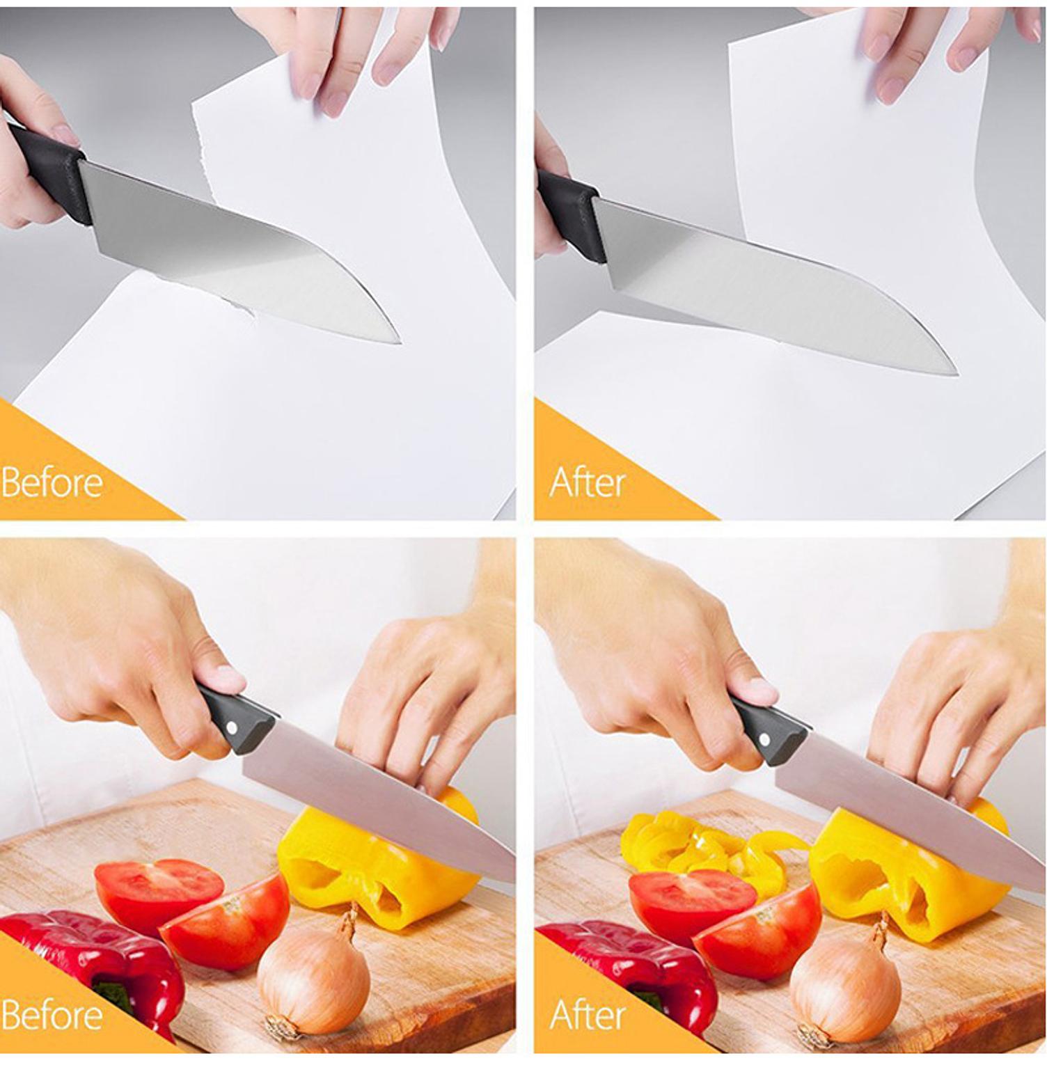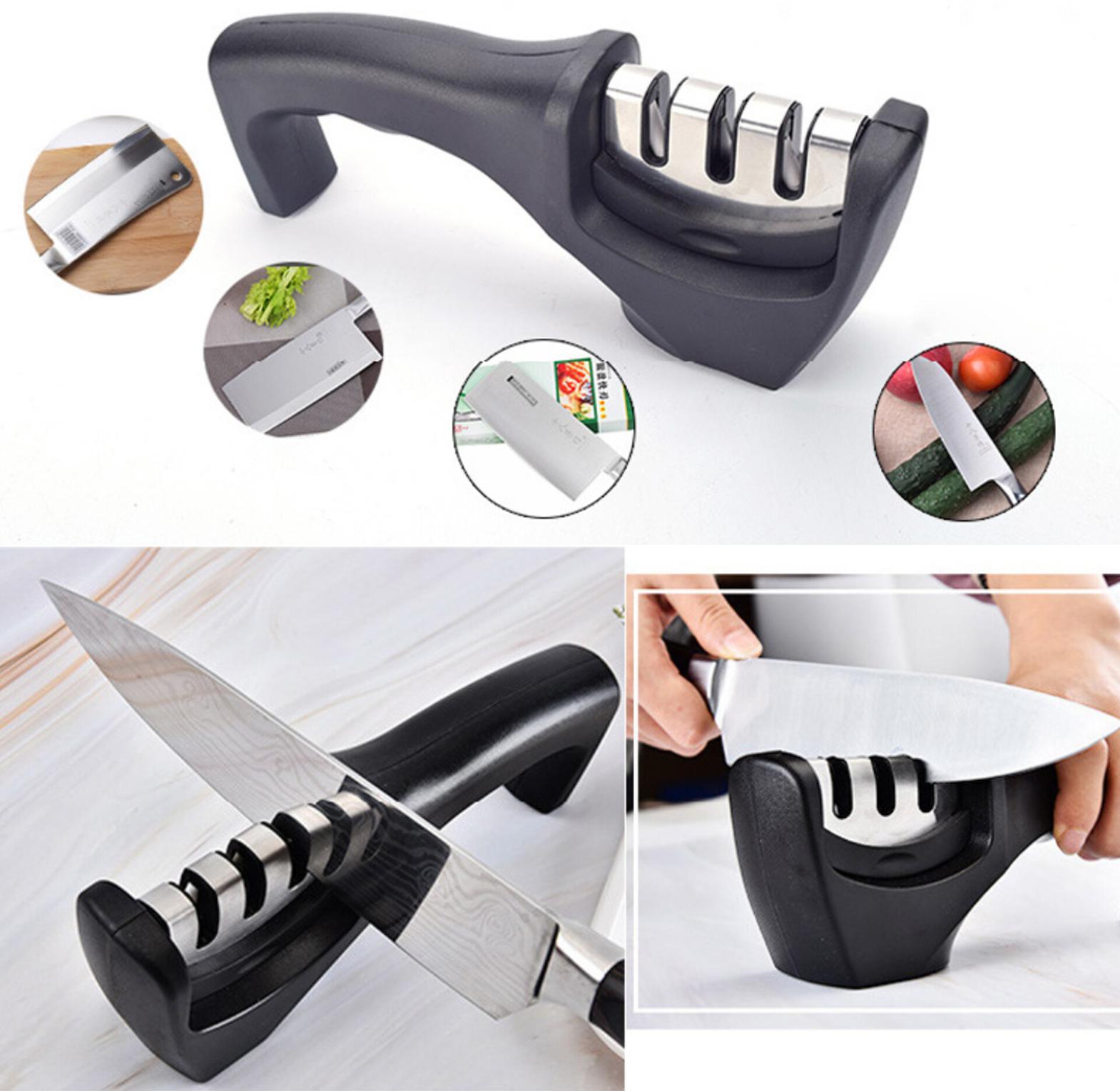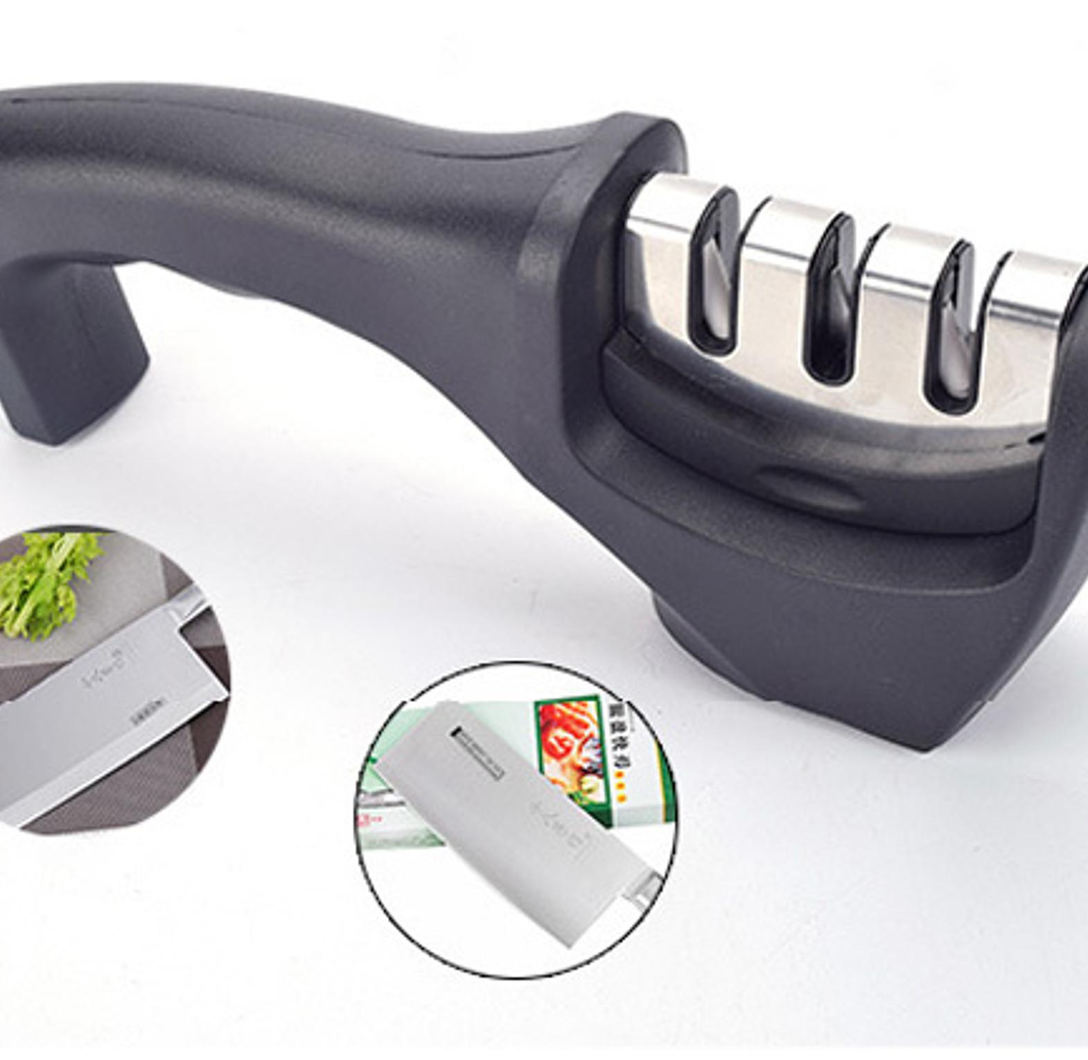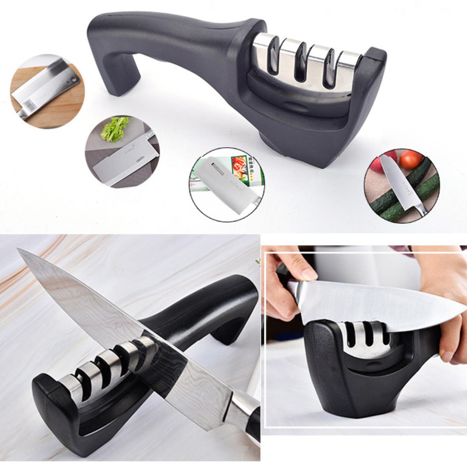 3 stage knife sharpener size 20*8*5cms material abs and stainless steel has nonslip base and ergonomic handle. sharpens most types of knives, including kitchen, household, sporting and pocket knives. knife sharpener 3 stage knife sharpening kitchen tool for dull steel paring chefs pocket knives to repair restore polish blades.