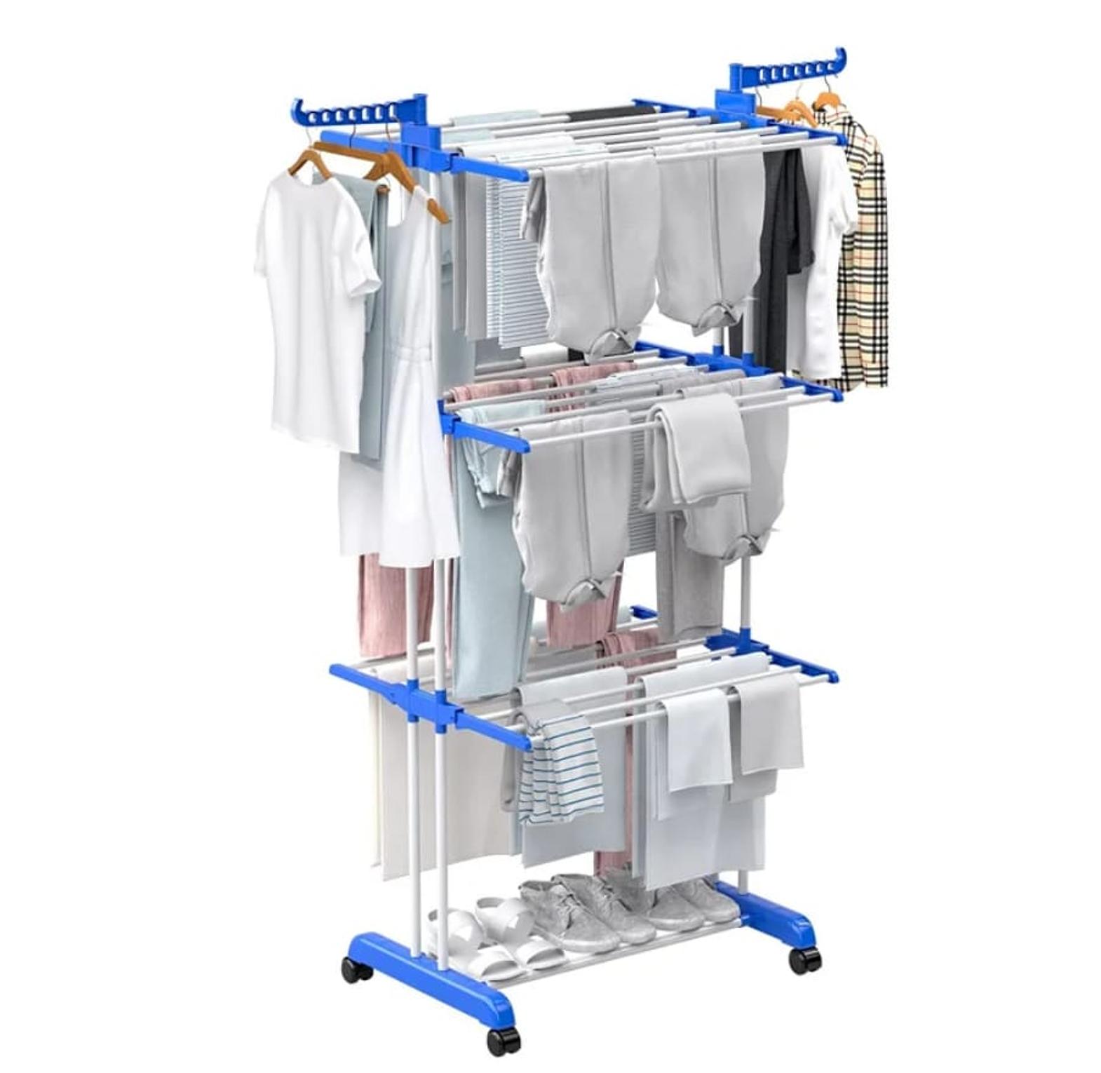 3-tier folding drying rack with two wings portable / movable cloth drying rack durable construction: made from high-quality iron and thick plastic, the clothes drying rack boasts a stable structure with strong load-bearing capacity. it resists deformation even with long-term use, ensuring lasting durability and rust resistance. versatile use: suitable for both indoor spaces and outdoor balconies, patios, and laundry rooms, the laundry drying rack offers a multifunctional storage solution for clothes and shoes. its folding design allows for easy storage, saving space and helping to maintain a tidy and organized living environment. 4-tier folding drying rack with two side wings clothes drying rack multifunctional clothes dryer stands for clothing bed linen.