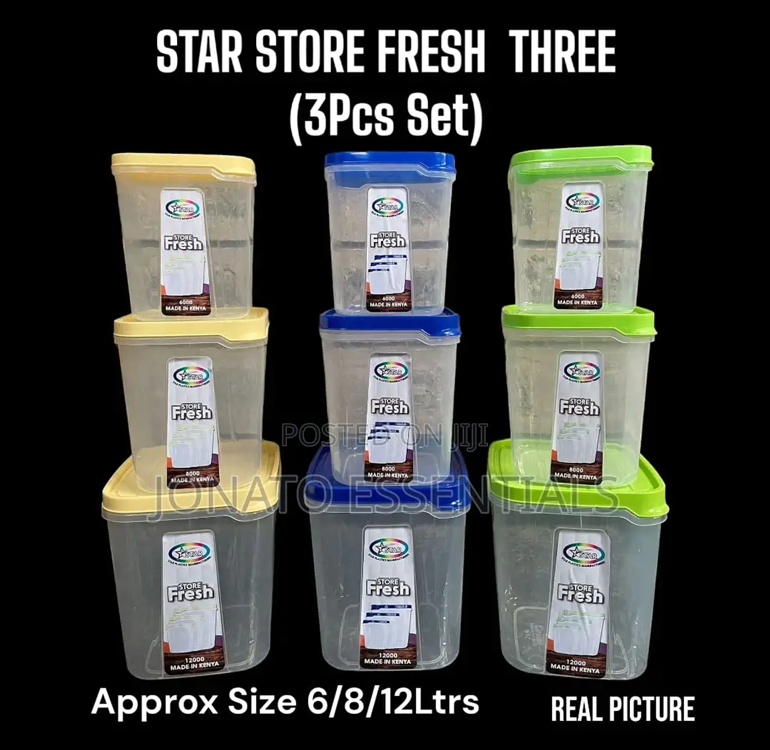 3pc storage containers set star store fresh three a set of 3pcs star store fresh three (3pcs set) – your ultimate storage solution! with sizes approximating 6/8/12ltrs, clear containers, and vibrant colored lids, they're perfect for all your storage needs. keep your kitchen organized and your ingredients fresh with star store. storage and organization containers.