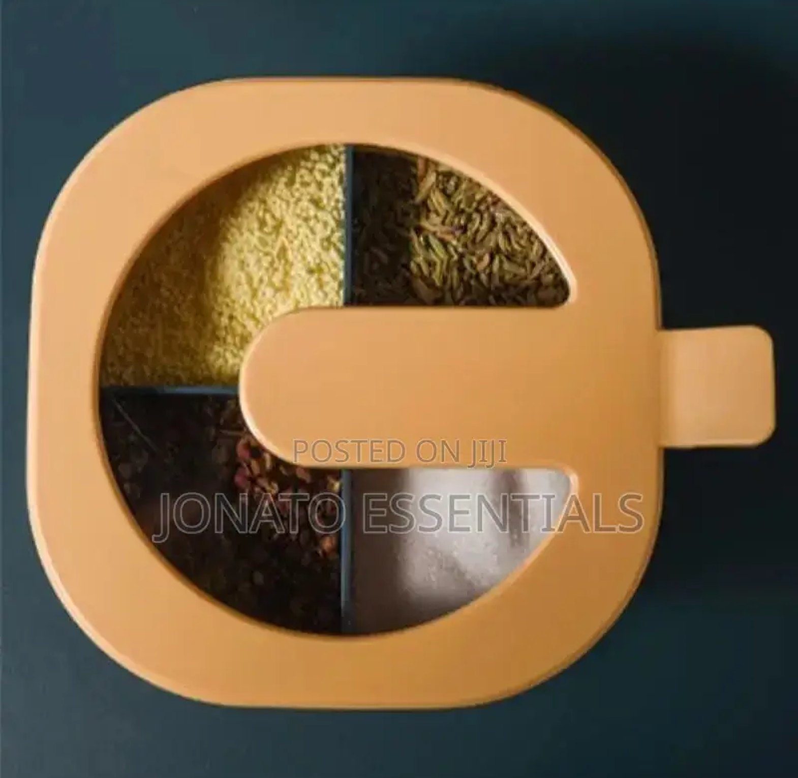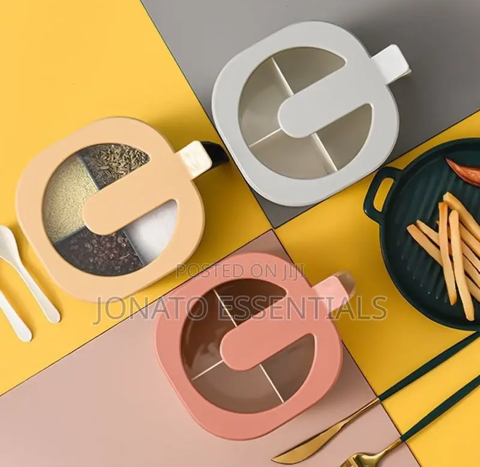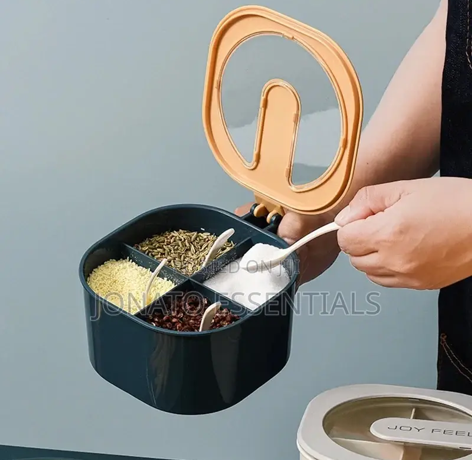 4 grid partitioned spice organizer box 4 partition spice organizer jar the use of flip-top method and transparent cover is more convenient and quick, with clear display and easy identification. waterproof and moisture-proof to protect the freshness of seasonings each small cell has a large capacity of 250ml, easy to put down the jar is made of ps material, safe and non-toxic various seasonings are stored separately, with a partition in the middle to prevent mixing 4-in-1 kitchen seasoning box with spoon spice jar multi compartment herb spice jars plastic pots accessories condiment container.