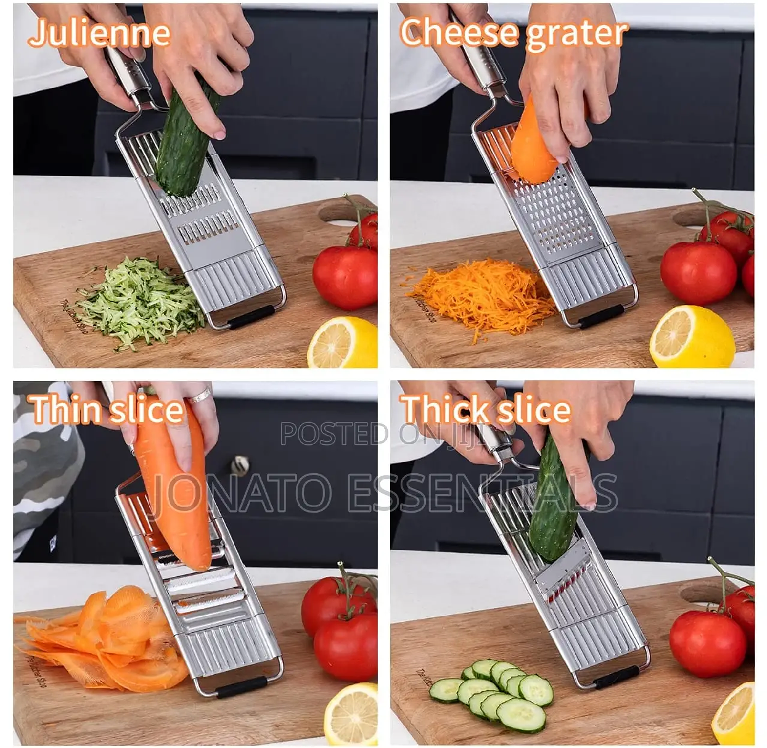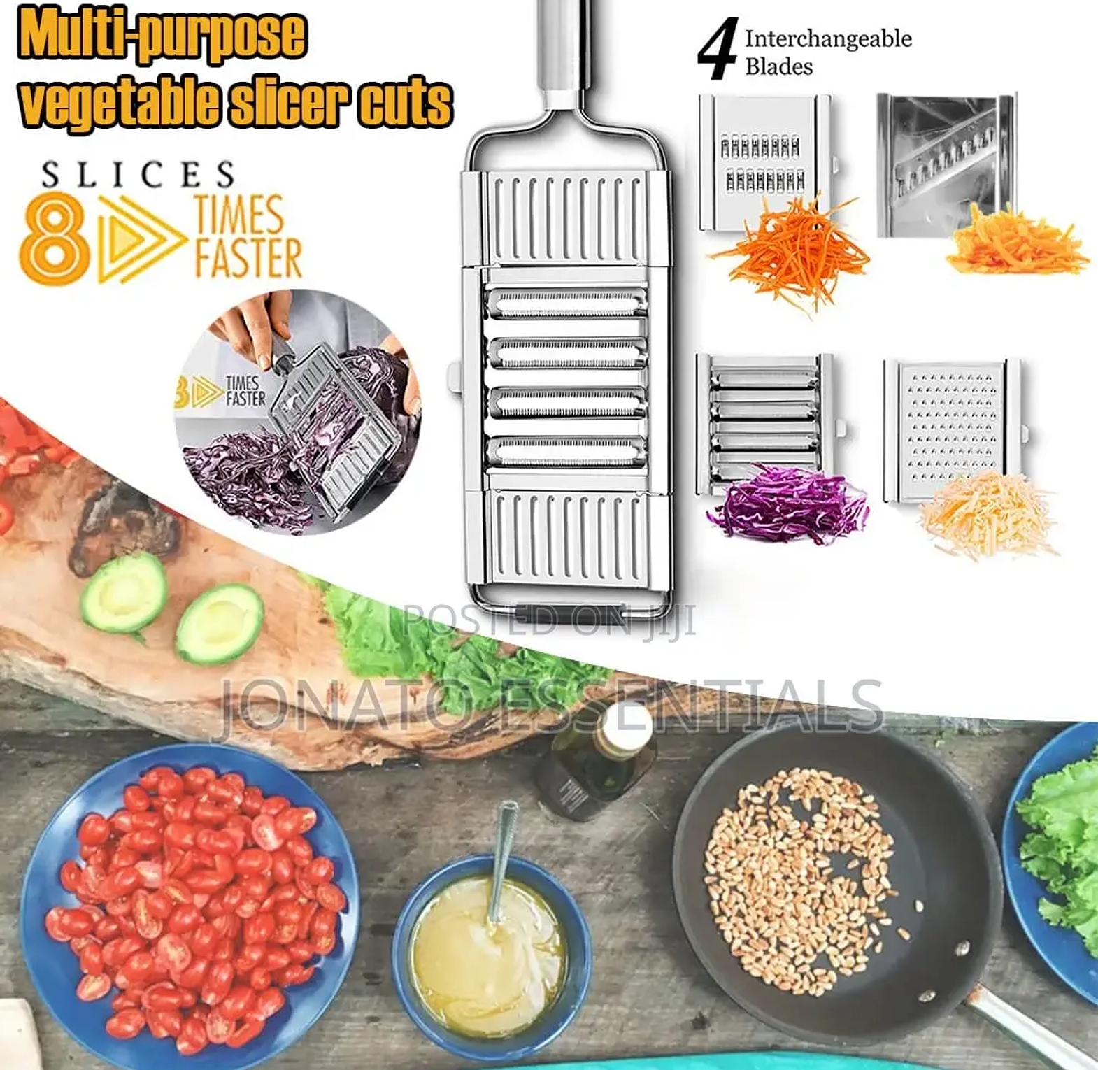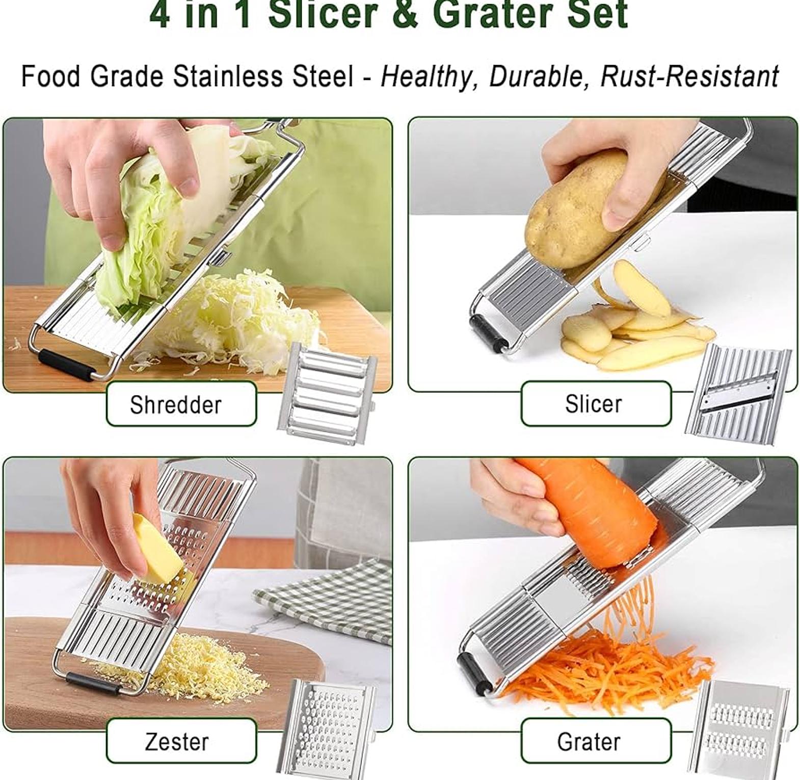 4 in 1 vegetables slicer, chopper and grater new generation stainless steel multiple grater with 4 interchangeable blades. work on most fruits and vegetables, for slicing, shredding, peeling, such as ginger, citrus or garlic... 4 in 1 vegetable slicer multi-purpose grater cutter peeler for fruits potato peeler carrot grater vegetables kitchen accessories.