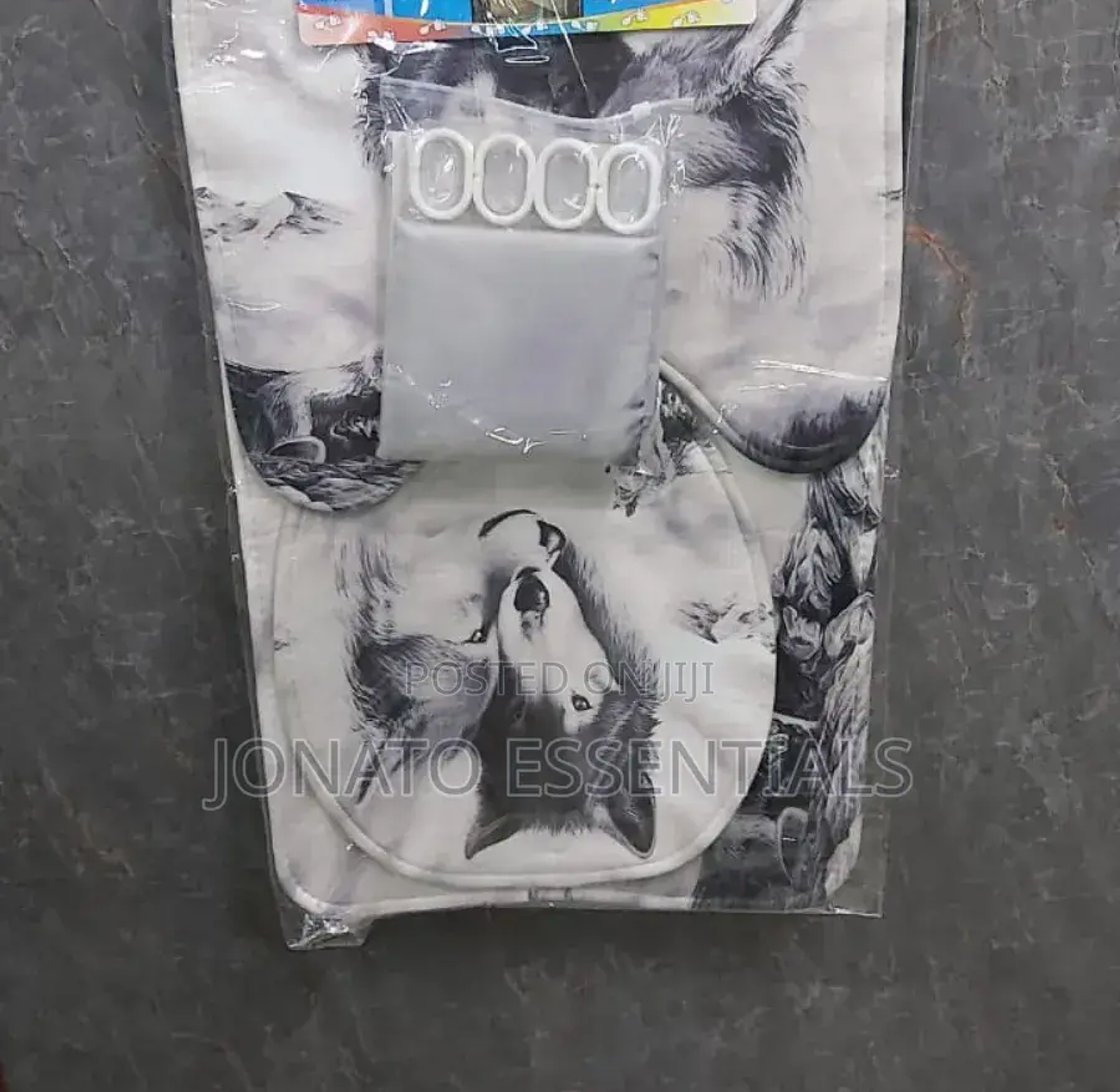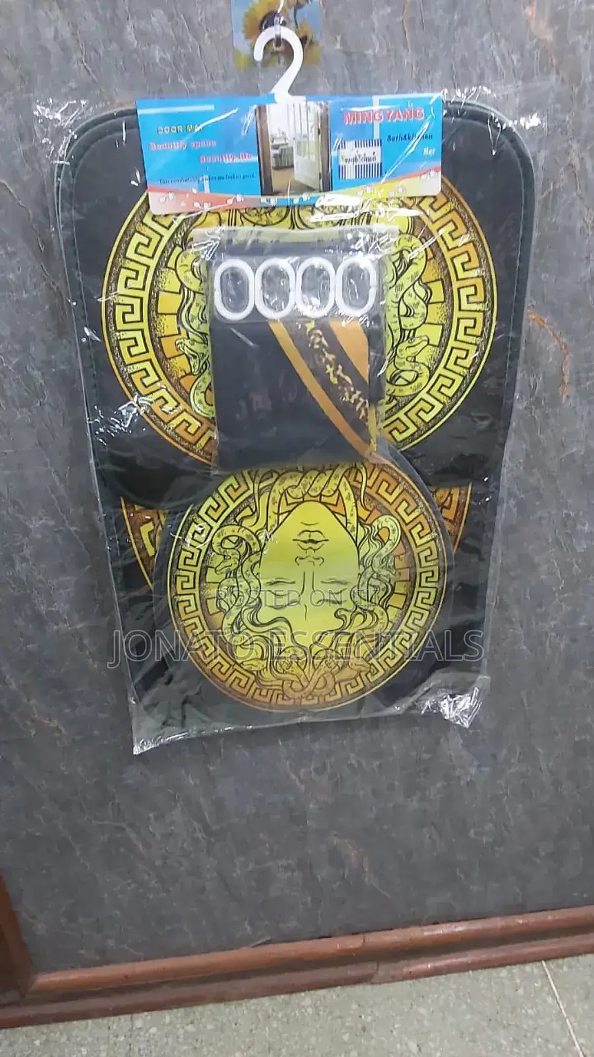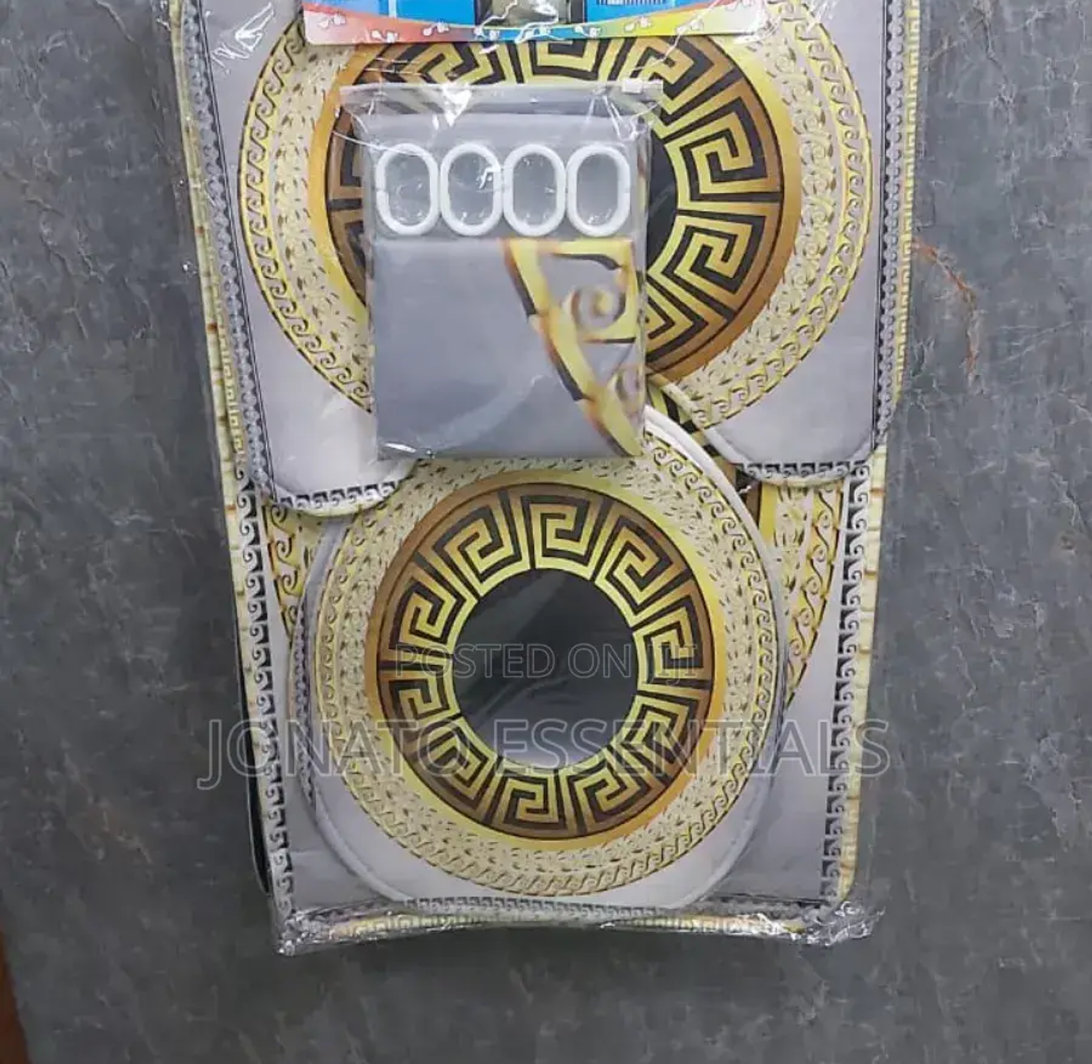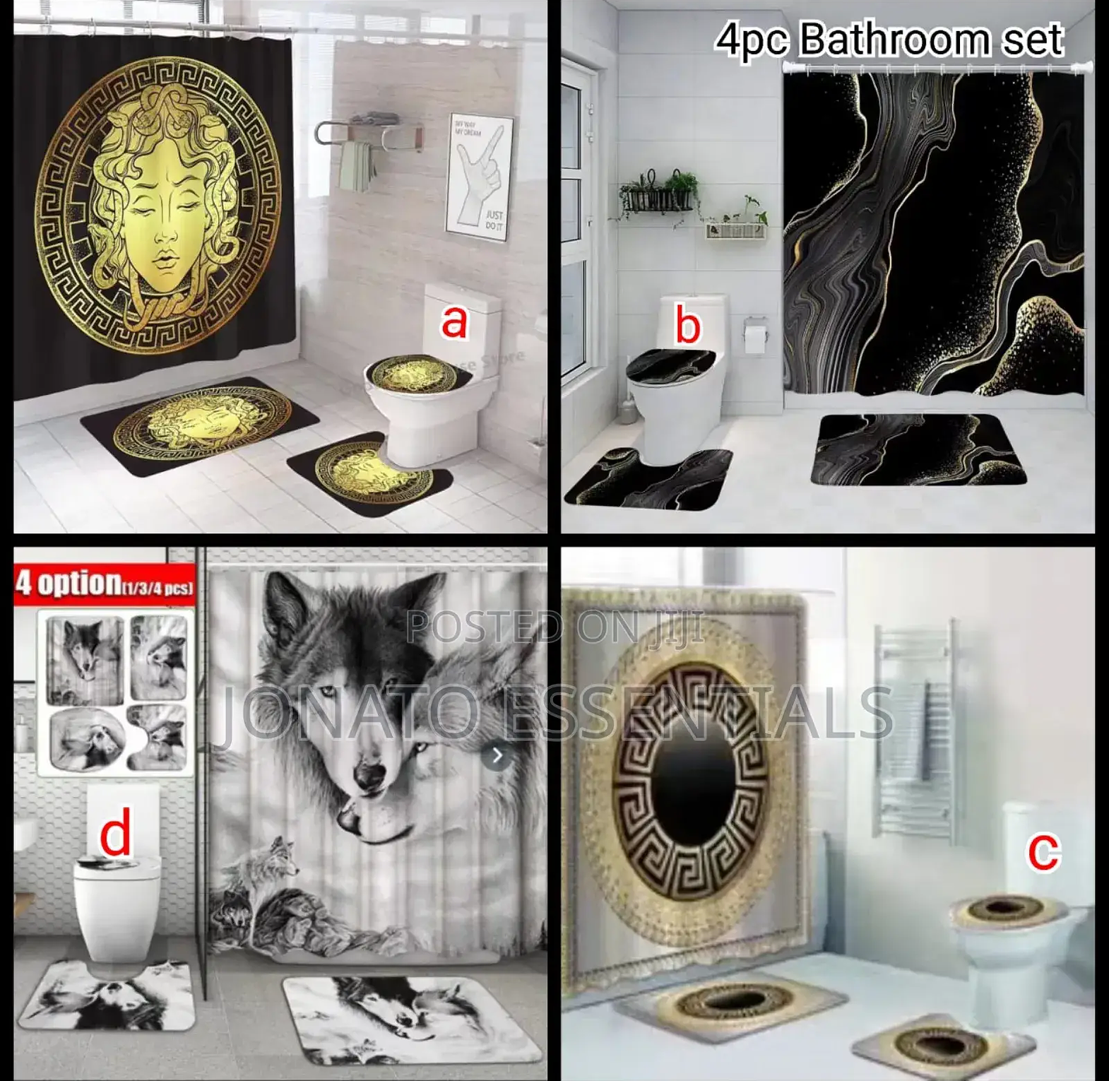 4 piece bathroom and toilet set, shower curtain, toilet seat 4 pcs bathroom set. waterproof home 3d prints. high quality and beautiful shower curtain with realistic printing. eye-catching bright and stylish prints. sizes: shower curtain 180*180cm bathroom mat 75*45cm u shape 45*38cm lid cover 45*35cm package includes: 1pc shower curtain with 12 hooks 1pc pedestal mat 1pc lid toilet cover 1pc bath mat.