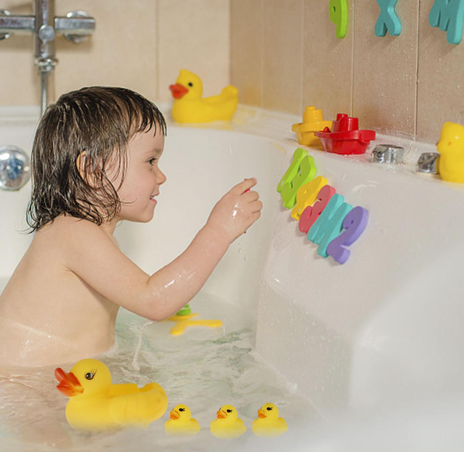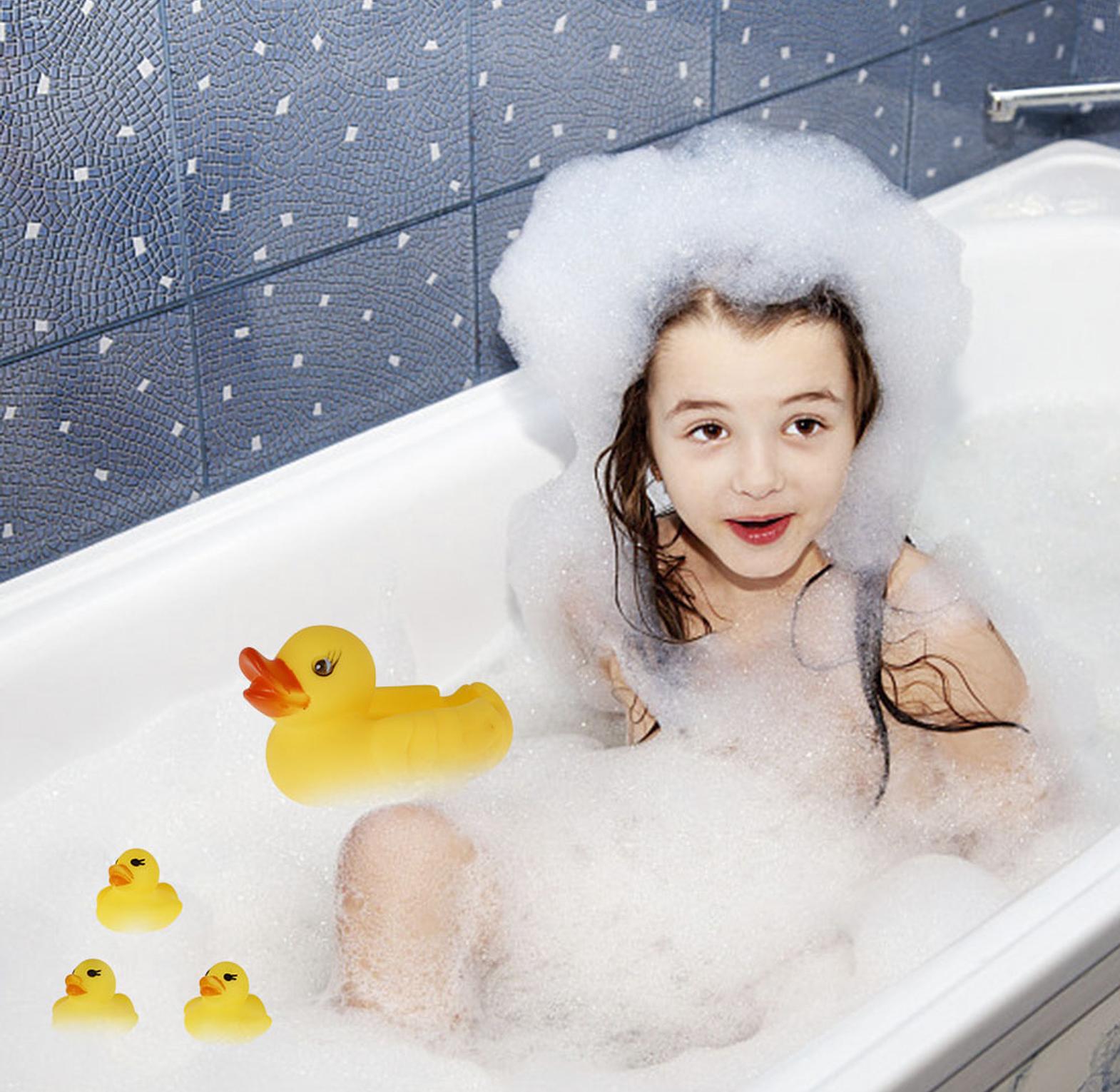 4 piece kids bath toys used to entice or keep the baby busy while bathing. these float upright. bath toy swimming water duck cute soft rubber float ducks squeeze sound play game bath toys gifts for children kids baby