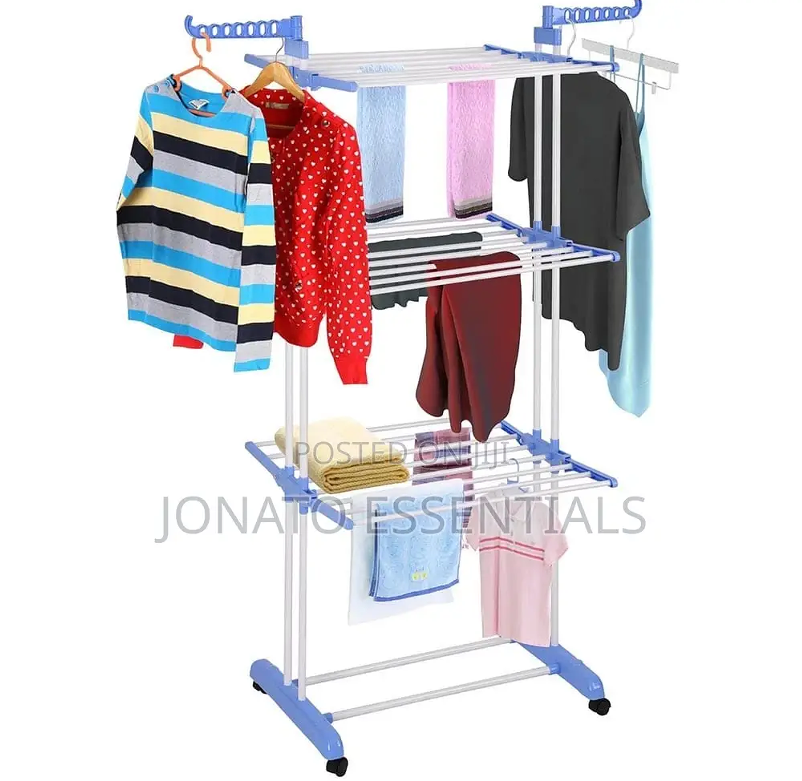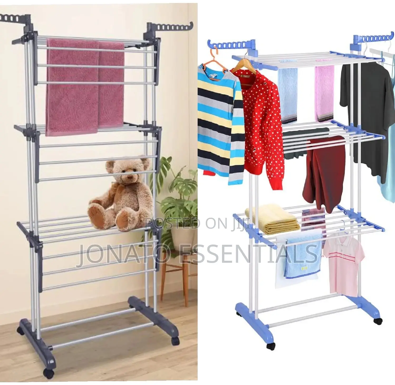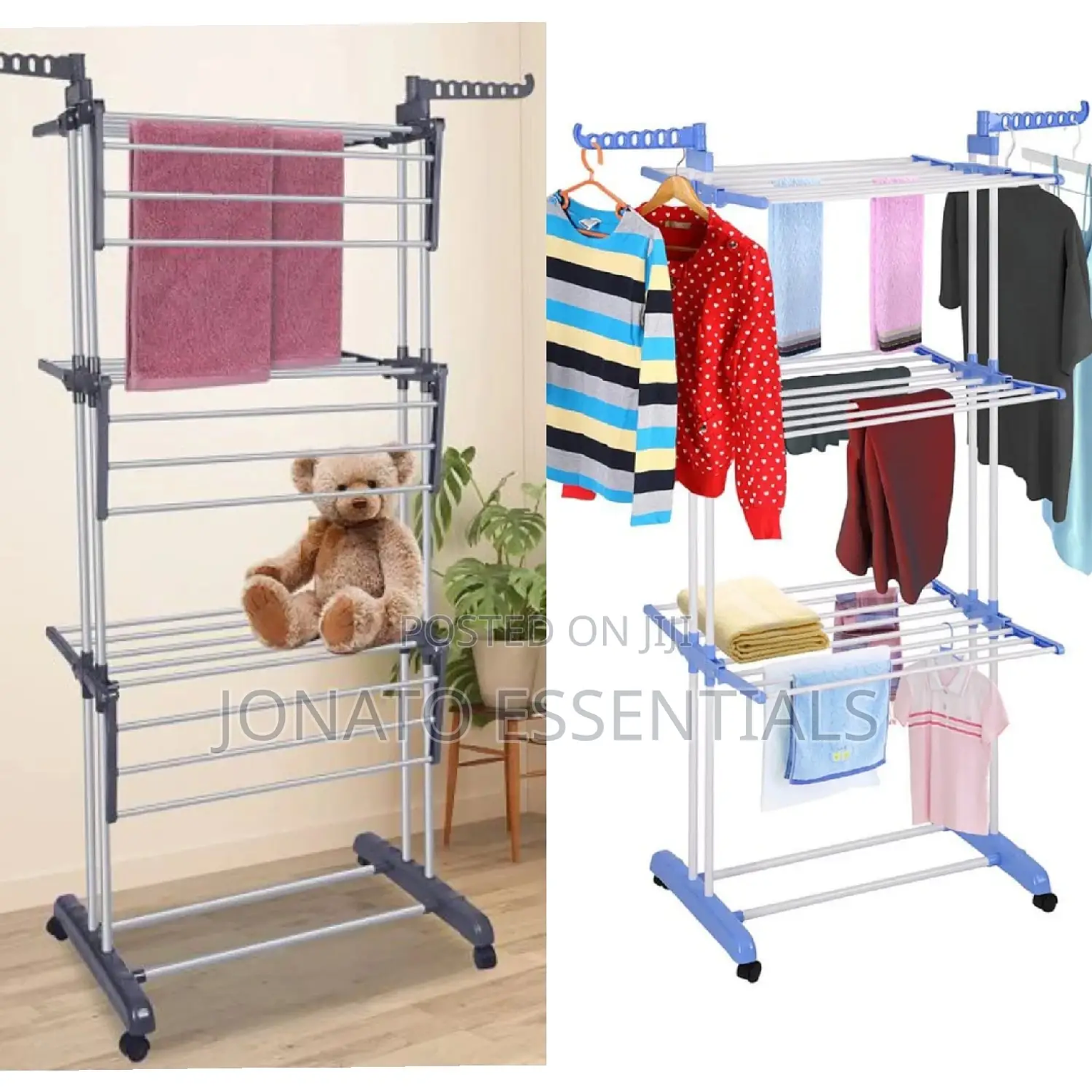 upgrade your laundry routine with this portable, multi-tier clothes drying rack. it is a space-saving solution for any home, perfect for apartments, balconies, and small spaces in kenya. the durable, rust-proof design features multiple hanging tiers for maximum capacity and has a garment hanging rail. with its smooth-rolling wheels and easy-to-fold structure, you can conveniently move it indoors or outdoors and store it away effortlessly. say goodbye to bulky clotheslines and simplify your life today.