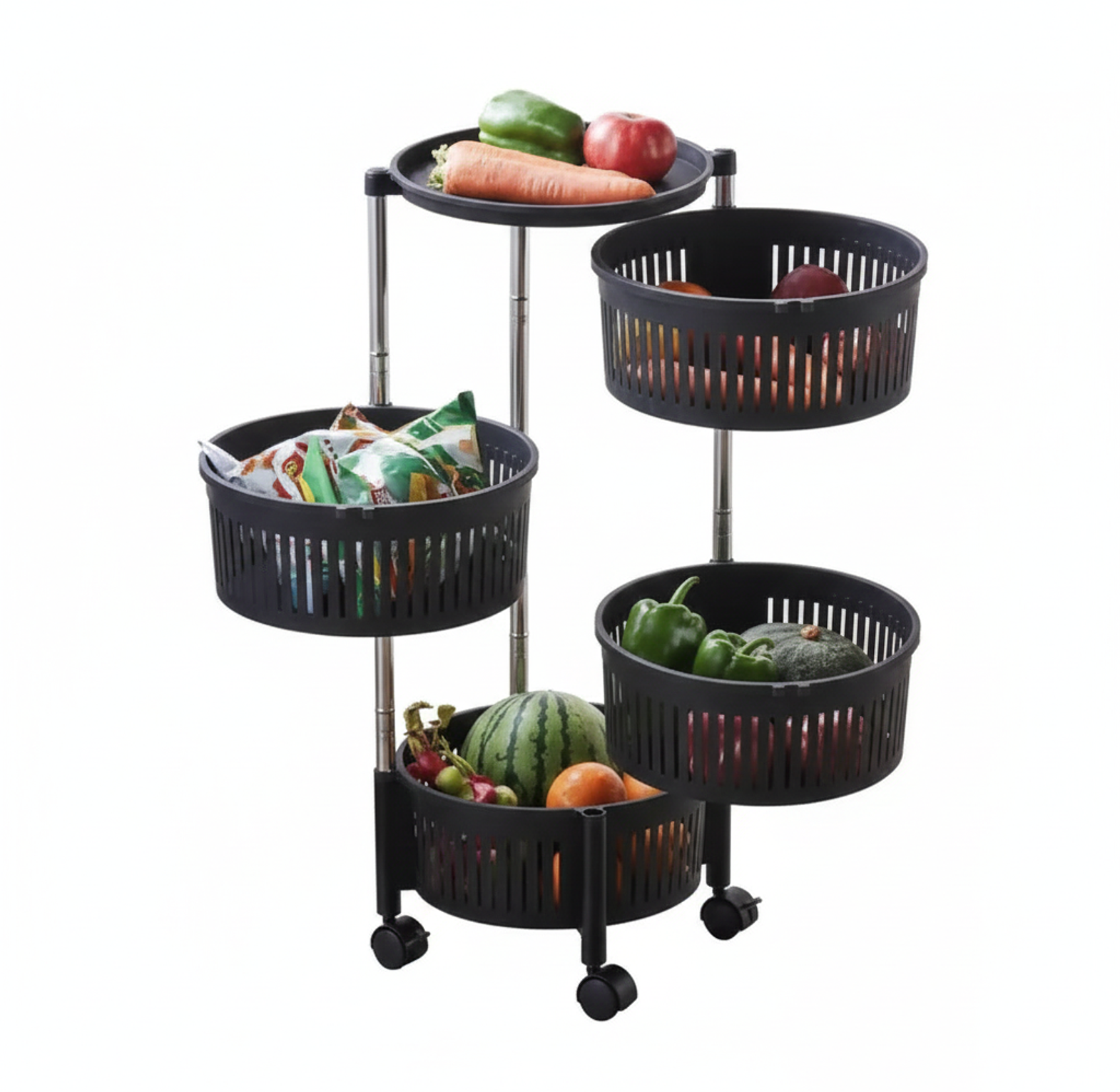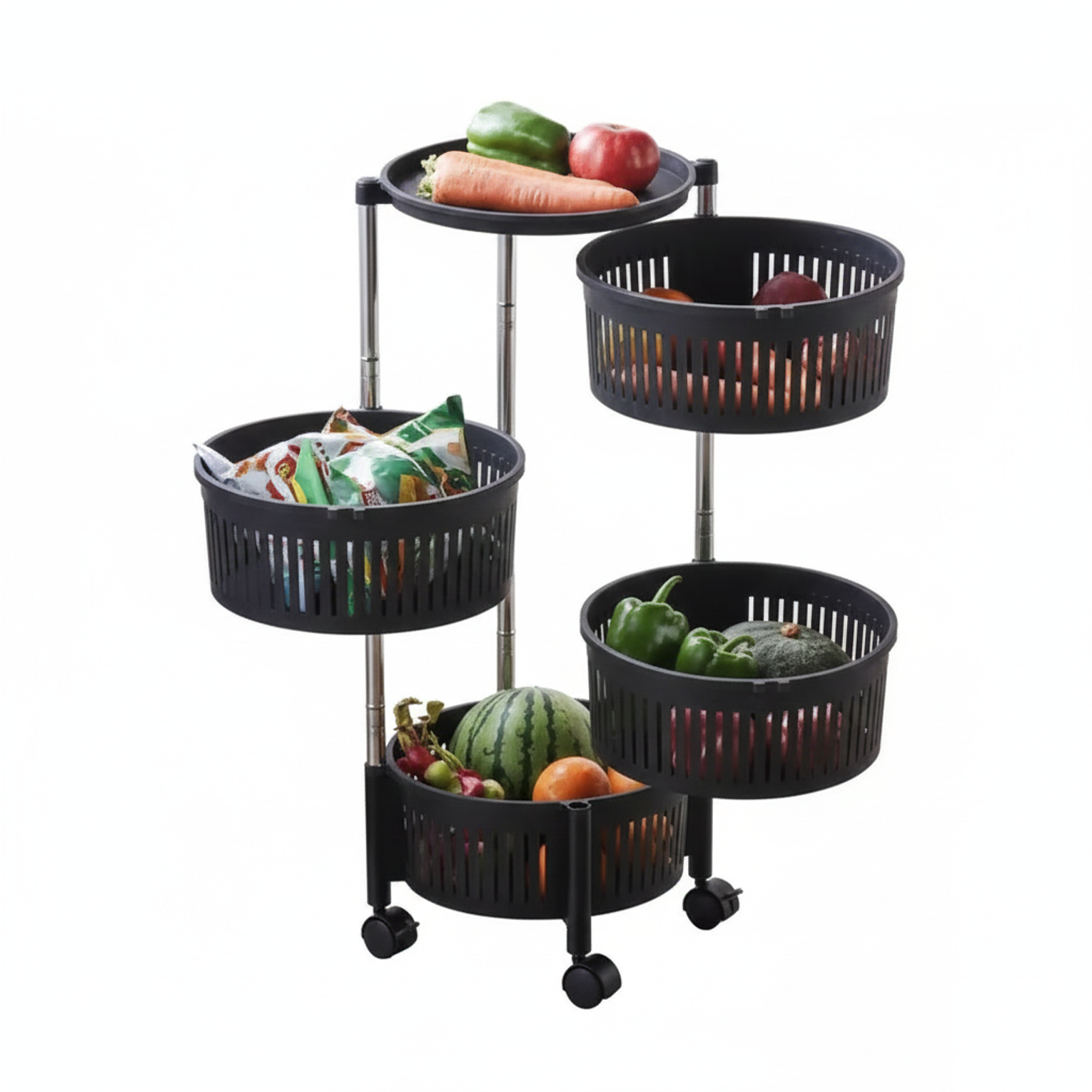 4-tier rotating kitchen storage cart with wheels - multifunctional vegetable fruit basket organizer & trolley round fruit rack plastic with metallic stands optimize your space with this versatile 4-tier rotating storage rack, perfect for kitchens, pantries, bathrooms, or offices. featuring durable, rotatable baskets, this mobile trolley offers ample storage for fruits, vegetables, snacks, condiments, toiletries, or office supplies. its smooth-rolling wheels provide easy mobility, while the sturdy design ensures stability. maximize your vertical storage and keep your home organized and clutter-free. ideal as a kitchen island cart, rolling utility cart, or produce storage solution. a must-have for efficient space utilization and convenient access to your essentials.