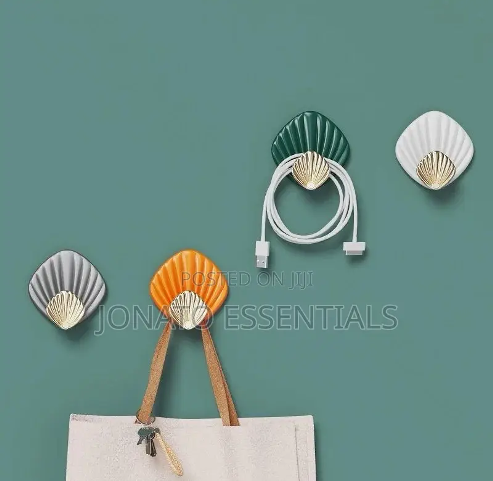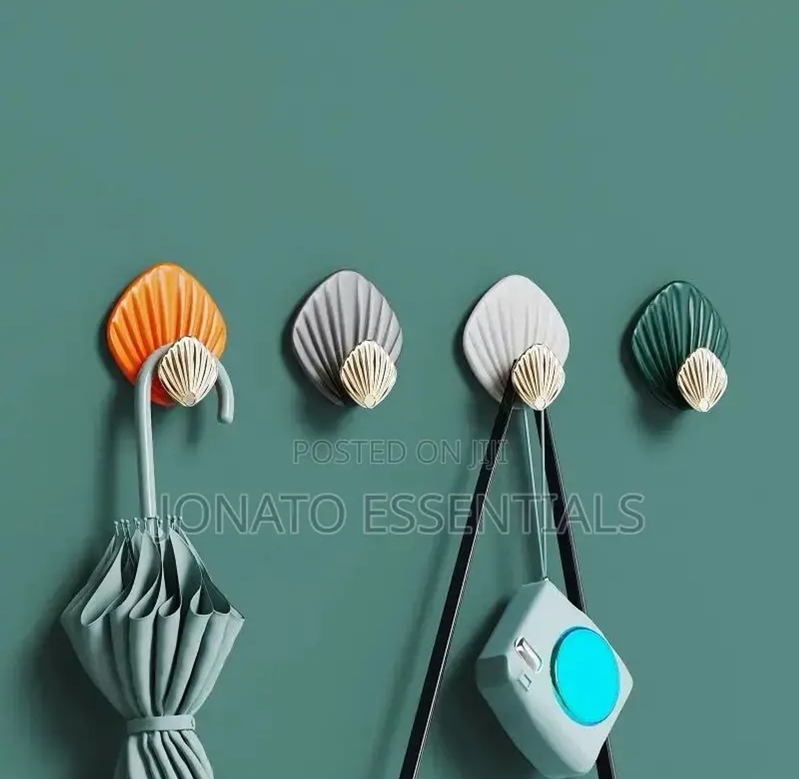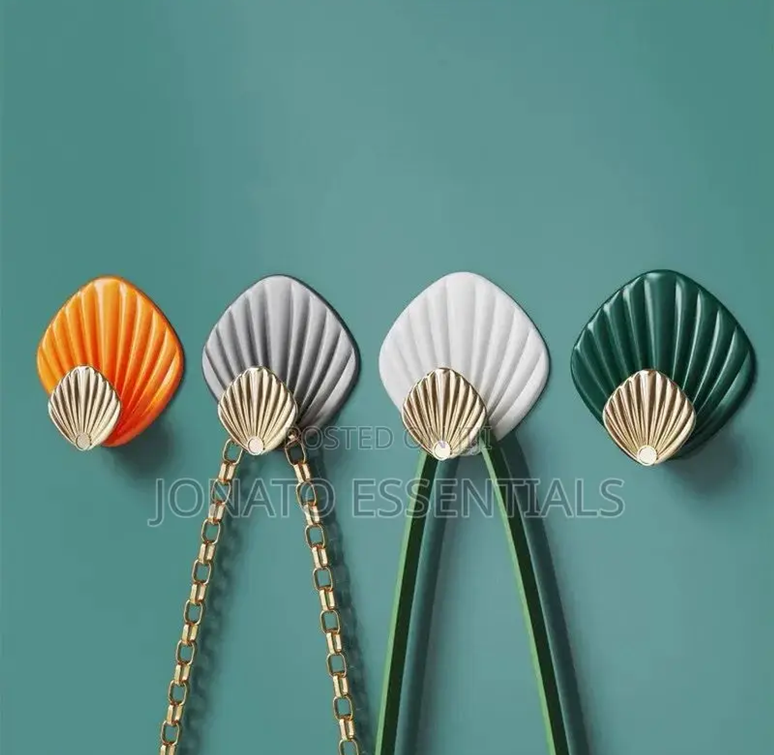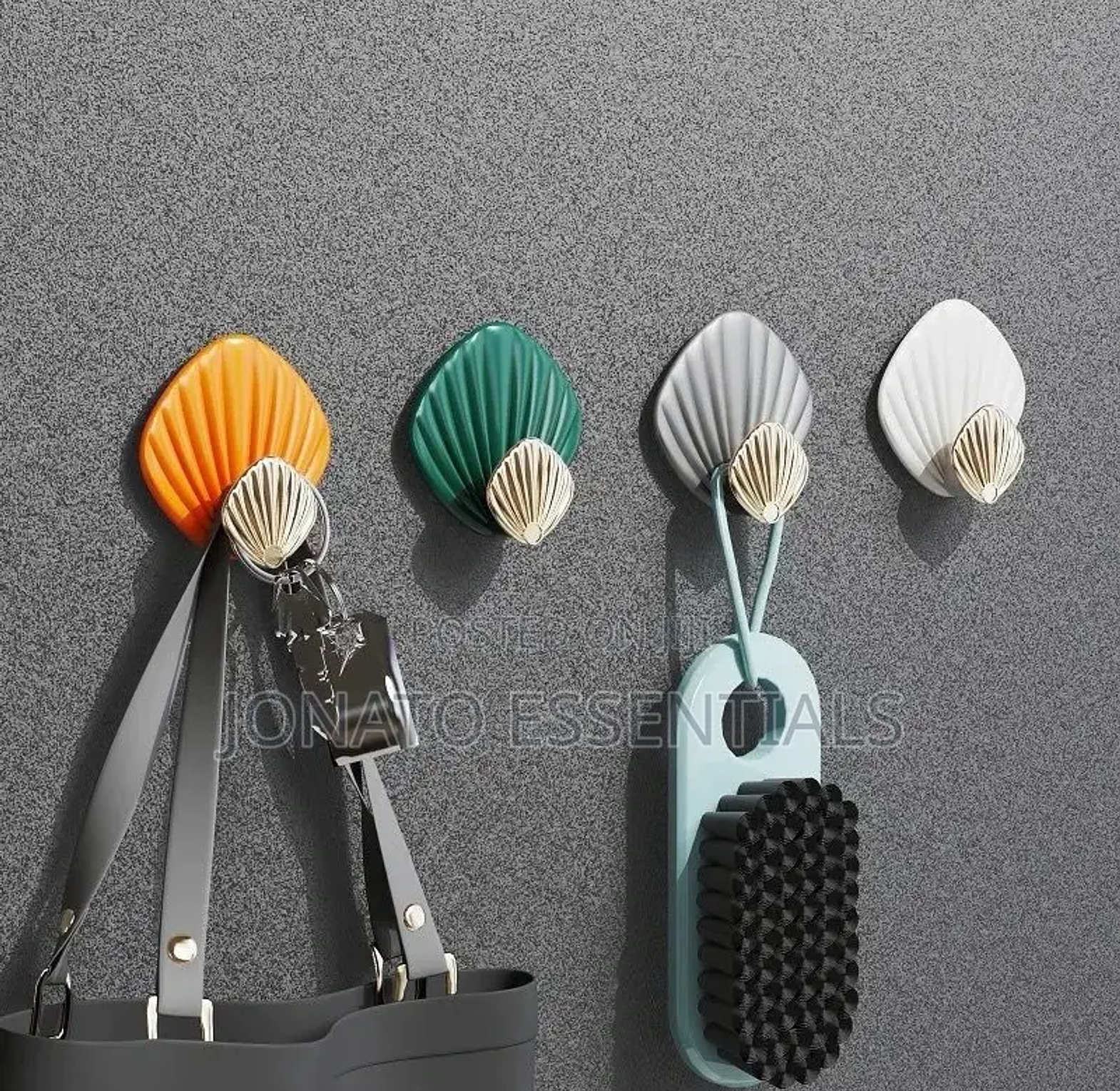 4pc shell shaped wall hanging hooks 4pcs creative shell shape wall hanging hook the corners are round and smooth, without hurting the clothes hooks hold various items securely four different colors, showing different styles no complicated drilling installation, stick on the wall light luxury metal texture,simple shell fashion waterproof and moisture-proof 4pcs creative shell shape wall hanging hook punch-free strong adhesive hook bathroom kitchen wall-mounted seamless sticky hook