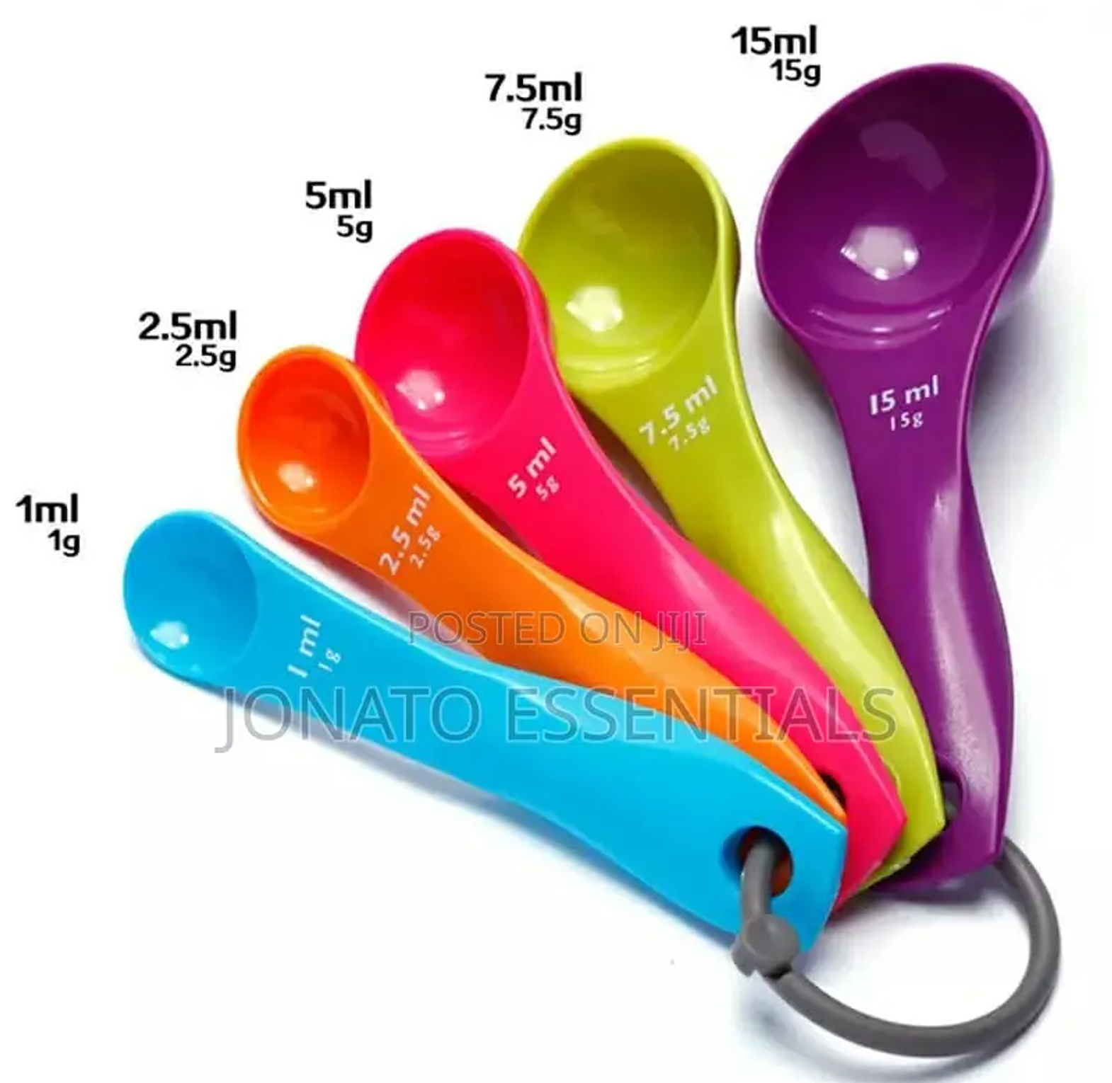 Measuring spoons 5pcs colourful measuring/seasoning spoons set material:plastic bpa free 100% brand new and high quality this item is sure to brighten any kitchen. five pieces measuring spoons are great tools for using when following any recipe in the kitchen. 5pc salt oil spoon lovely kitchen colour works measuring spoons spoon cup baking utensil set kit 1ml 2.5ml 5ml 7.5ml 15ml.
