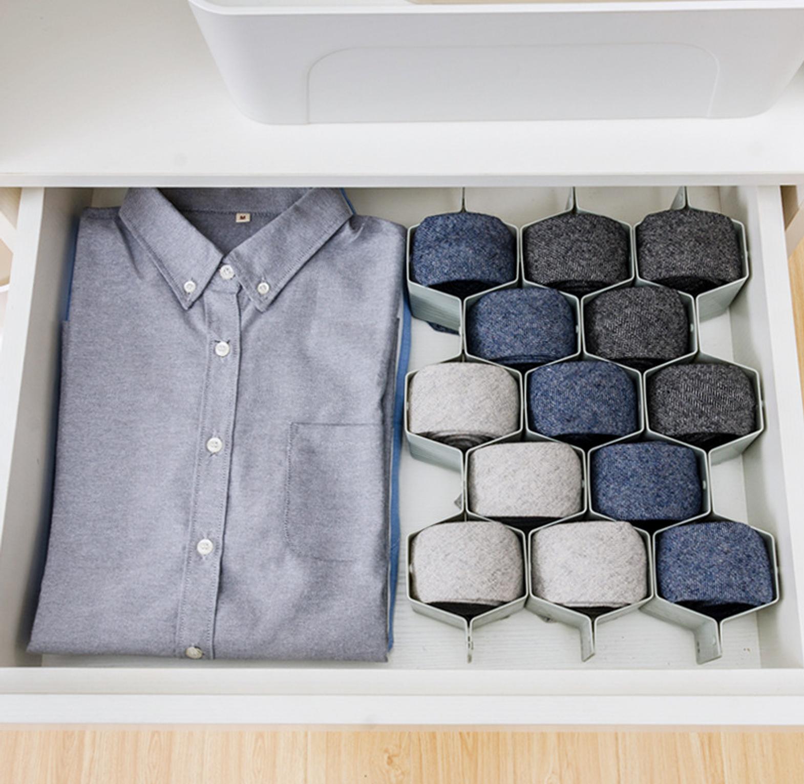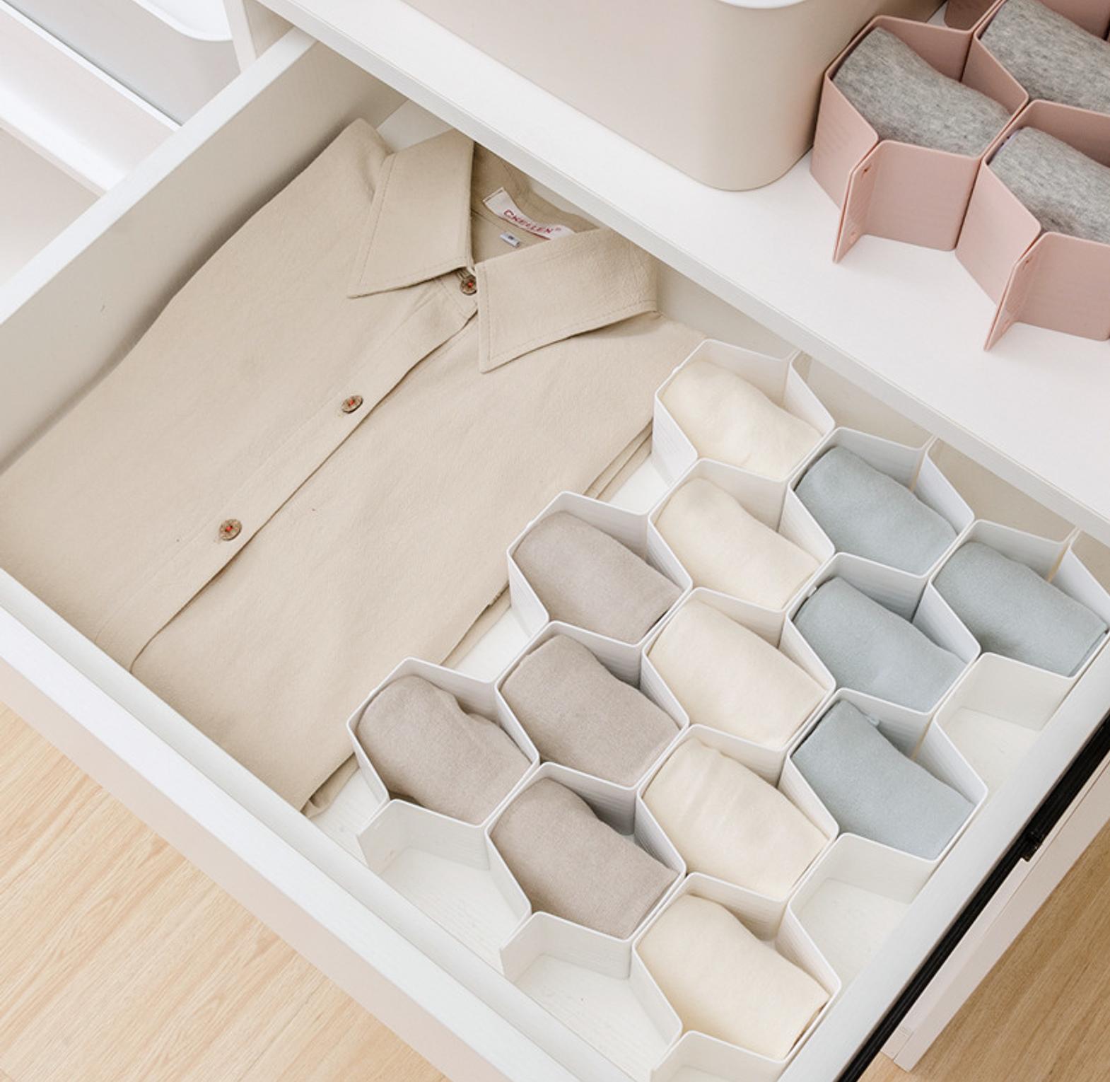 8 piece honeycomb drawer underwear socks organizer you can use this drawer partition to sort all kinds of items and keep the drawers clean. this product is made of lightweight plastic material, which is easy to install and easy to disassemble. it is easy to divide the space and maximize the isolation area by the occlusion method. the unique honeycombs shape is novel and stable, and can be used as drawer decoration to improve the quality of life. 8pc adjustable drawer organizer honeycombs clapboard divider separator diy drawer divider underwear socks organizer.