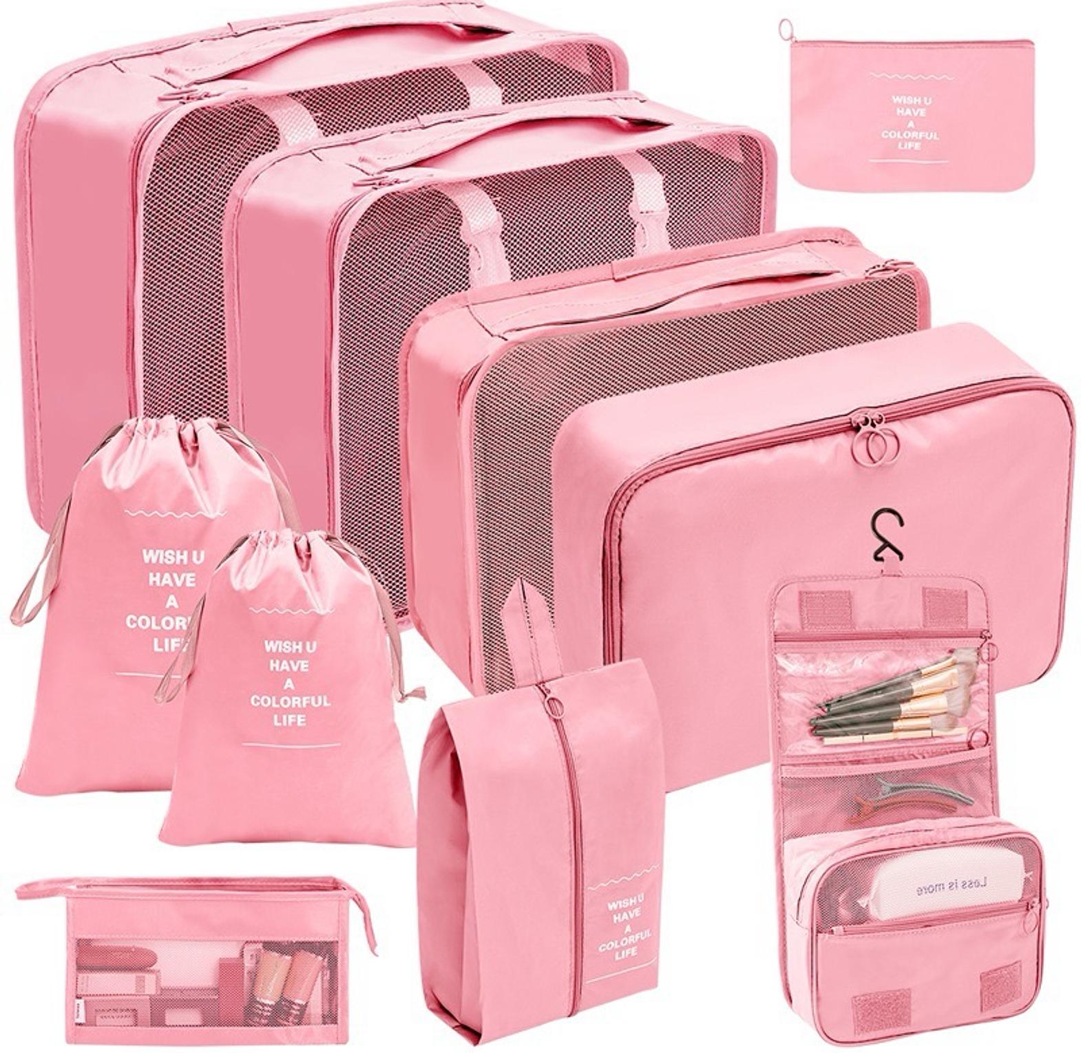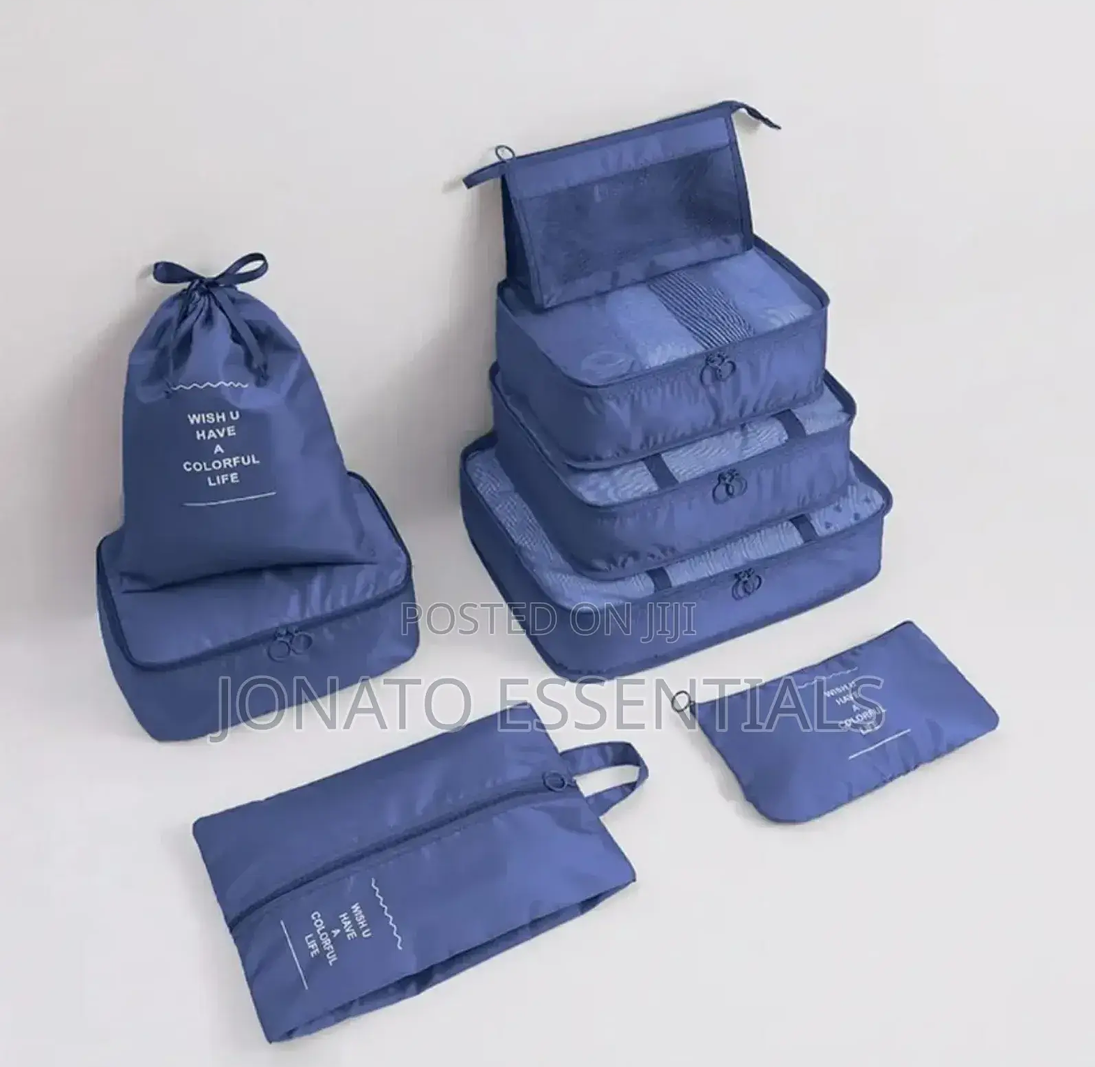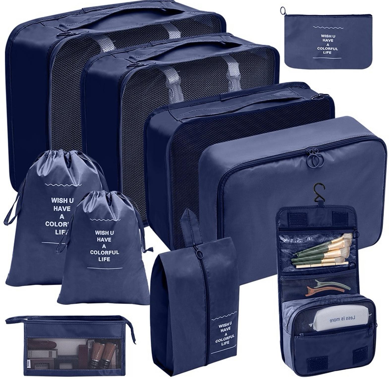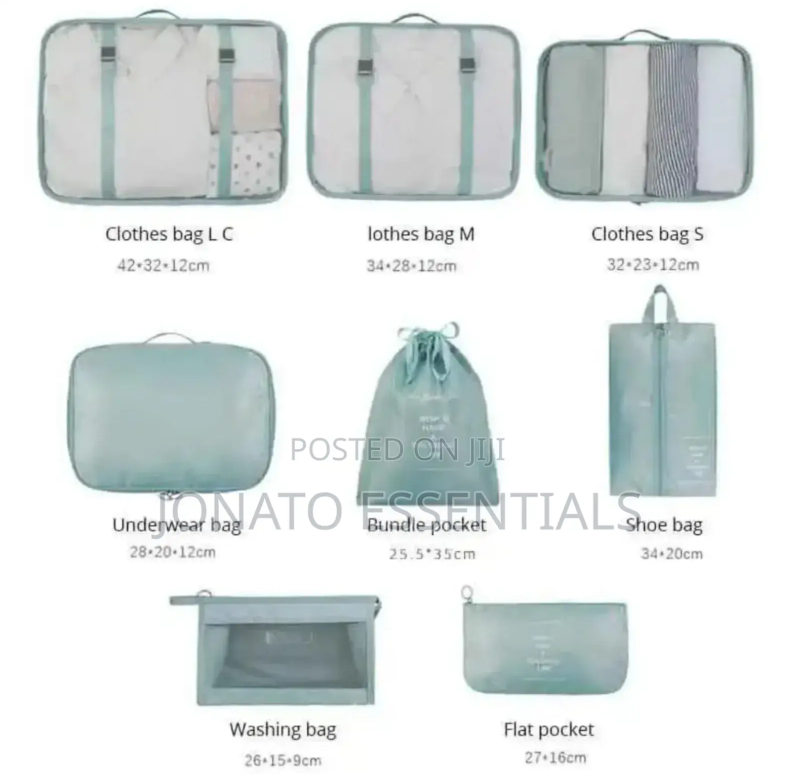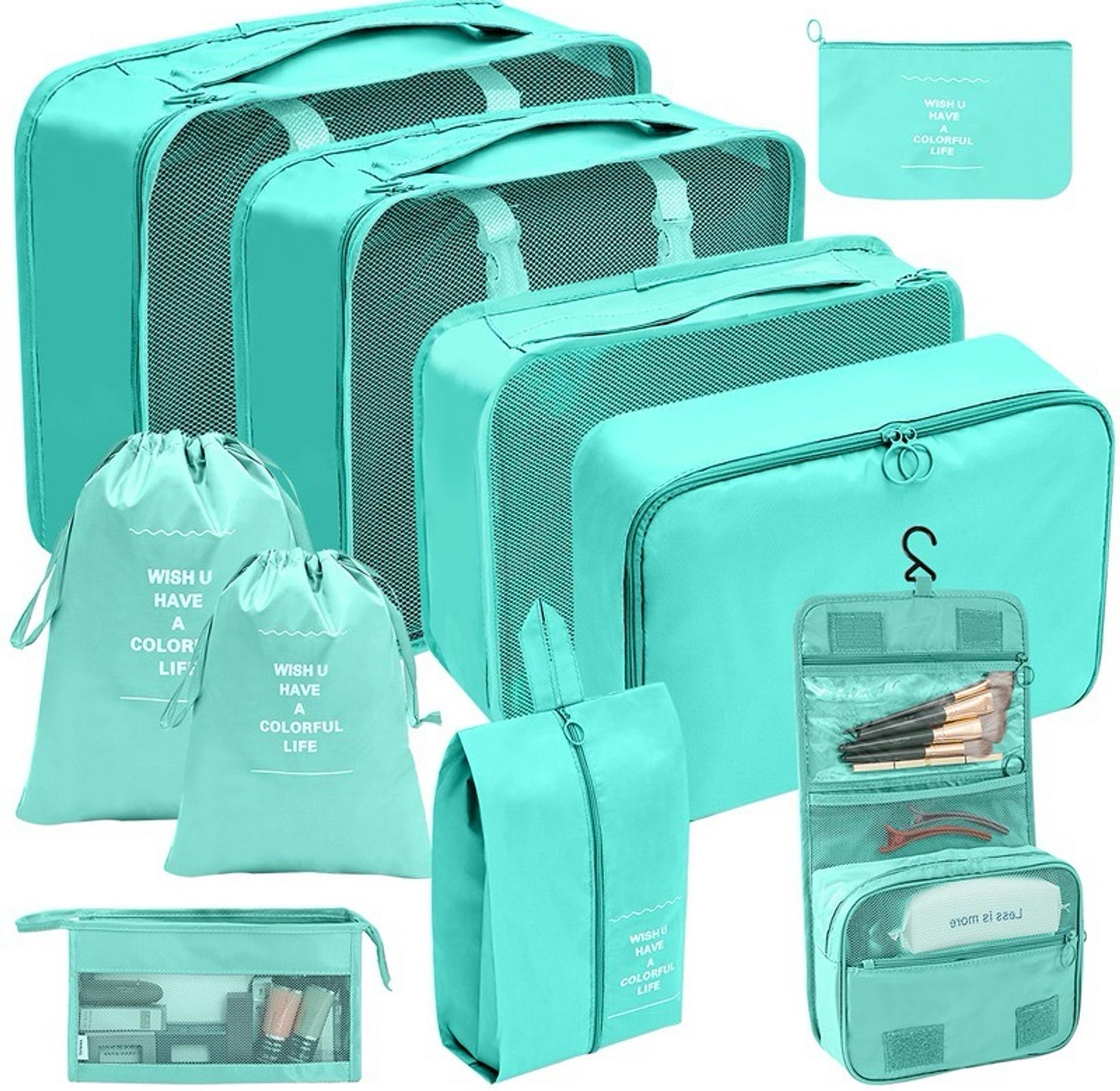8pcs luggage travel organizers for suitcase with toiletry case 8-pc set includes: 1 large & 2 medium cubes, 2 small cubes, 2 accessory bags, 1 laundry/shoe bag. versatile use :ideal for storing cosmetics, wash items, or any small items that need organized storage. practical and beautiful. speed up packing and classify your goods. made of oxford material with breathable mesh. heavy duty design with double zips makes it easy to open and close travel storage bag set eight-piece cosmetic toiletry classification bag suitcase organizer pouches durable polyester fabric.