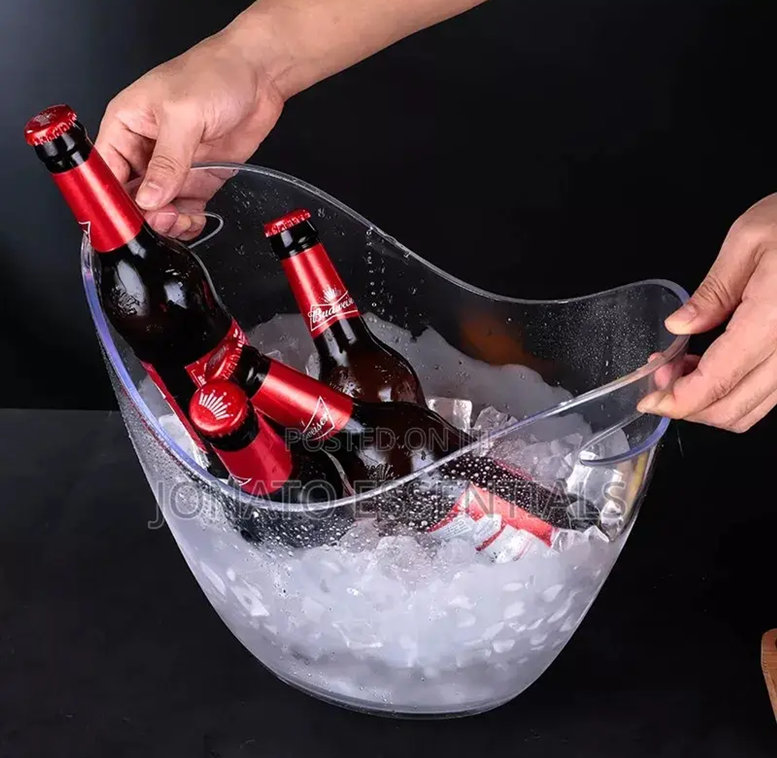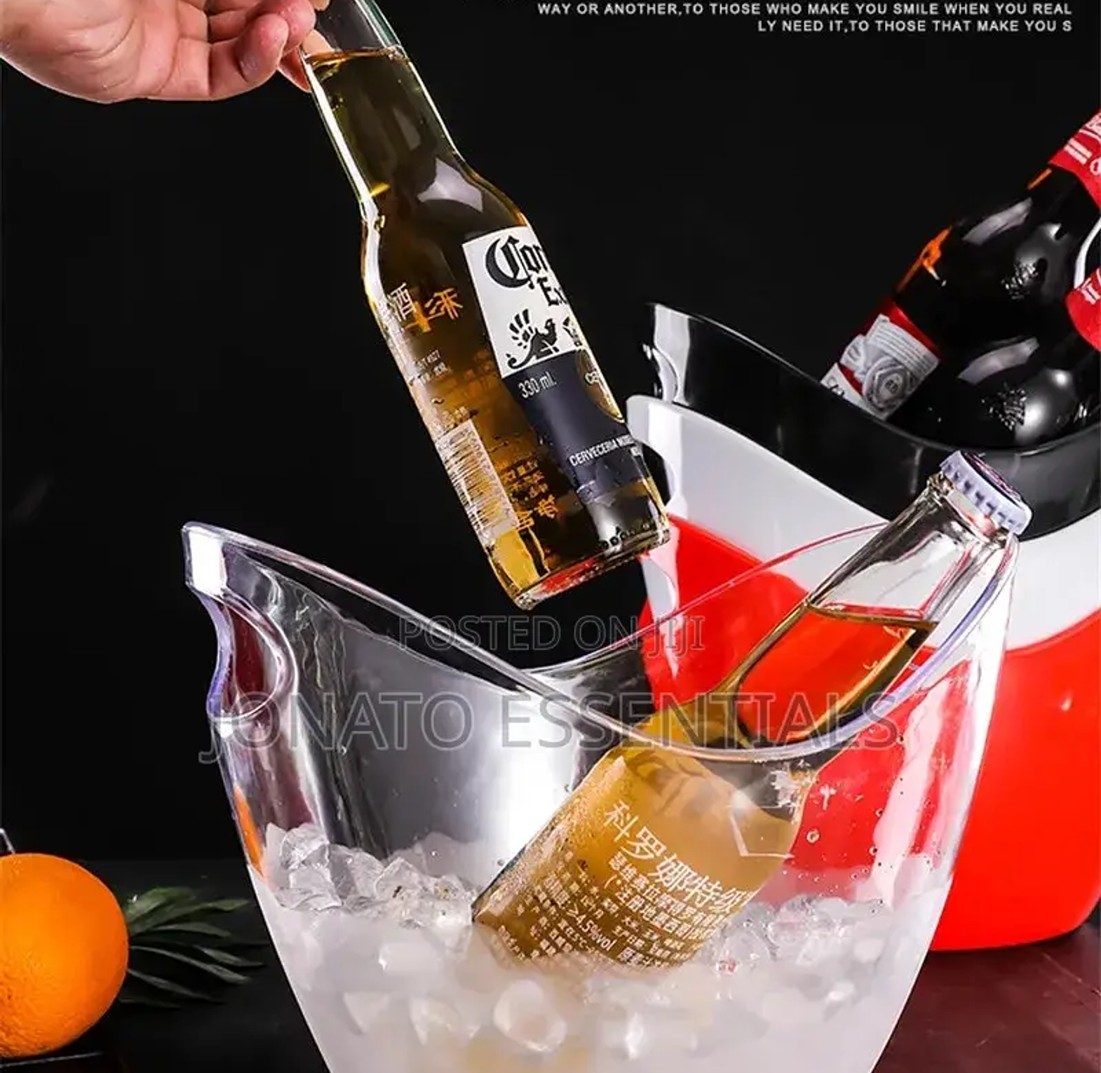 champagne beer,water,soda ice bucket in black ,red and white.material:;- acrylic. plastic large oval pail cooler