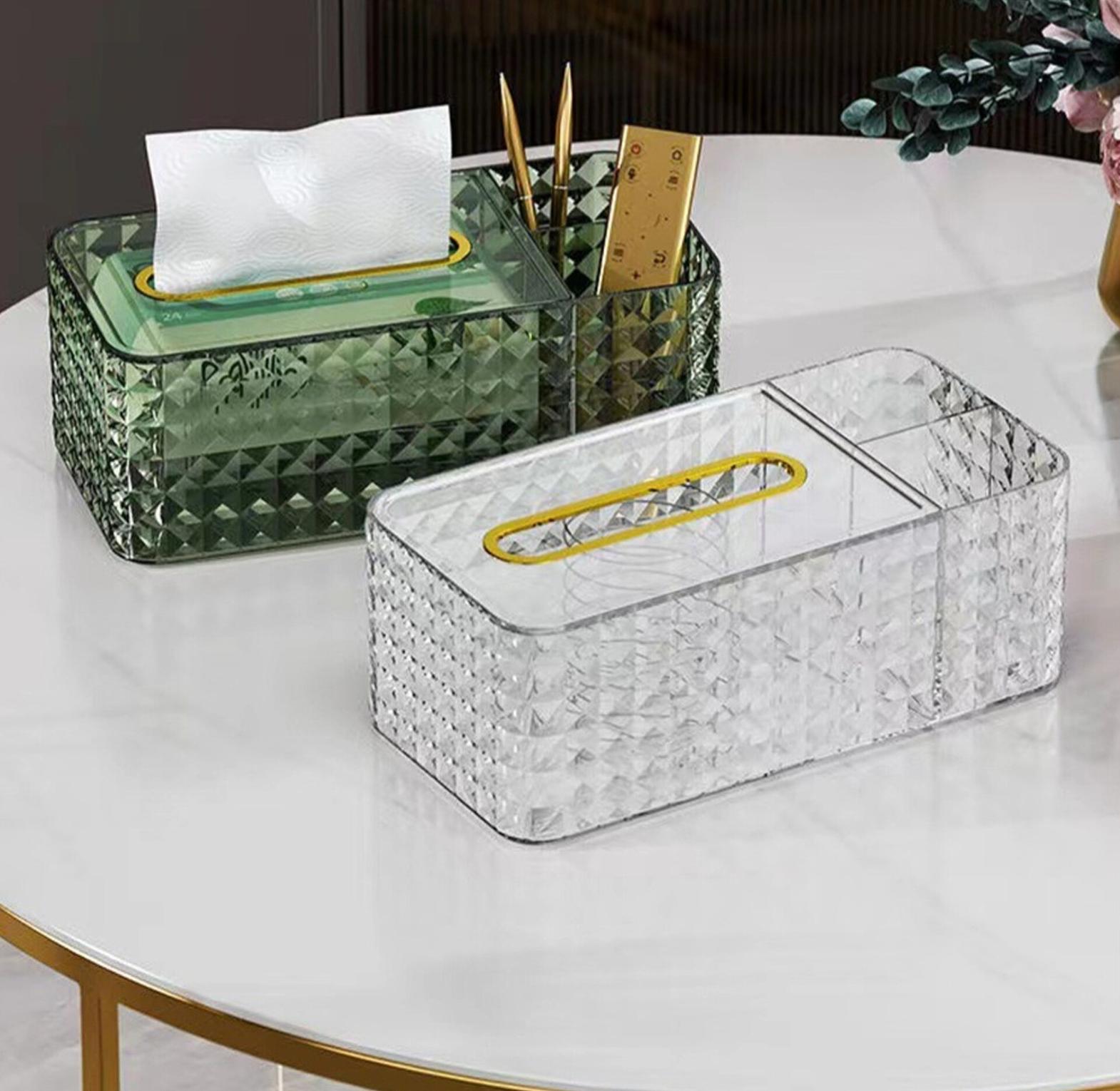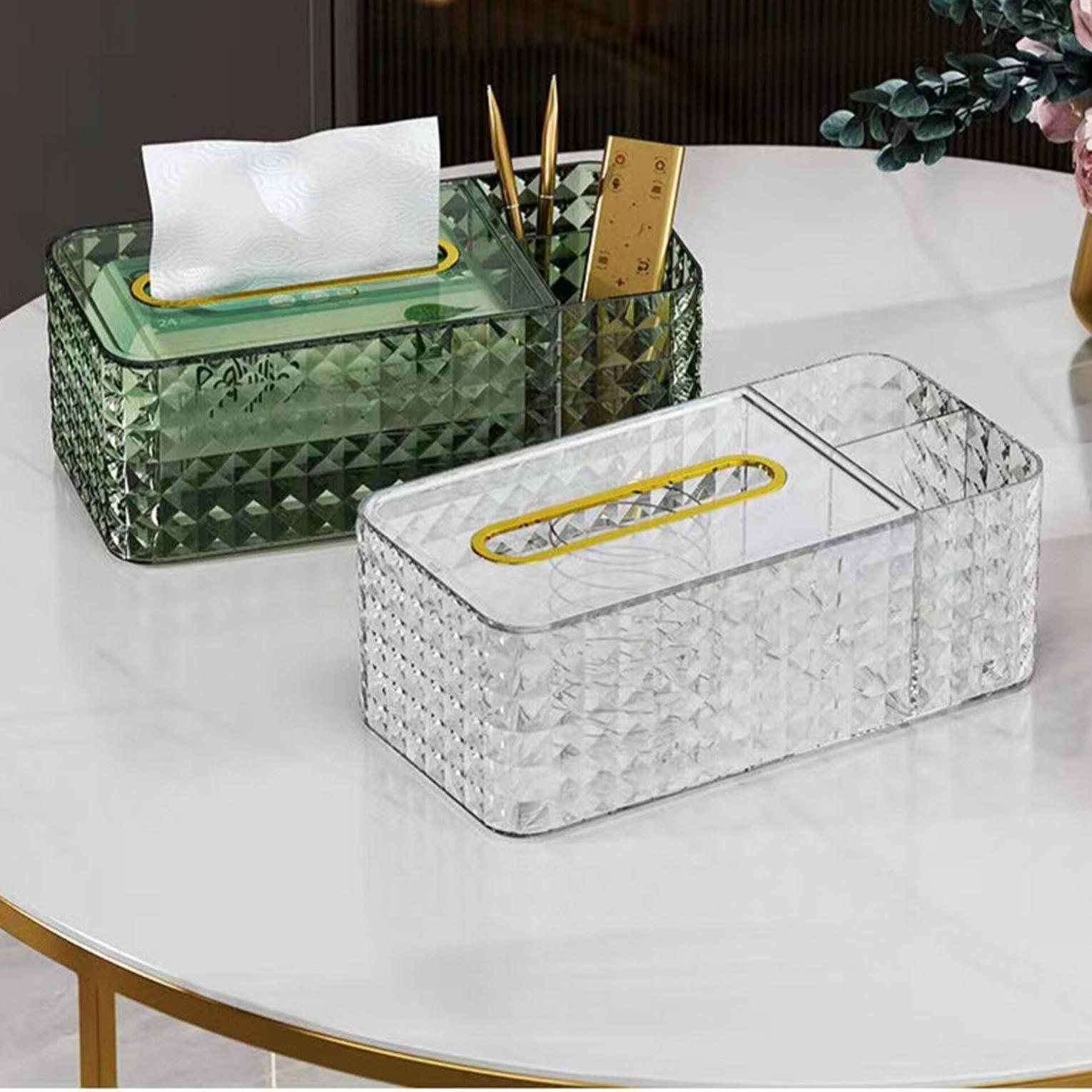 Acrylic serviet holder, serviette holder and organizer 3 in 1 acrylic tissue/saviette holder designed with a wide opening, the extraction of the tissue box is smooth without jamming, giving you an excellent user experience. the storage box adopts multi-grid design, which can be used not only to store tissue, but also be used to store remote control, mobile phone and other small items. napkin box is made of high-quality pet material. the length of this product is 24cm, the width is 12cm and the height is 9cm. it is suitable for home, office, living room, bedroom or school, etc. napkin holder transparent visible large capacity sarviette tissue box desktop remote control household supplies, organizer.