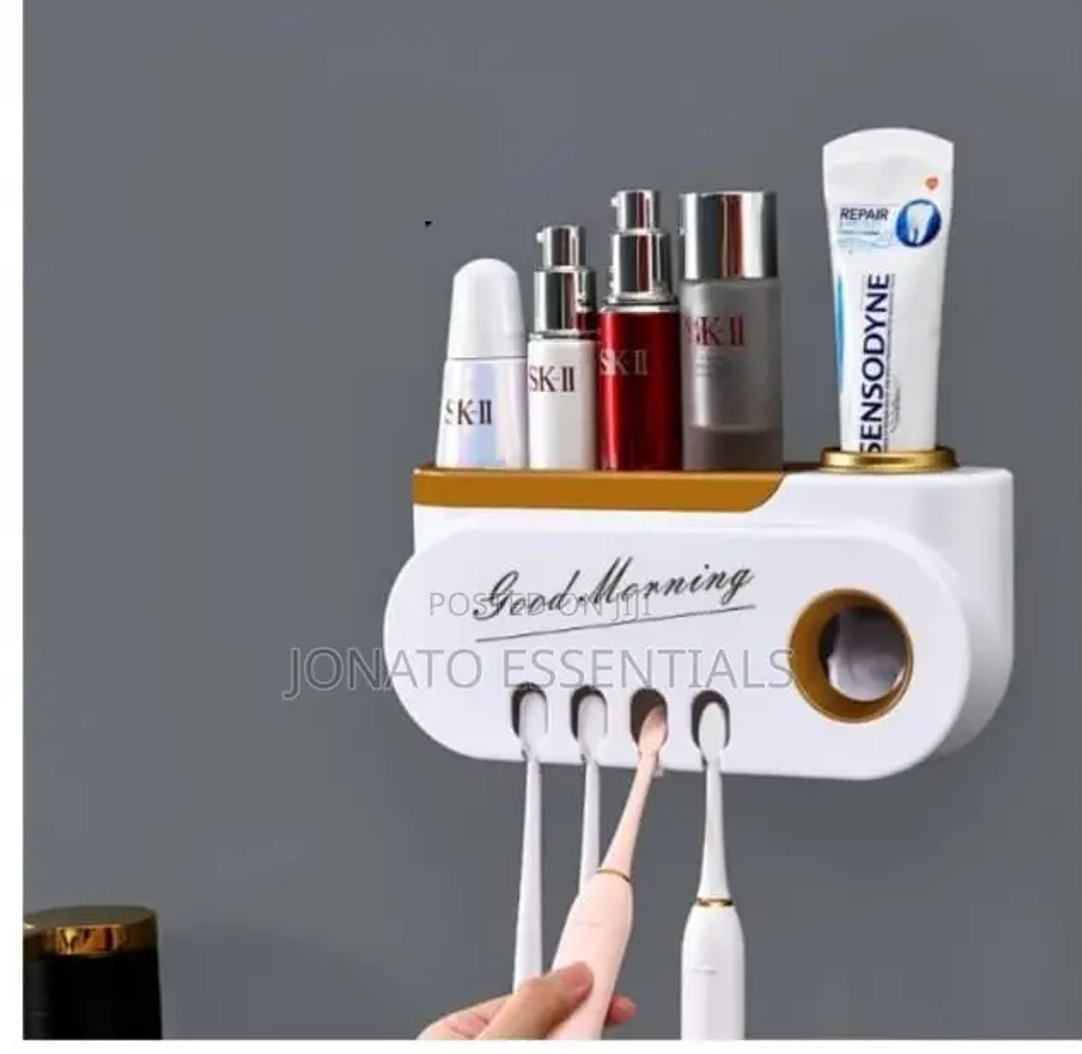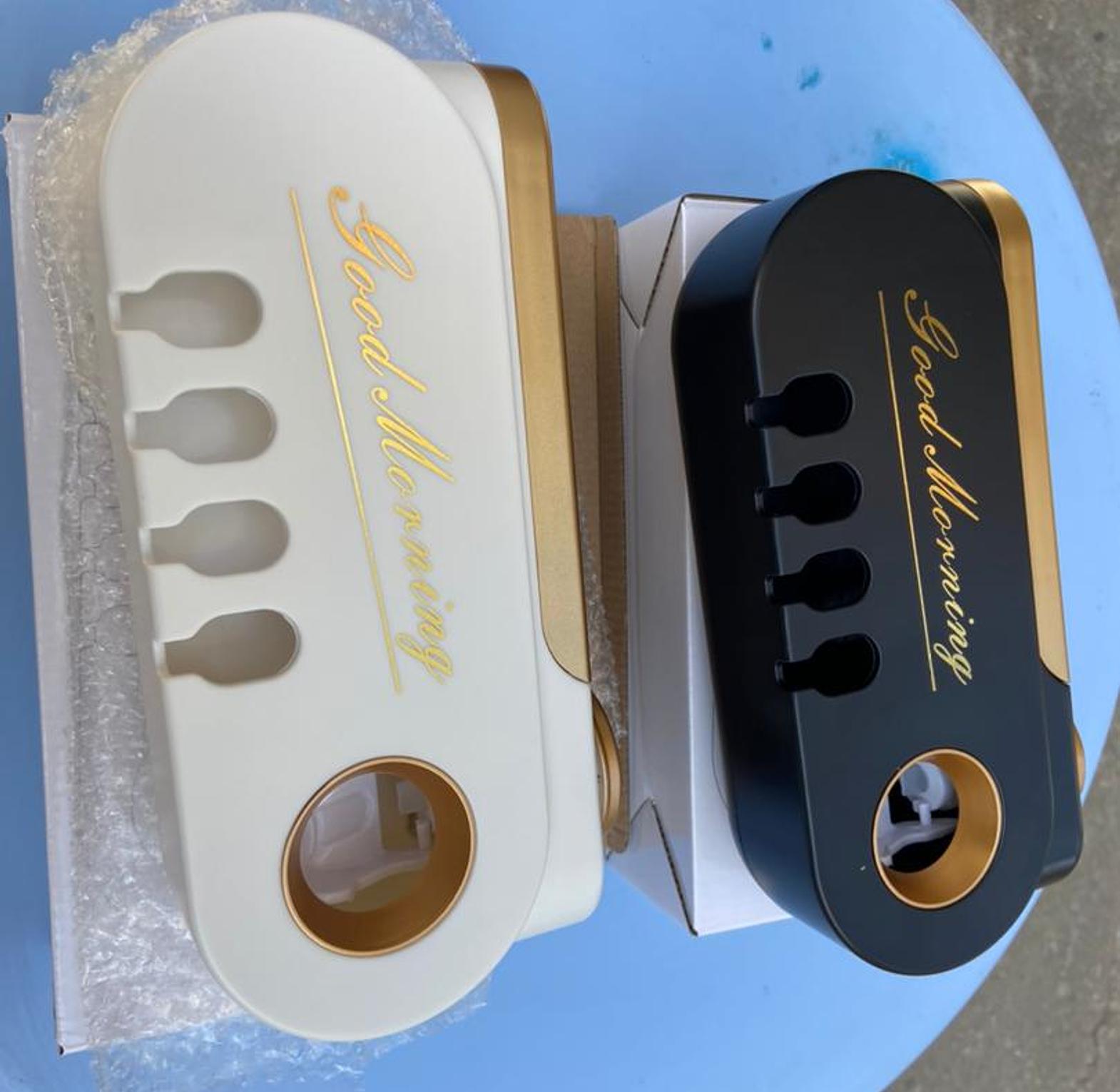 Automatic toothpaste squeezer dispenser toothbrush holder high quality toothbrush holder toothpaste dispenser 1. it can hold 4 toothbrushes, no matter the model, even electric toothbrushes. the scientific toothbrush pendant can protect the toothbrush from contamination. 2. nail-free drilling, simple and convenient installation, no hole installation, no damage to the wall. 3. the storage shelf adopts european-style minimalist style and unique painting process to make your home full of luxury. automatic toothpaste squeezer dispenser toothbrush holder portable makeup storage rack home bathroom accessories.