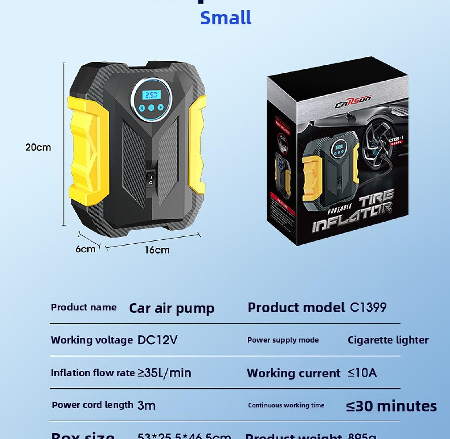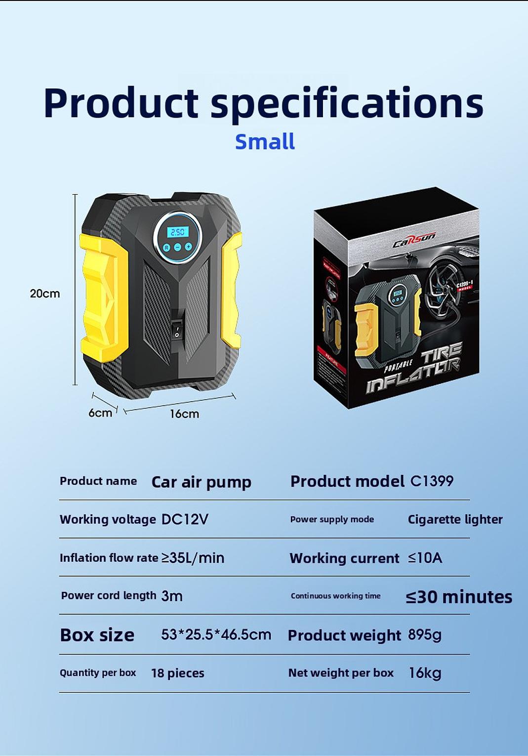 Car air compressor pump, tyre inflator, tire inflator high quality carsun portable tyre inflator c1399-1 powered via 12v car cigar lighter. easy to use inflator pump mainly used for car tyres air compressor. there is a scale to easily know the pressure of the tyre. surface smooth, you can have a good grip touch. digital tire inflator electric tire inflator can make tyres quickly and safely. car air pump scale help you decide whether you need to go ahead or stop . air compressor is portable, lightweight. air pumps for car tyres are suitable for home or outdoor use. portable inflatable pump traditional tire inflator is not efficient and heavy duty. small air pump car tire pump compressor tire inflating tyres air pump for air compressor car.