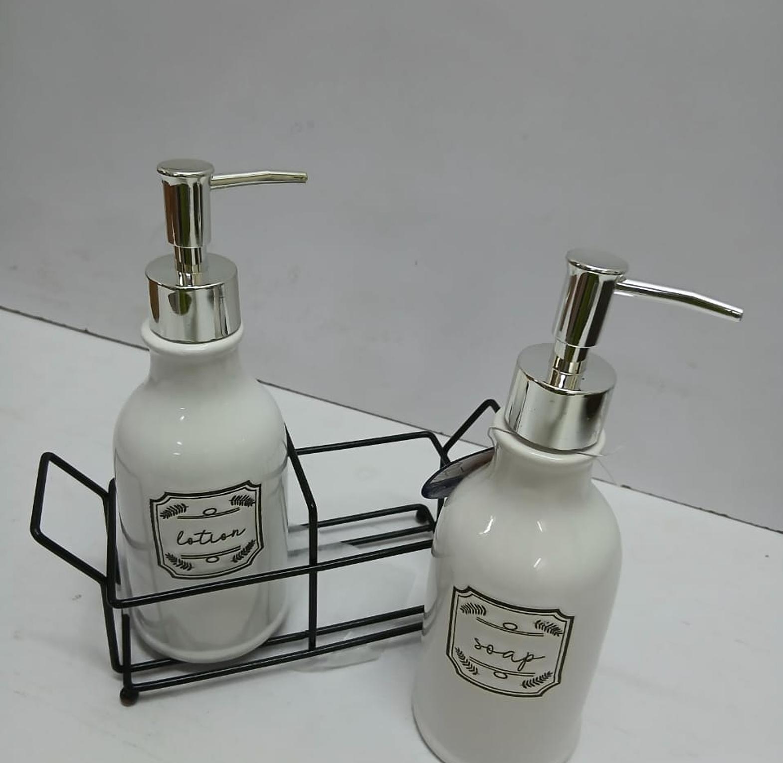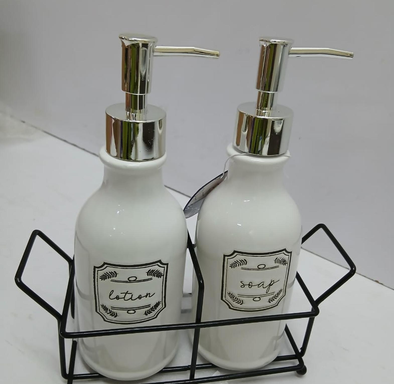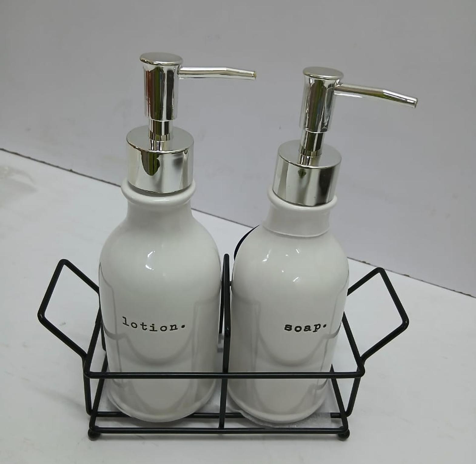 Elevate your sink area with this stylish 2-piece ceramic soap dispenser set. The white porcelain bottles clearly labeled 'SOAP' and 'LOTION' bring a sleek, modern touch to any space. Perfect for keeping your bathroom, kitchen, or guest washroom organized and clutter-free. The sturdy black metal caddy ensures the bottles stay neatly together on your counter or vanity. A must-have bathroom accessory set in Kenya for a clean, elegant look.