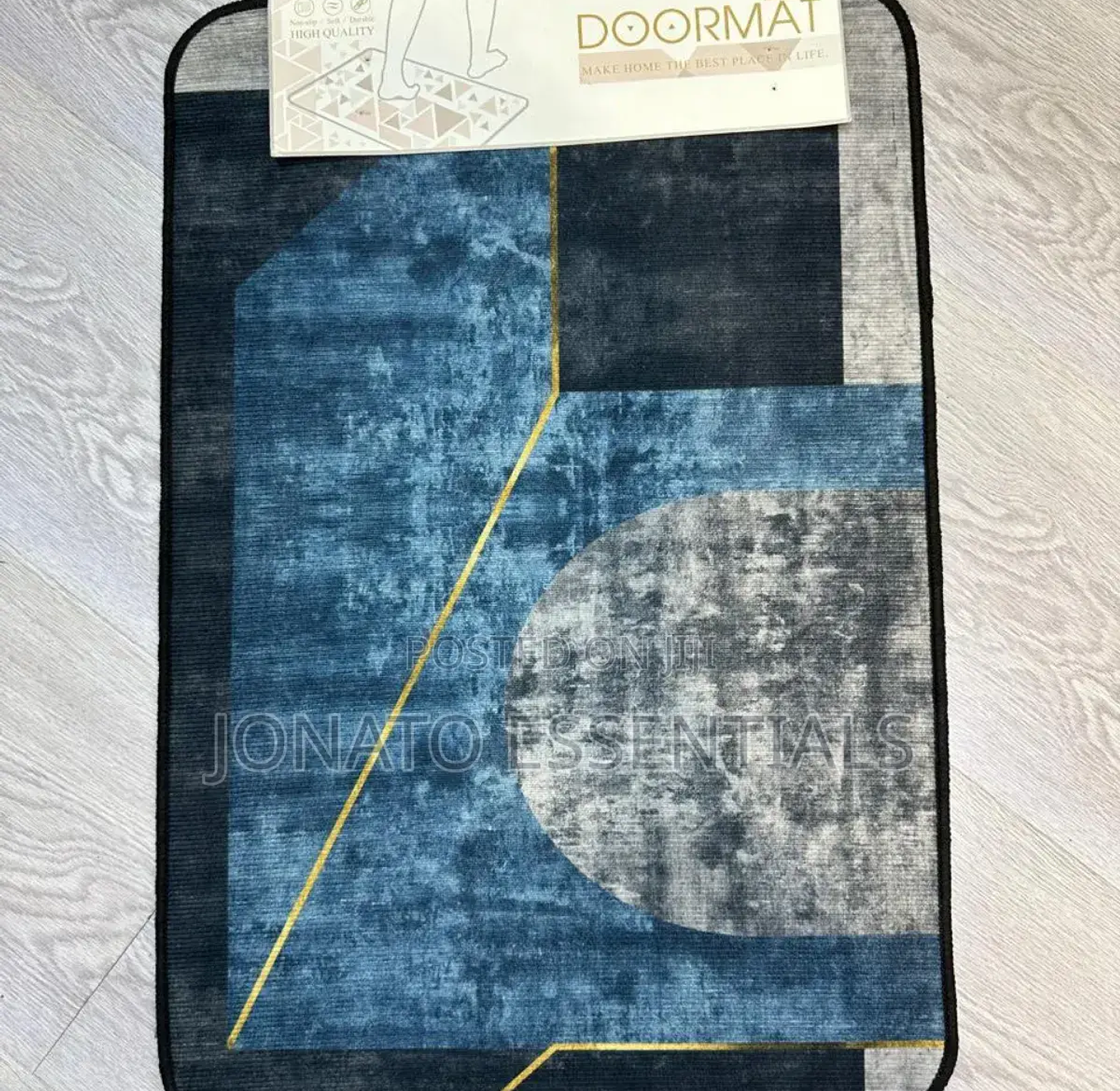 this eye-catching entryway mat features a contemporary geometric design in shades of deep blue, grey, and elegant gold accents, adding a touch of modern luxury to your doorstep. crafted for both indoor and outdoor use, this doormat is not only decorative but also highly functional.