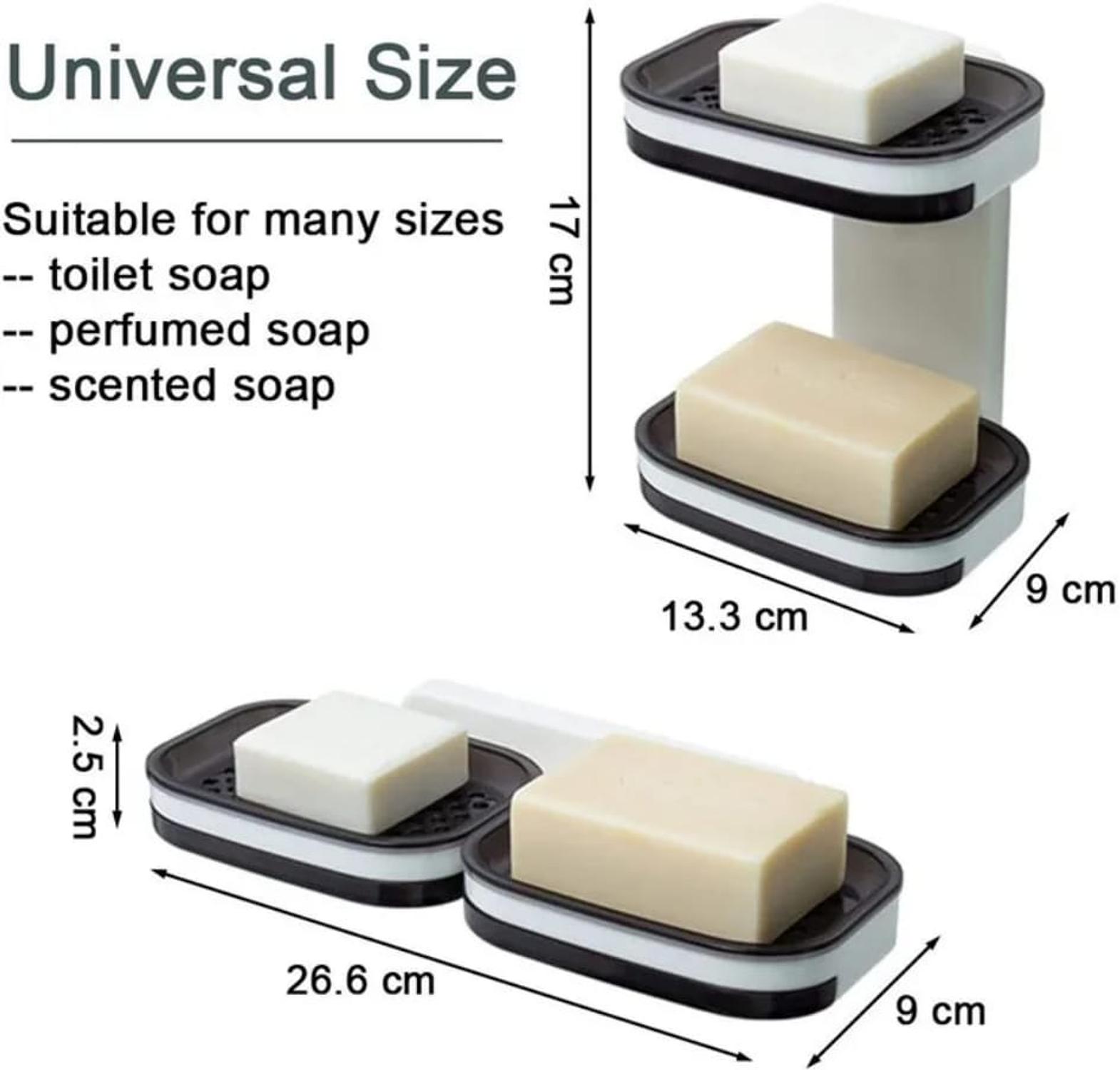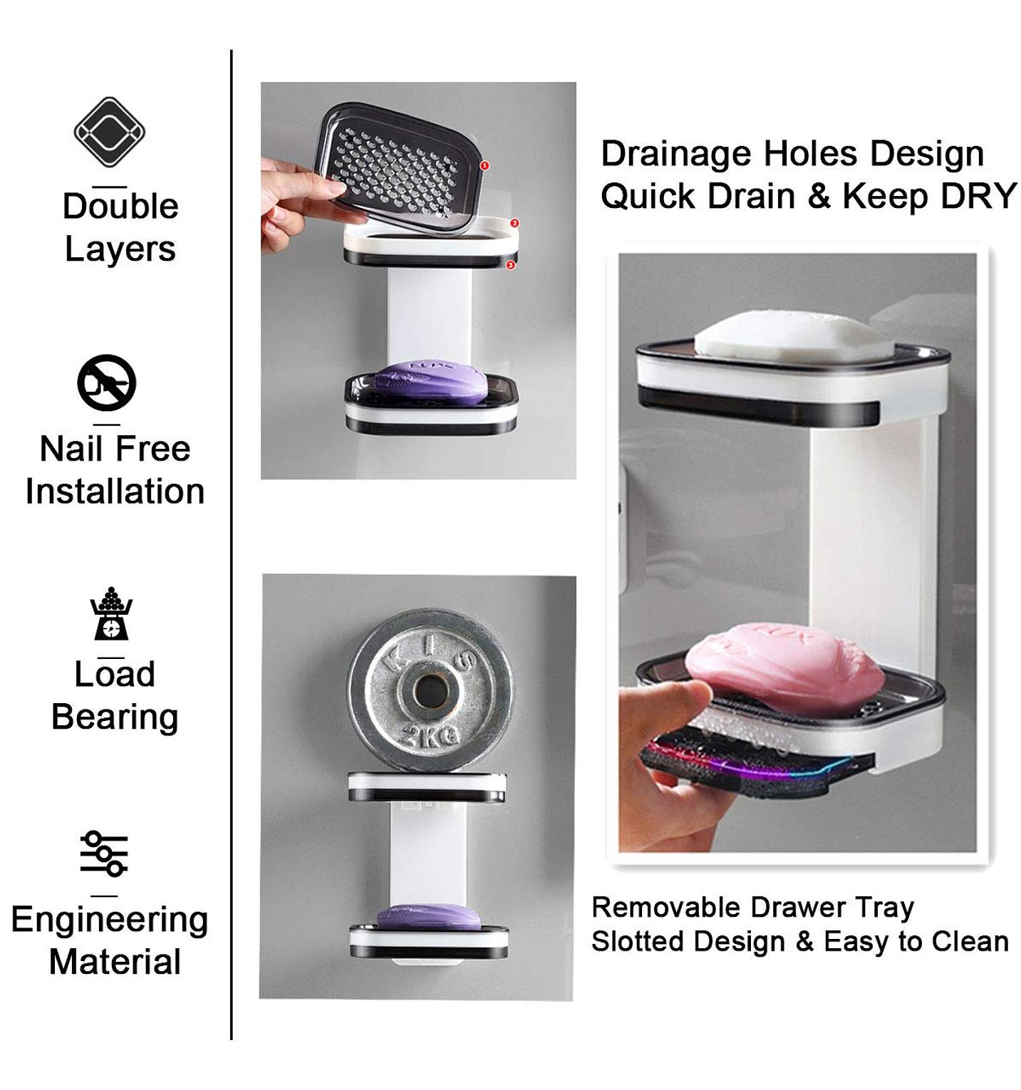 Double layer soap dish, soap holder double soap holder punch free wall mount and countertop use , you can install it on the wall, countertop or other places you need, waterproof and moisture-proof, perfect for shower, bathroom, bathtub, kitchen to store soap, sponges, scouring pads, etc. durable and non -toxic the soap dish is made of non-polluting abs material, which is durable and can be used for a long time. super strong self-adhesive that holds heavy weight. shower soap holder, double layer soap dish with draining tray, wall mounted bar soap holder for shower bathroom,sink,tub.