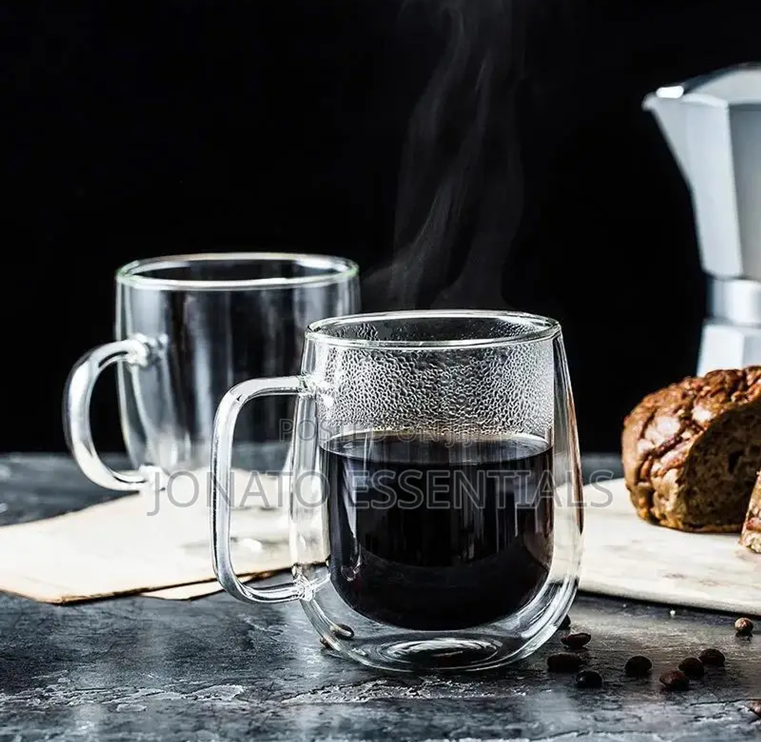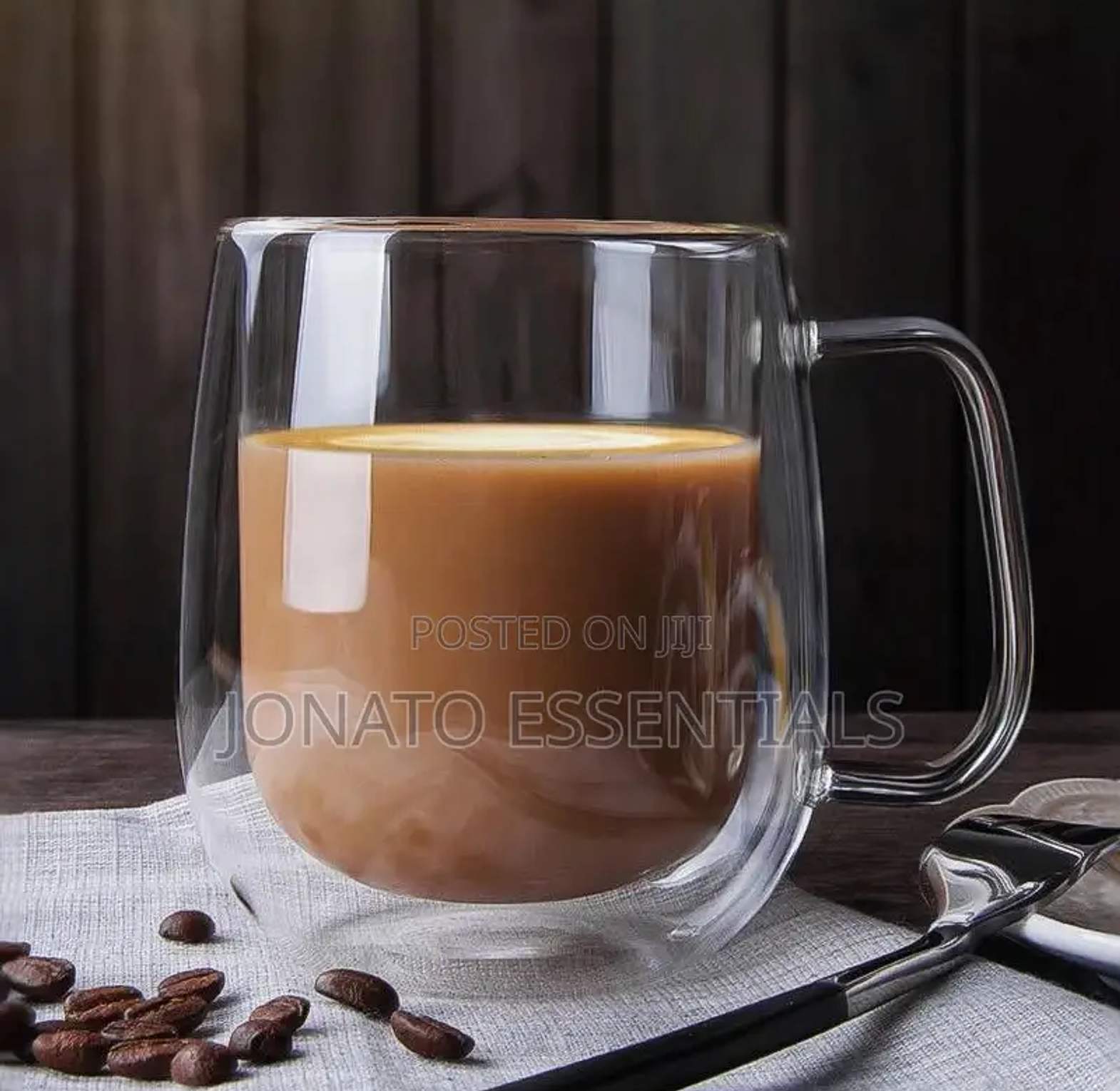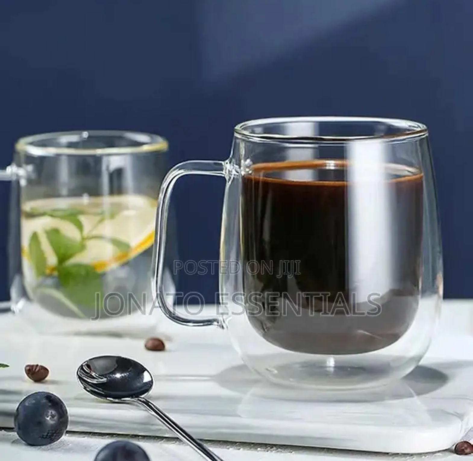 Double walled mug or cup heat resistant capacity 400ml borosilicate double walled mug 600ml 1200 high heat resistant glass (-20 to 150 degrees celsius). suitable for hot and cold drinks. material high brosilicated glass.