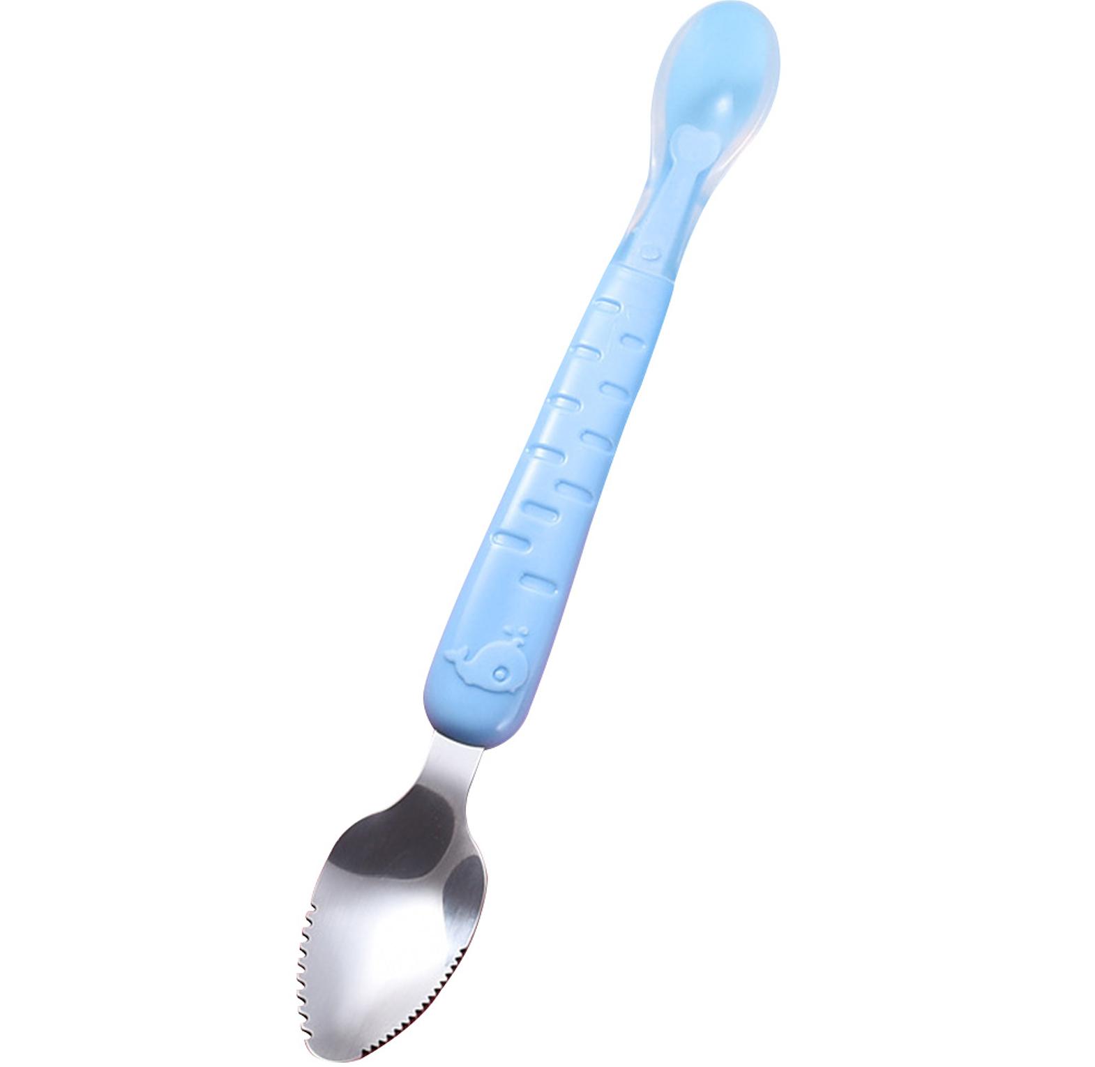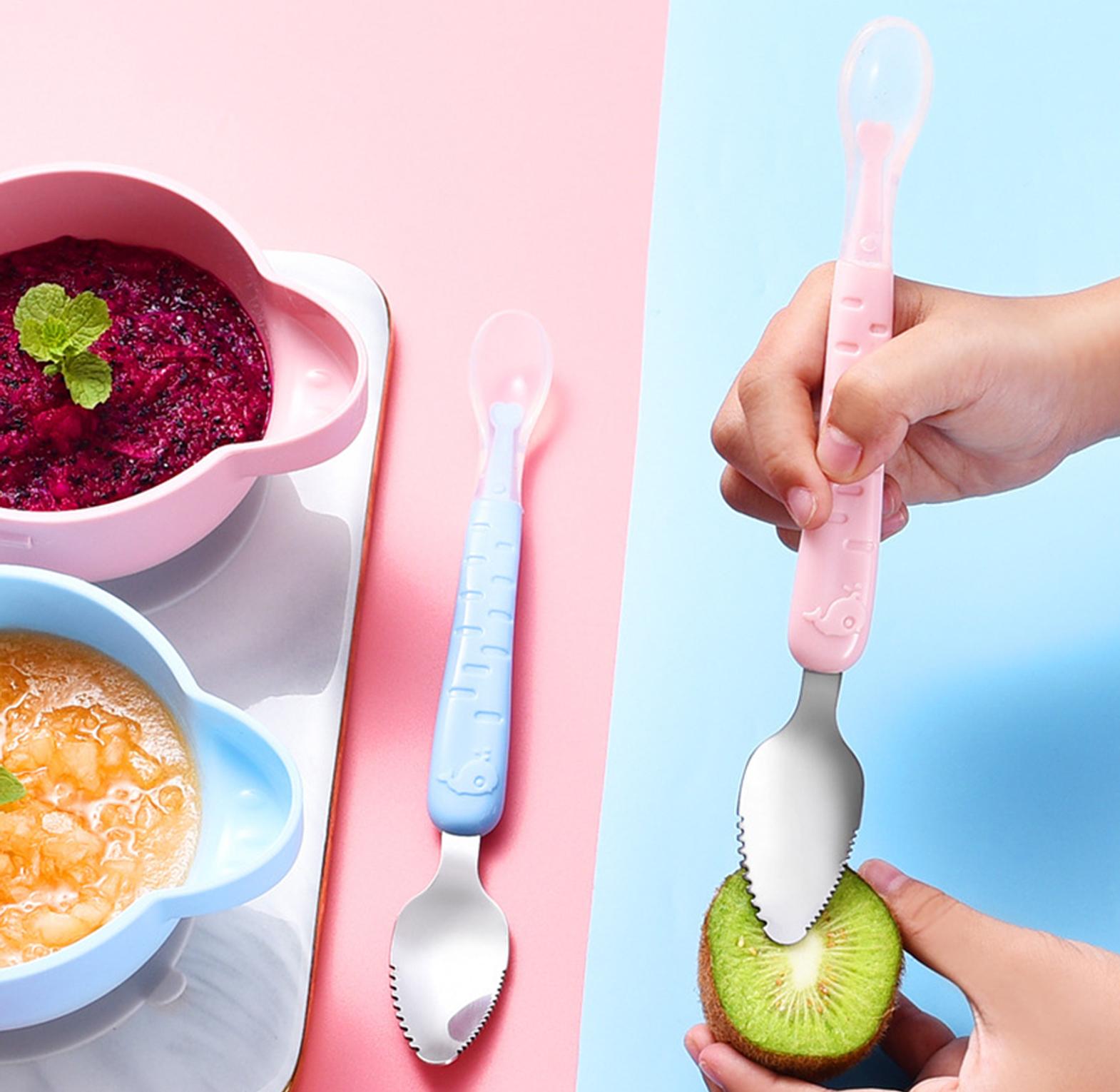 Dual head baby feeding spoon stainless steel end for scrapping, soft silicon end for feeding, comes in blue, pink