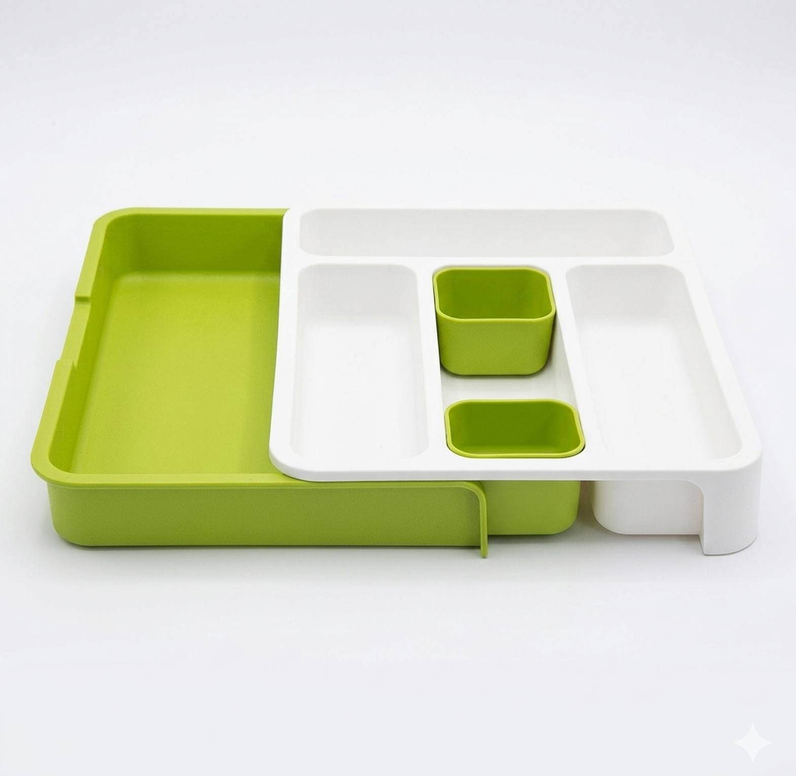 Whether you are living in a compact Kilimani studio or a spacious house in Karen, this tray maximizes your storage. It features deep compartments for standard cutlery and an adjustable side wing for larger utensils like whisks and spatulas. The sleek white and lime green finish adds a fresh, clean look to your cabinetry.