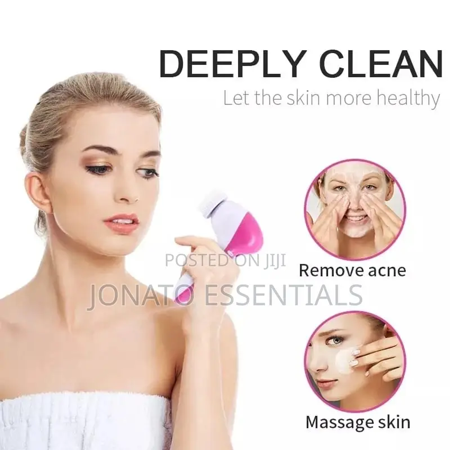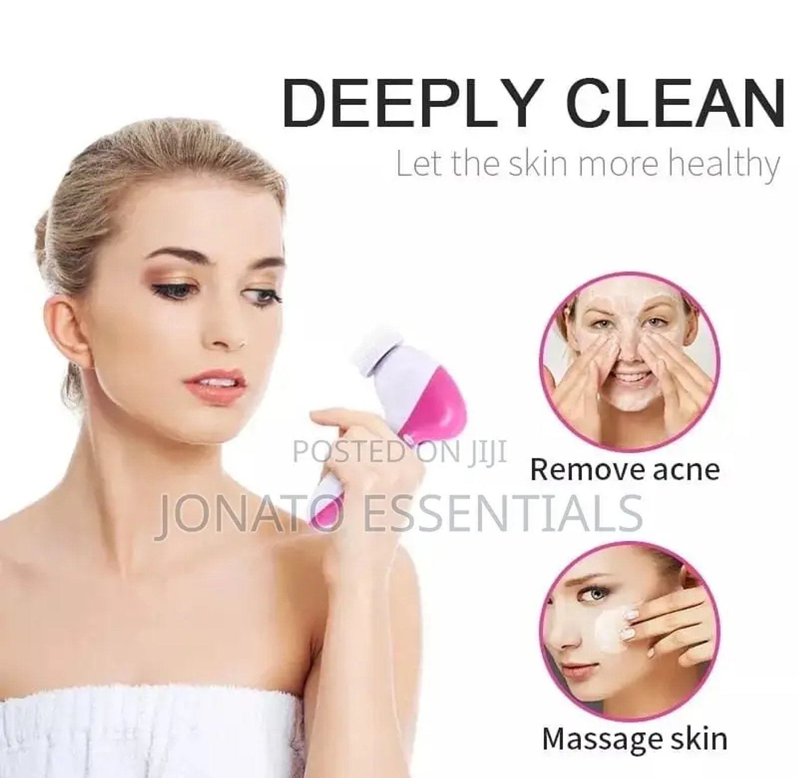 Face cleaner brush and massager. this face cleaner brush and massager is used to clean, massage and cleanse your face. it uses 2 aa batteries to operate. used to restore a soft and smooth skin. exfoliates dead skin cells to reveal a youthful and radiant skin. good for all skin types: normal, dry, oily and sensitive skin. reduce and erase fine line and blackheads. it has two levels that is "low" for daily cleaning and "high" for exfoliation. this product is not waterproof so don't use it on running water. has soft bristles for gentle face cleaning. size: 13*7*4.8cm 5 in 1 pore cleaner body massager replaceable head brush beauty tool electric face cleansing brush facial brush deep cleaning.