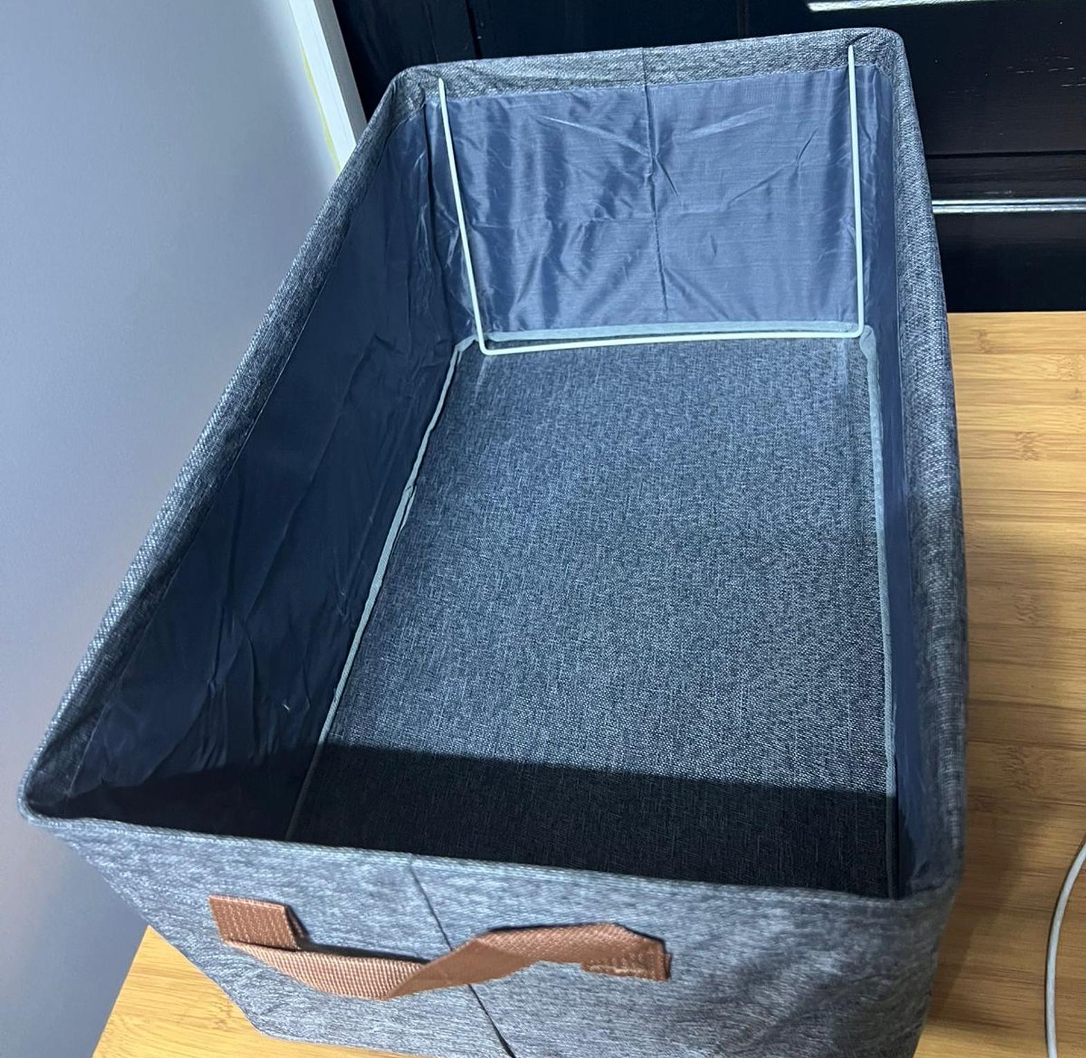 Reinforced metal frame keeps it rigid even when full. Soft-touch grey fabric looks expensive, brown leather-look handles make carrying effortless. Unlike cheap flimsy bins, this one stays upright and looks neat for years.
