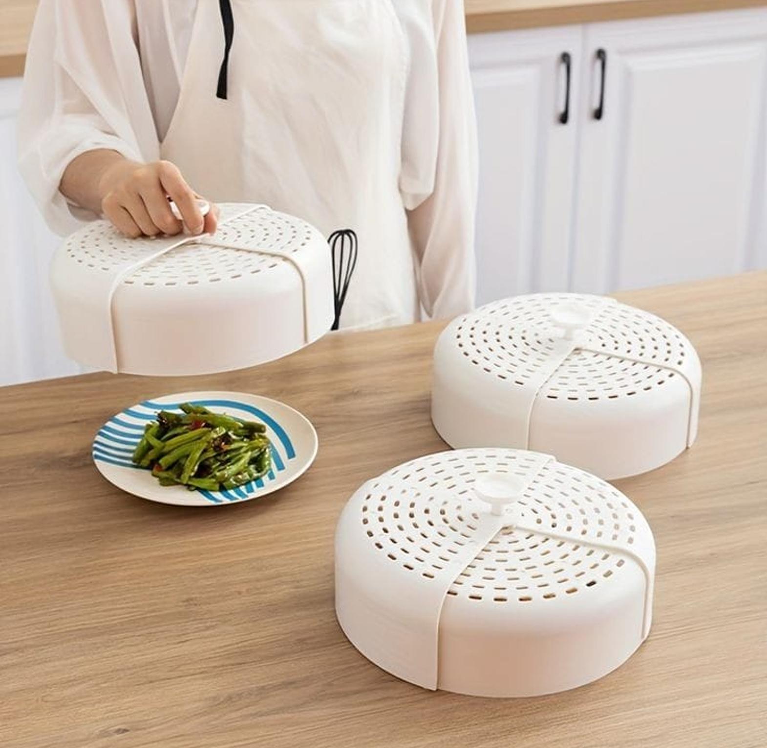 Foldable food cover diameter 25cm. hollow and breathable, food is not easy to deteriorate in hot weather, worry-free and convenient. foldable design, use large capacity, small storage volume. the material meets the standard, can be in direct contact with food, and is made of food-grade pp. portable design, easy to take and easy to use the dish cover. dust-proof, fly-proof and insect-proof, no matter how delicious and safe to enjoy, it is practical in all seasons. the shape is small and the whole body is ventilated, which can ensure that the meals are always ventilated. foldable microwave food cover plastic anti-mosquito breathable food cover safe vent kitchen tools reusable leftovers dust cover