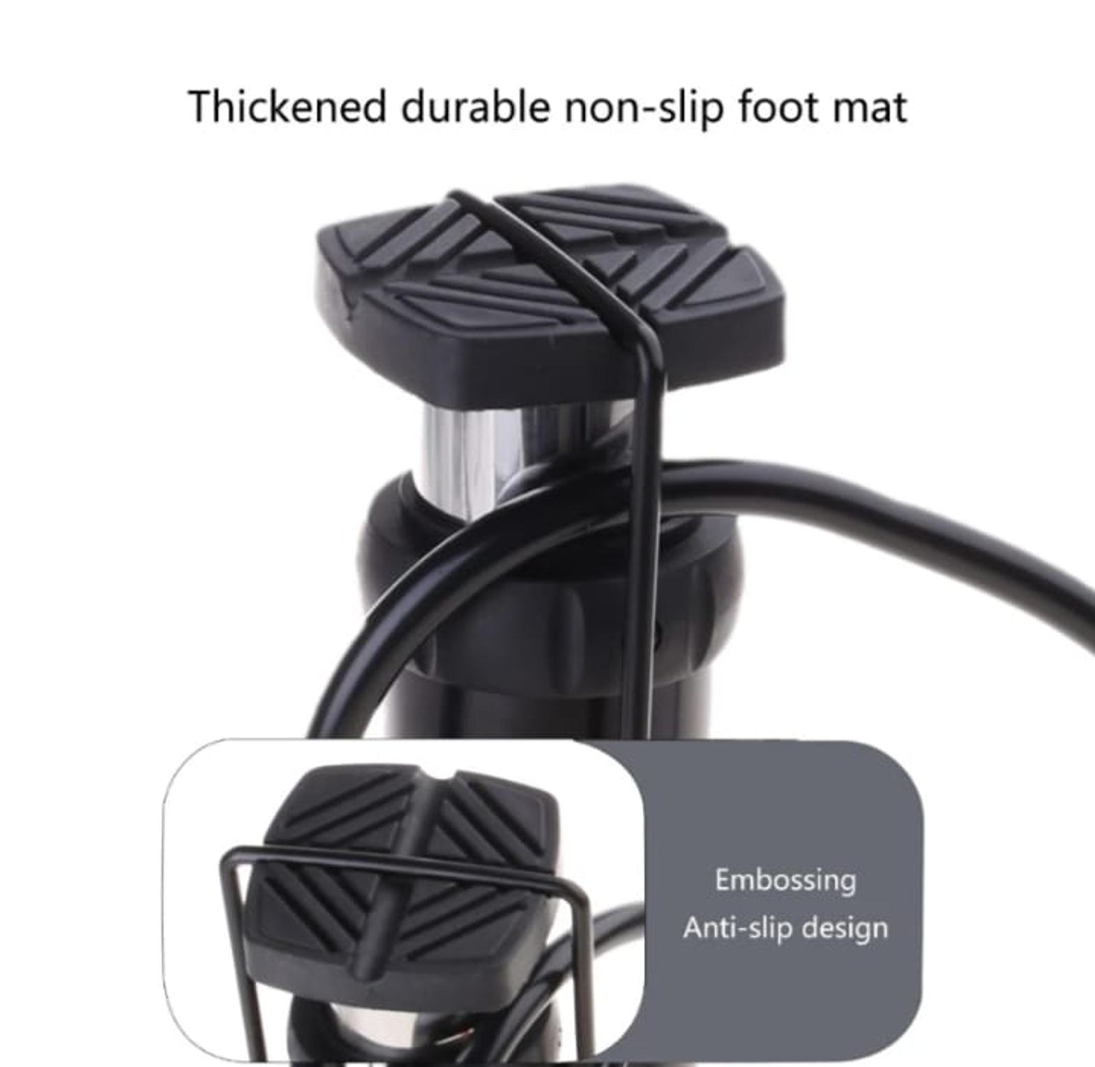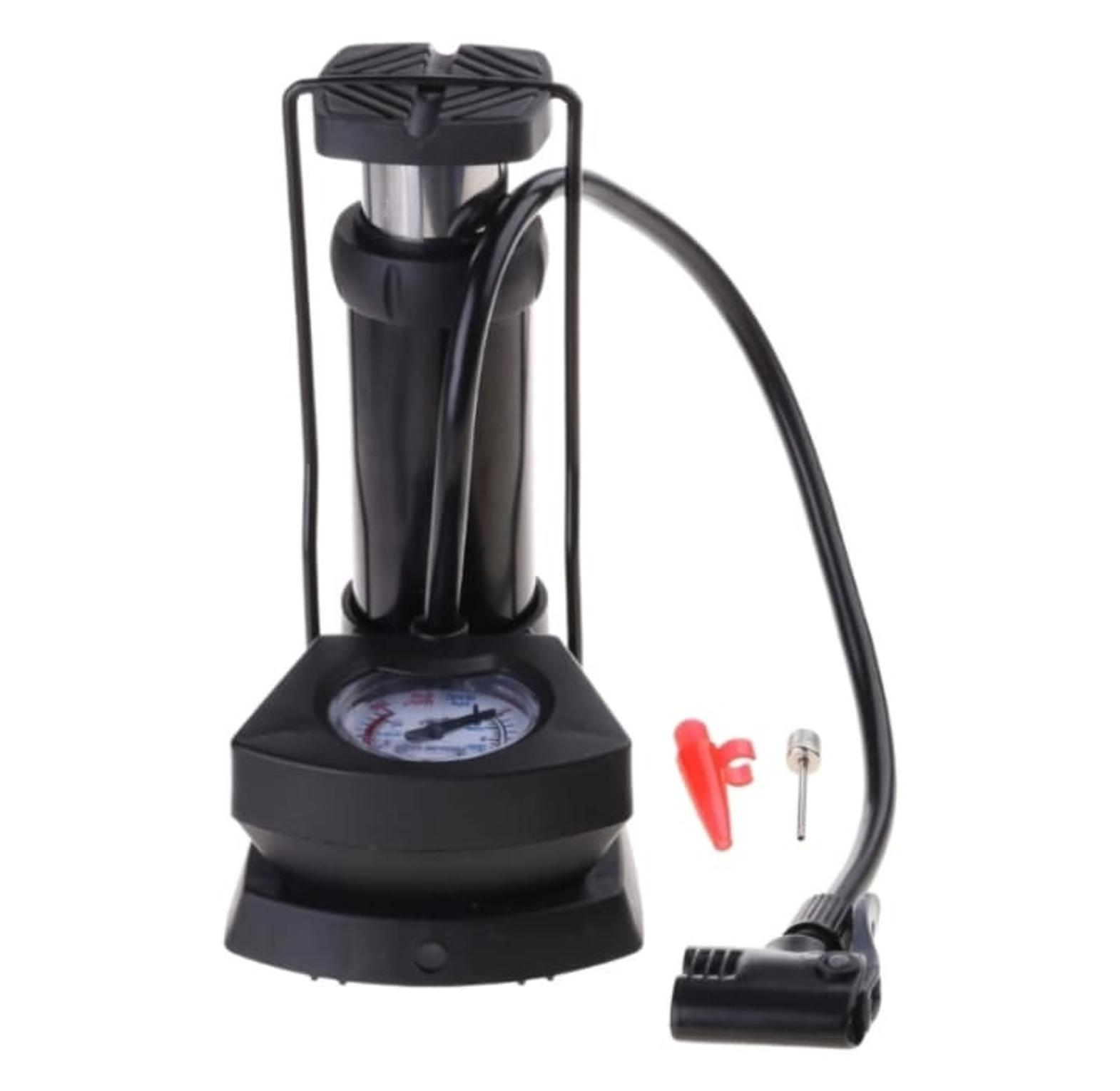 Foot pump, vehicle wheels pump, ball pump, bicycle pump. this foot mini pump is a pump used to inflate car tyres, sports balls, motorcycle/bicycle tyres. has a gas level indicator which shows where the level of the gas is. to use: place the pump on a flat surface and unlock the foot pedal. install the right nozzle and put in the tyre/balloon/ball step on the foot rim and the pedal then start pumping. ensure to oil the machine frequently to prevent it from having a dry effect causing aeration. the pedal is designed in a way that it cannot slide i.e. it is anti-slip. material is strong and quality. mini bicycle pump anti-slip pedal mountain bike foot pump built-in precision barometer for balloon swimming rings basketball.