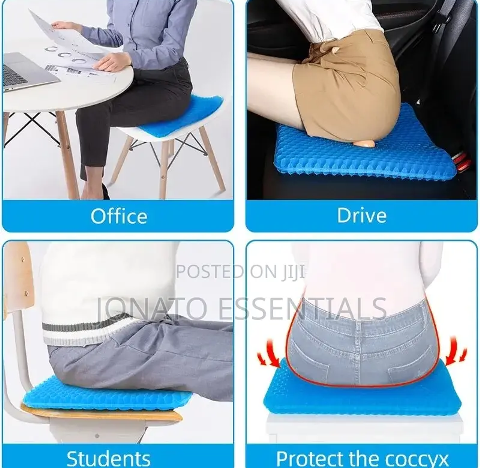 Gel seat cushion, egg sitter support cushion, car seat cushion, office chair cushion. this cushion commonly known as the egg sitter support cushion absorbs pressure points creating a comfortable seated feeling. it is made of high elastic gel material making it have excellent shock absorption, reducing pressure on the waist. its honeycomb structure enables it have a good breathability and practicality it is easy to clean and easy to carry(portable). retains it's shape strong and durable fits most chairs. free washable cover size:40*34*4cm(thickness). summer gel seat cushion breathable honeycomb design chair cushion breathable cool pad ice seat cushion silicone car seat cushion