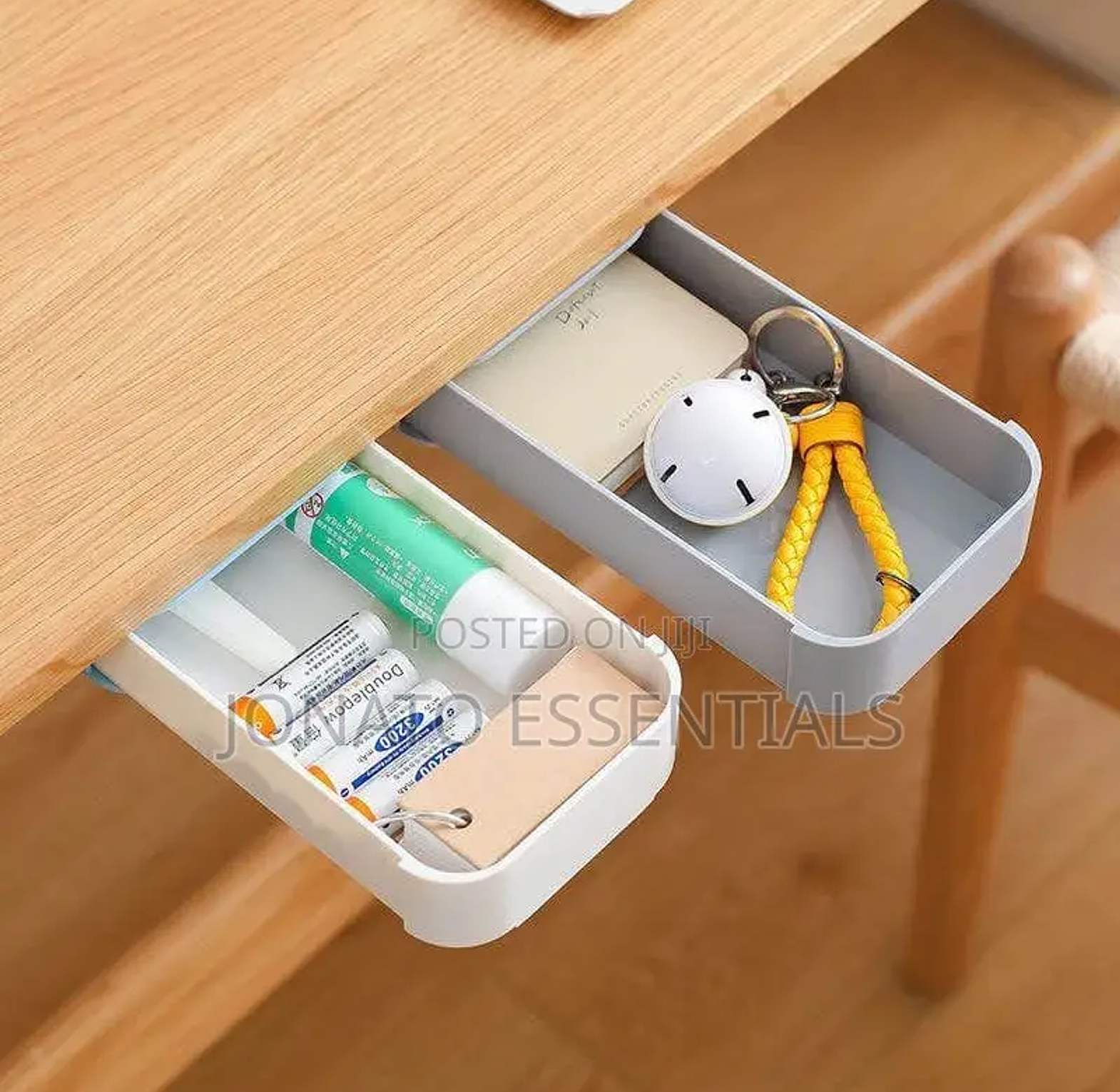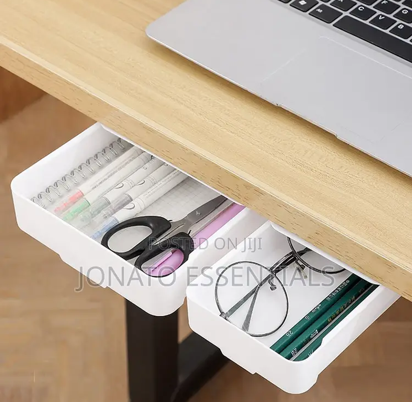Hidden drawer storage box multi-purpose uses like store money, bills, tissues, cell phones, pens, rulers, scissors, etc. hidden design:you can paste the drawer at the bottom of the table, not taking up any desktop space, better reflecting the storage value of the drawer. it is drawer type, can be smoothly pushed and pulled, making it more convenient to take out things, and does not take up space. self-adhesive hidden storage box desk storage drawer plastic table storage holder simple sundries cosmetics stationery organizer.