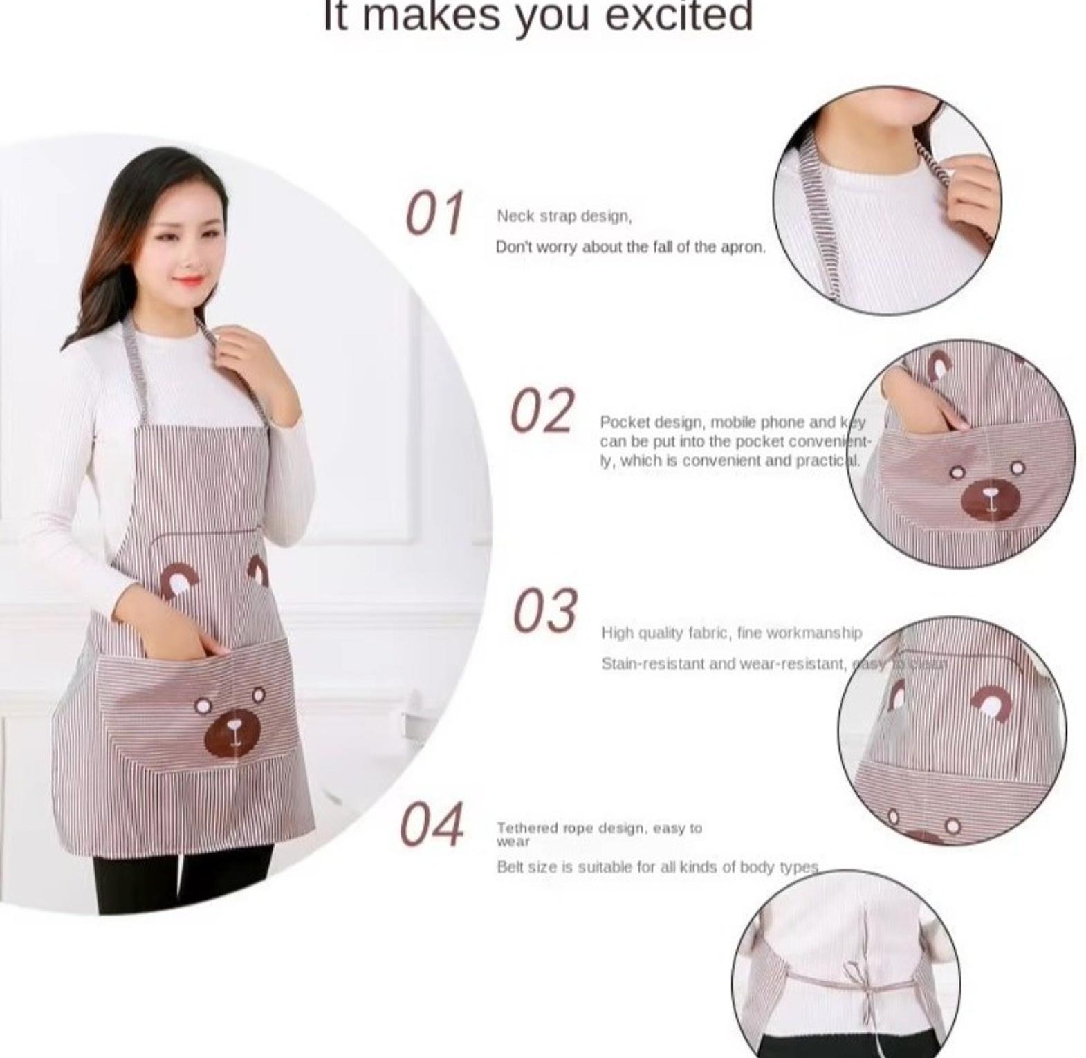 Women apron with pockets material: non-woven polyester fabric cute cartoon bear usage: kitchen cooking properties: anti-oil waist bib design: sleeveless provide coverage and protection from dirt, spills and stains while cooking and baking. adjustable waist belts that makes it fit different body shapes simple design that is suitable for both men and women machine washable, easy to clean and fast dry apron size: 94 × 67cm