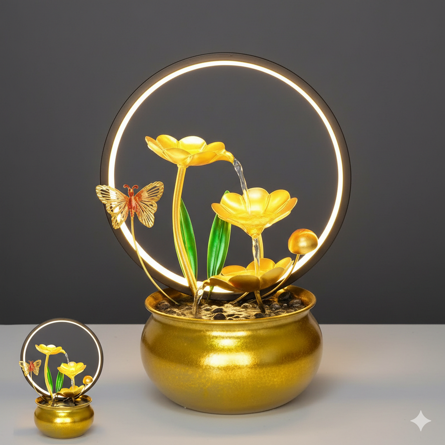 The gentle flow of water from the golden petals into the basin creates a calming environment, ideal for stress relief after a long day in the CBD. The integrated LED ring provides a soft, warm glow, serving as an energy-efficient night light or mood lighting.