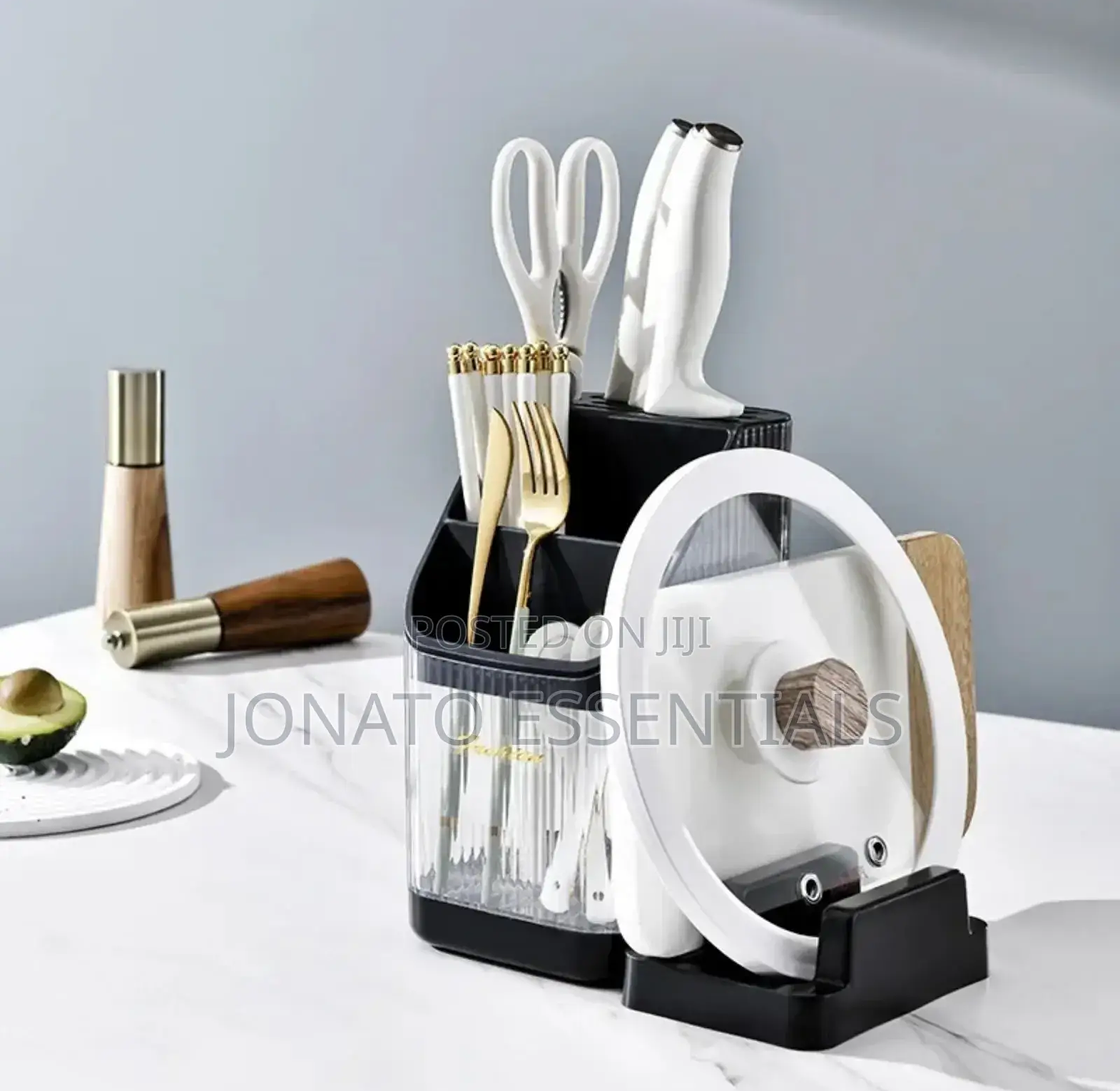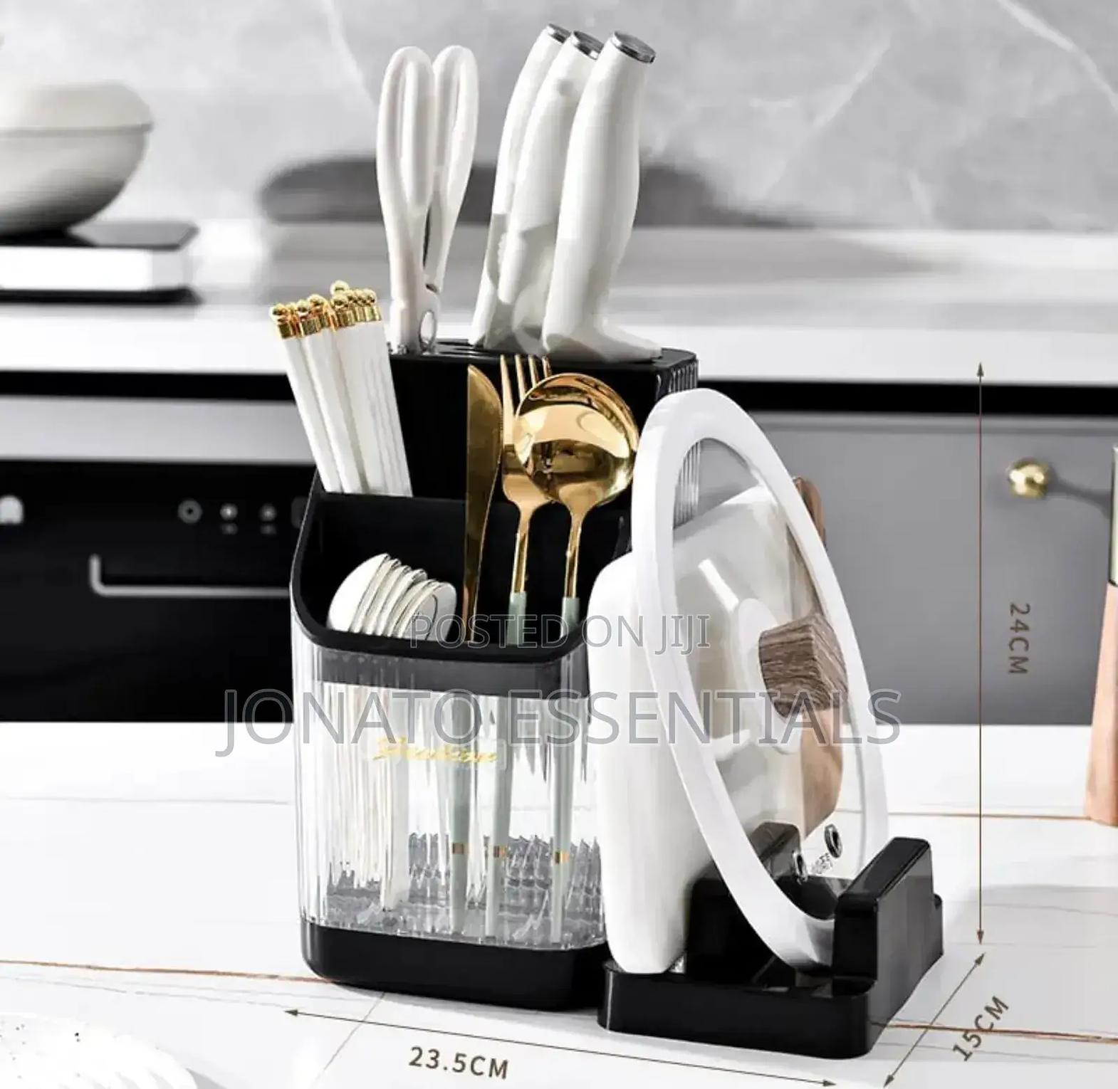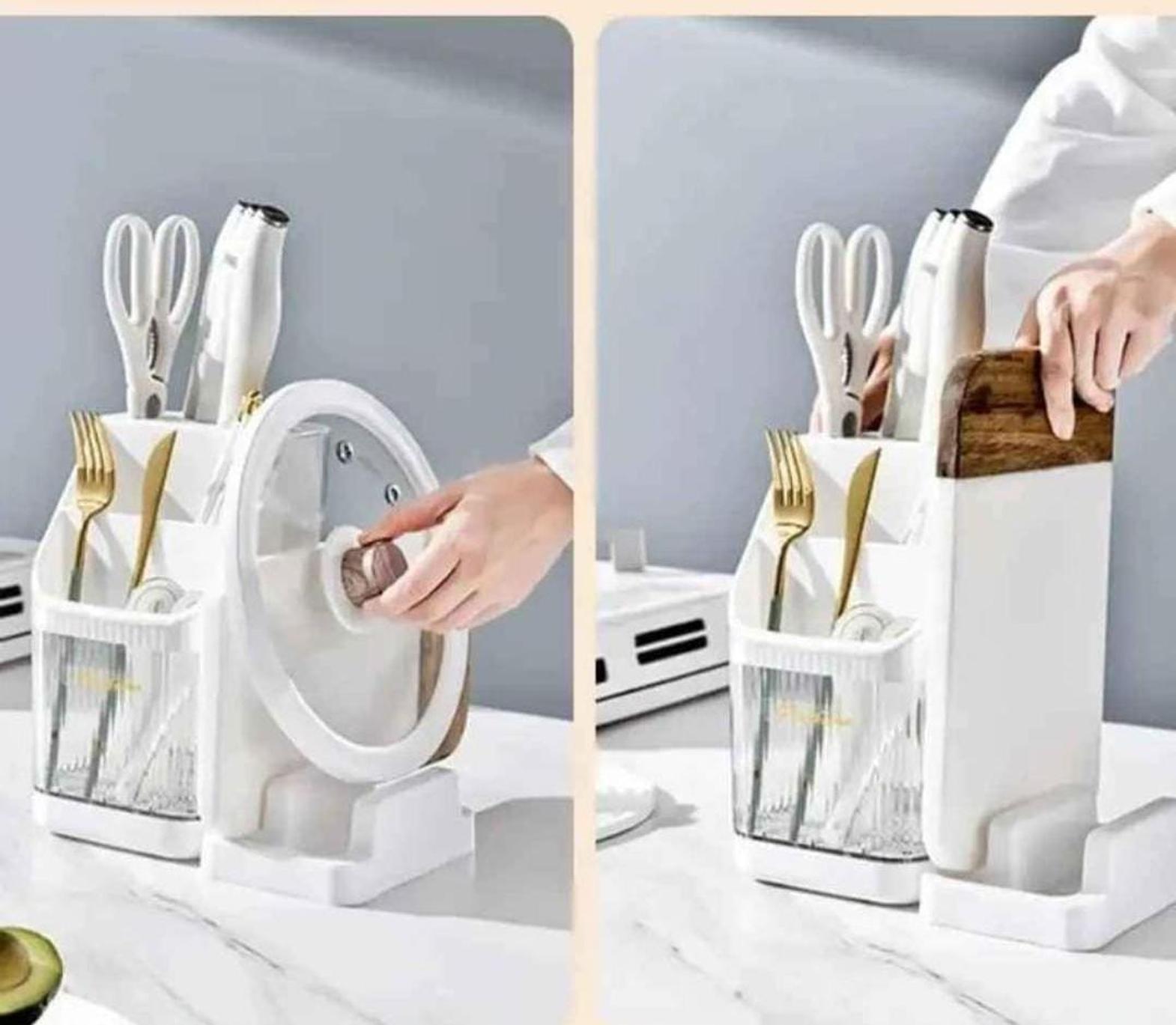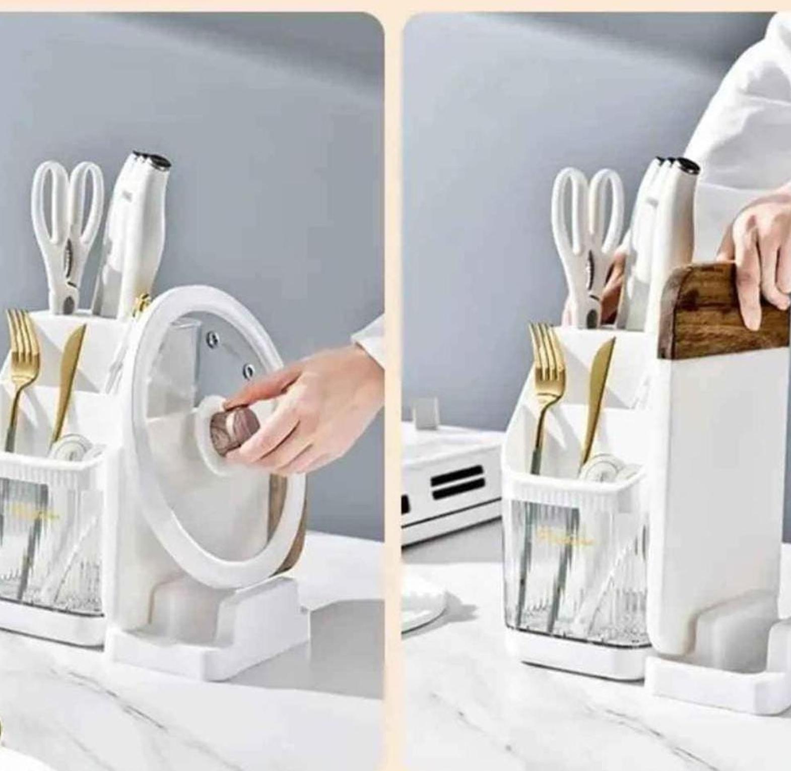 Multipurpose cutlery holder and organizer kitchen multifunction cutlery storage organizer with detachable chopping board/pot lid holder. material: acrylic