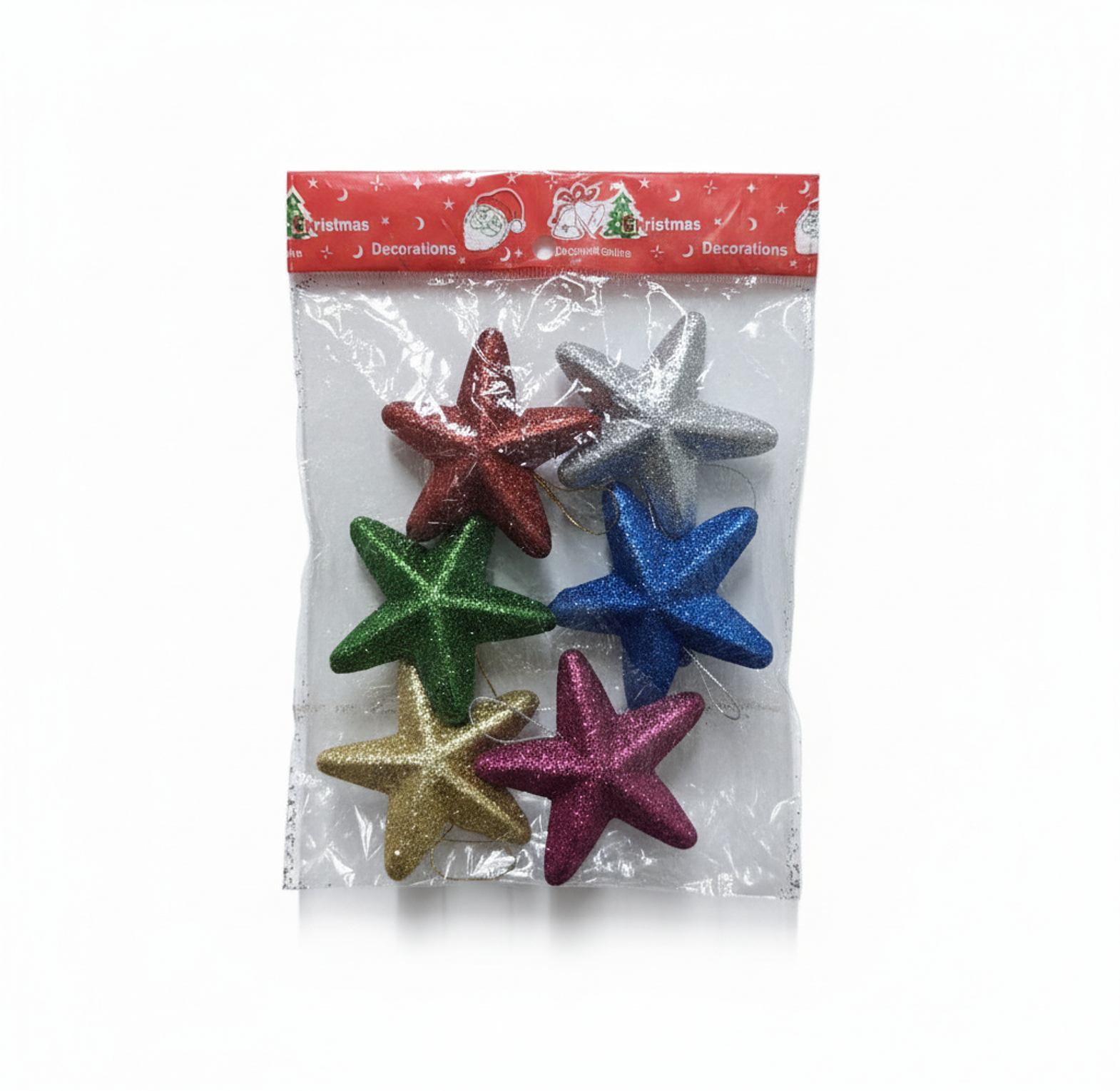 Brighten your Christmas tree with this pack of 6 glitter star ornaments in red, green, blue, gold, silver, and pink. Each star is lightweight, easy to hang with gold strings, and perfect for Kenyan homes celebrating December holidays. Made in China with shiny glitter finish that kids love. Ideal for Christmas trees, office parties, or church decor in Nairobi and beyond.