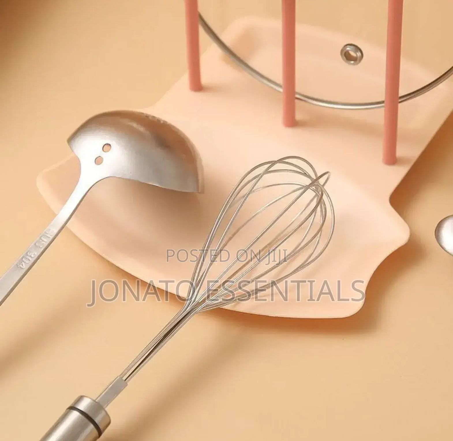 Pot lid holder and spoon rest spoon rest and pot lid holder combo multifunctional holder: the groove of the pole can be used to put a small pot lid, shovel or spoon, also can put the pot lid and kitchen utensils together. the spoon and pan lid rest can keep your kitchen tidy all the time. easy to install: after you receive the lid and spoon rest, you just need to insert the rod part into the frame. no tools are needed, the operation is simple and fast. removable pan pot cover lid rack shelf stand holder utensil rest organizer storage kitchen tool.
