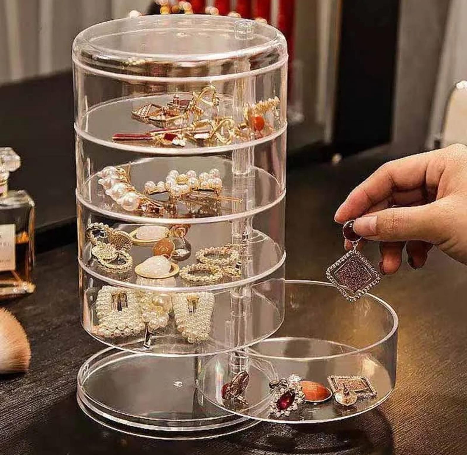 Rotating jewelry or jewellery storage box and organizer used to store all small items such as jewelry, earrings, bracelets, watches, necklaces, rings, hair accessories, etc. transparent rotating jewelry box small multilayer earring ring hairpin jewelry display rack headband hairpin eardrop storage box
