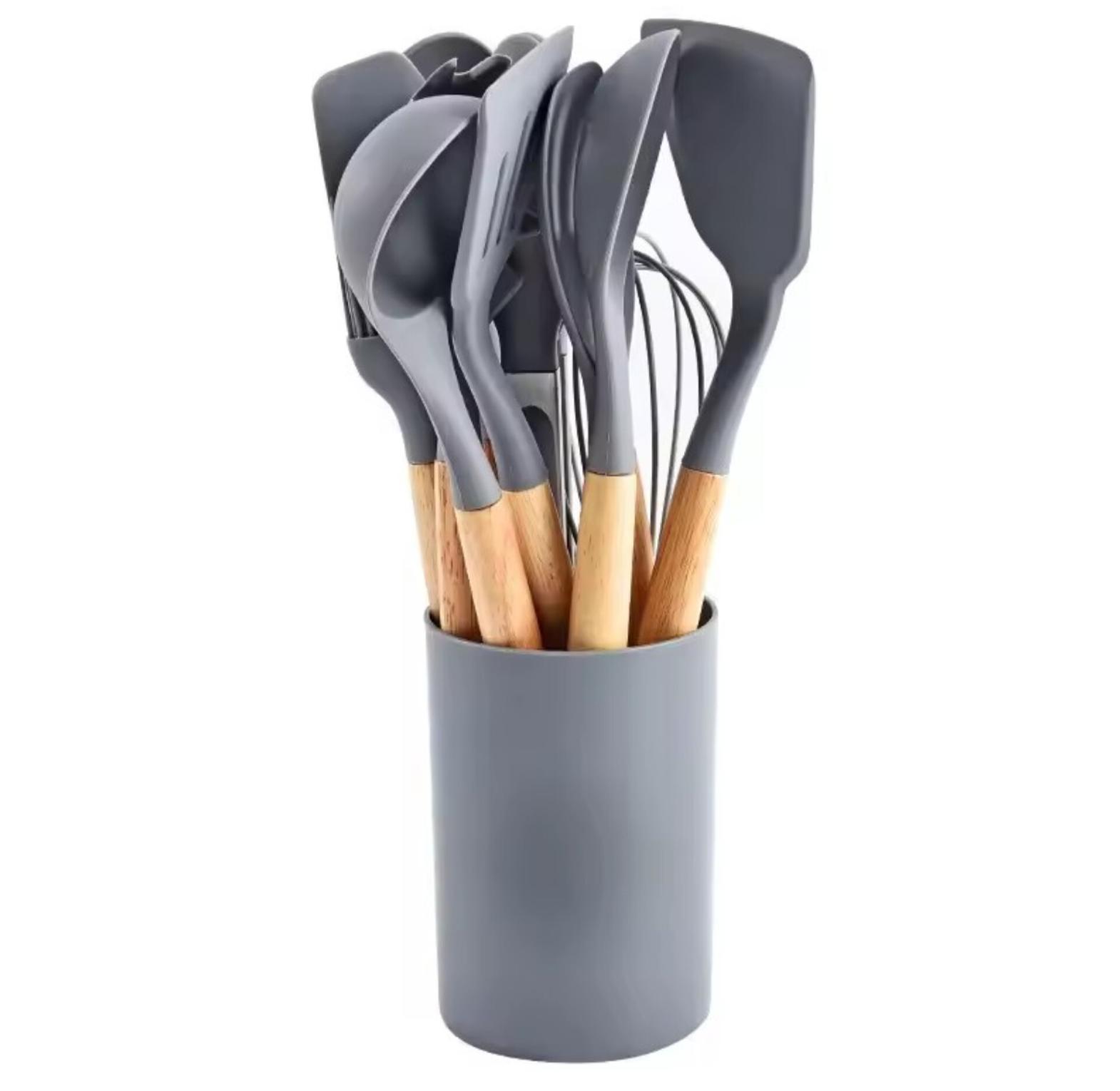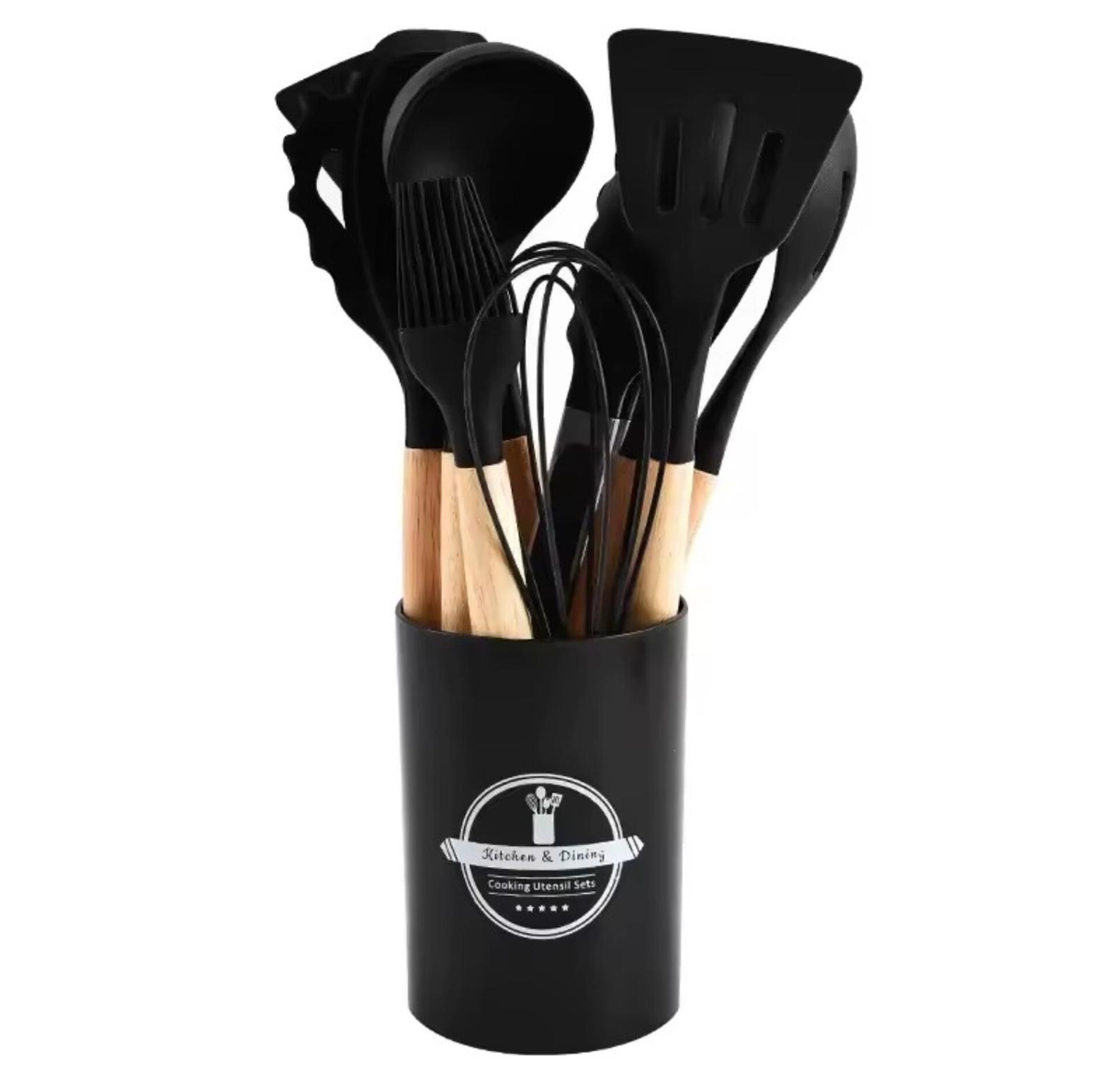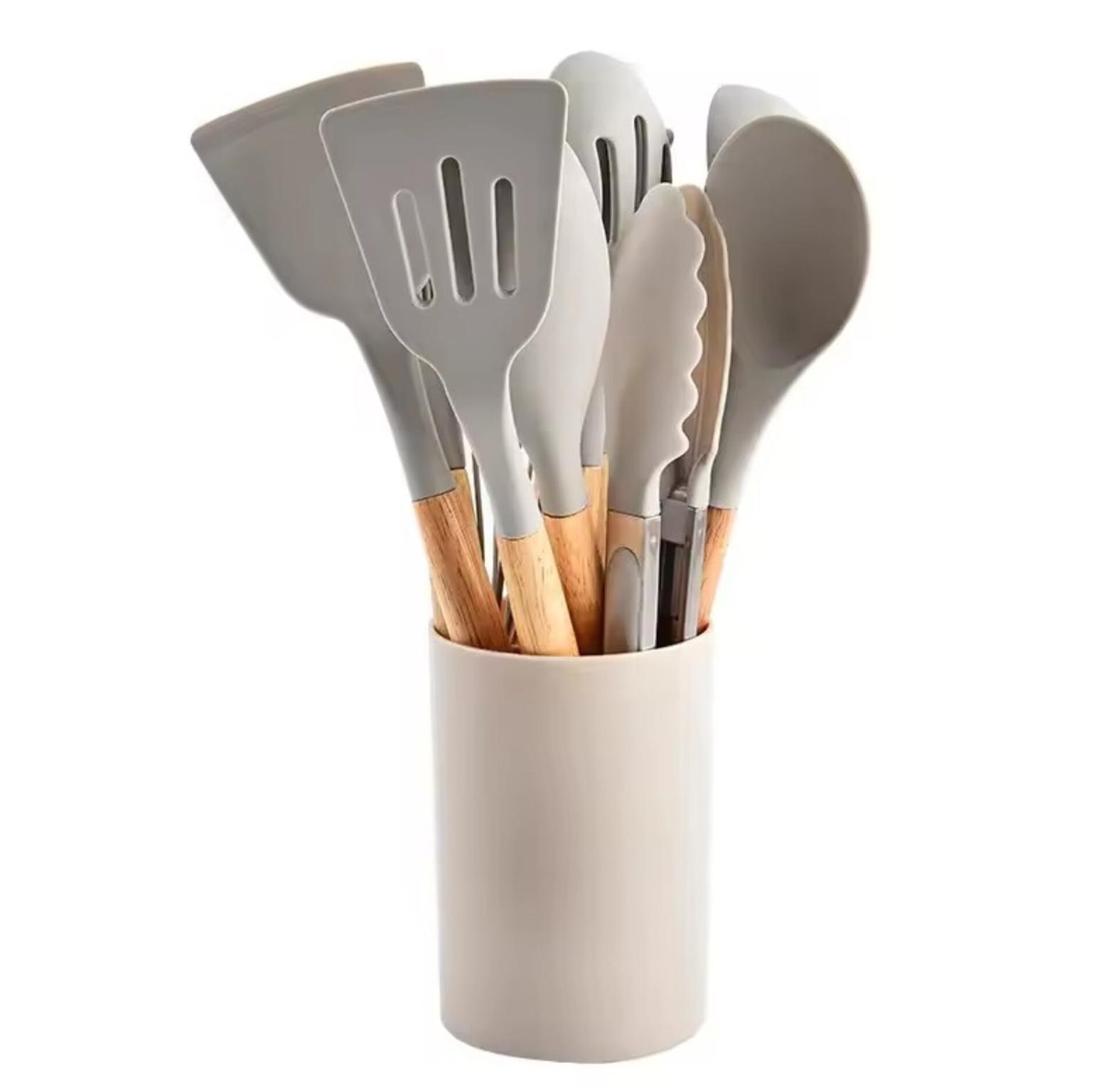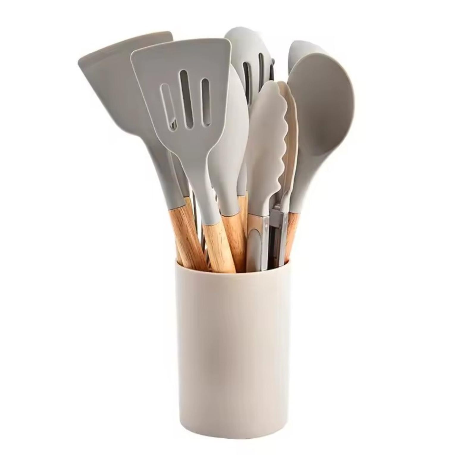 Silicone 12 pcs kitchen spoon set heat resistance: high temperature tolerance ensures safe use in various cooking scenarios. food-safe material: crafted from top-quality food-grade silicone, ensuring no harm to your health. aesthetic color palette: offers multiple color choices, enhancing the visual appeal of your kitchen space. ergonomic scandinavian handles: features sleek, wood-finished handles for a comfortable and confident grip. please enjoy your silicone kitchenware set, knowing that each piece has been designed with your culinary experience in mind. 12pcs kitchen silicone cooking utensils set for non-stick cookware cuisine outils cookware heat resistant accessories.