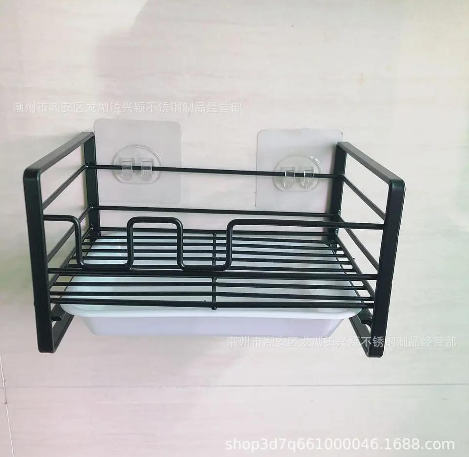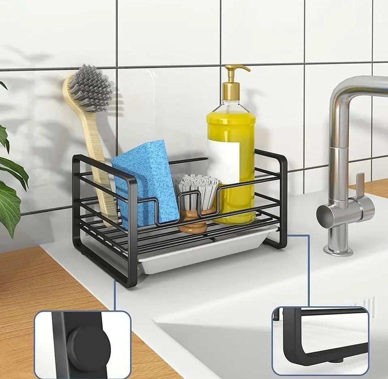 Sink caddy with water tray material:carbon steel and plastic tray color: black size: 18.5*12*10cm black iron sponge drainer versatile draining with drain pan sink drain rack space saving soap drainer shelf bathroom.