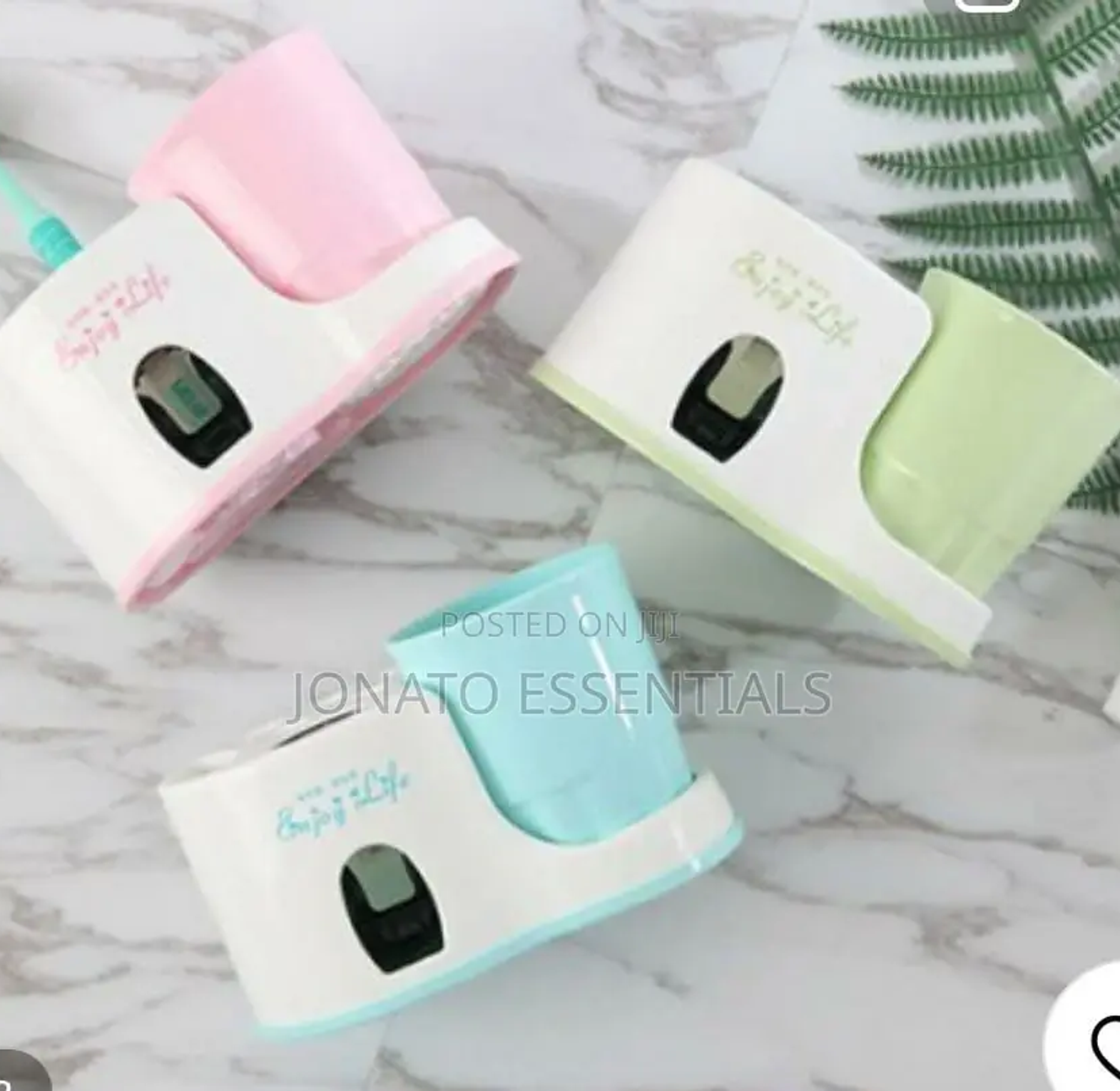Toothbrush holder and toothpaste dispenser with a cup material: plastic bpa free has 1 cup it has adhesive sticker automatic toothpaste dispenser hand free toothpaste squeezer wall mounted toothpaste holder toothpaste suqeezing tools.