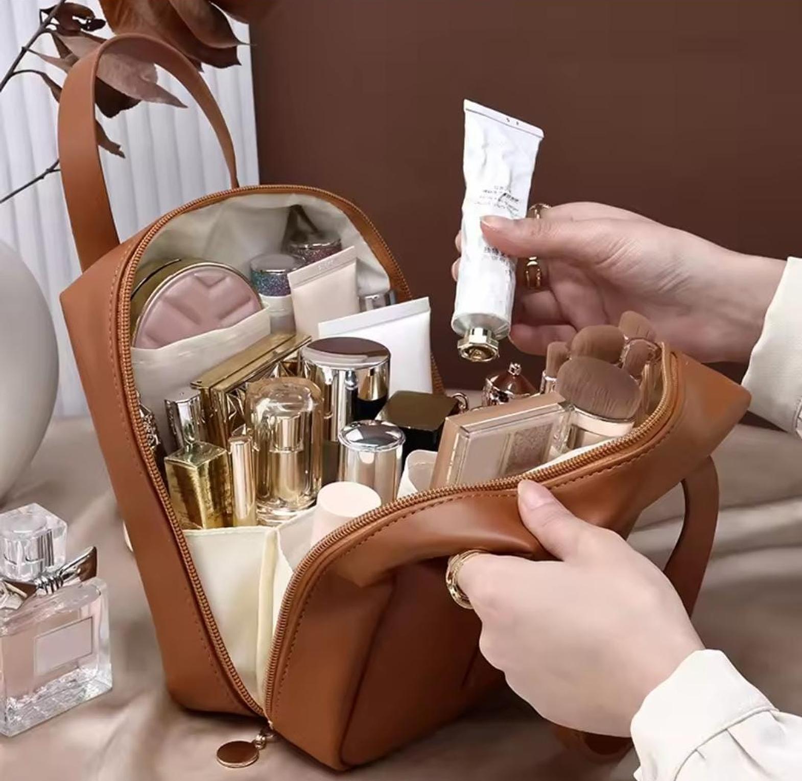 Travel cosmetics storage bag, makeup storage bag organizer pu leather multi_function cosmetics bag,travel large capacity makeup organizer waterproof storage tool with handle. this portable cosmetic bag offers a large capacity, perfect for storing all your essential beauty products in one convenient place. waterproof material:made with waterproof material, this bag ensures your cosmetics stay dry and safe from leaks or spills. fashionable design:featuring a fashionable design, this bag is not only functional but also adds a stylish touch to your everyday look. portable:its portable design makes it easy to carry around, ideal for travel or on-the-go use. portable large capacity shell cosmetic bag pu waterproof makeup storage bag with handle multi-layer travel toiletries organizer.