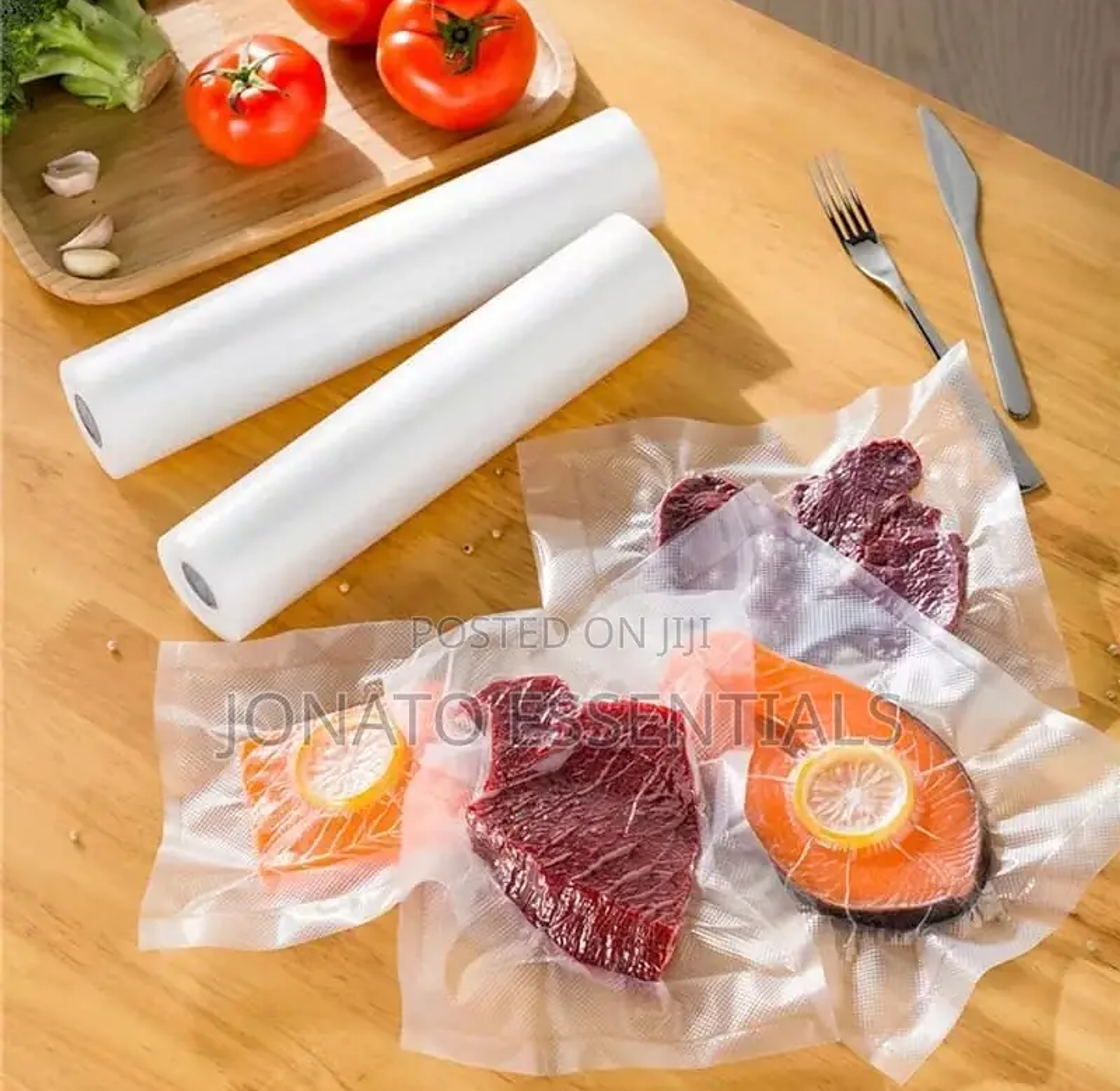 Vacuum sealer bags roll, packaging bag roll, food vacuum sealer bags size:17cm by 5m this bags are used to seal food against germs since the inner side is fully vacuumed and sealed on the outside. 22cm*500cm 800 28cm*610cm 1800 30cm*610cm 2000 32cm*610cm 2200 double sided mesh food vacuum bag meat fruit vegetable storage packaging food saver bag household sealed fresh-keeping bags.
