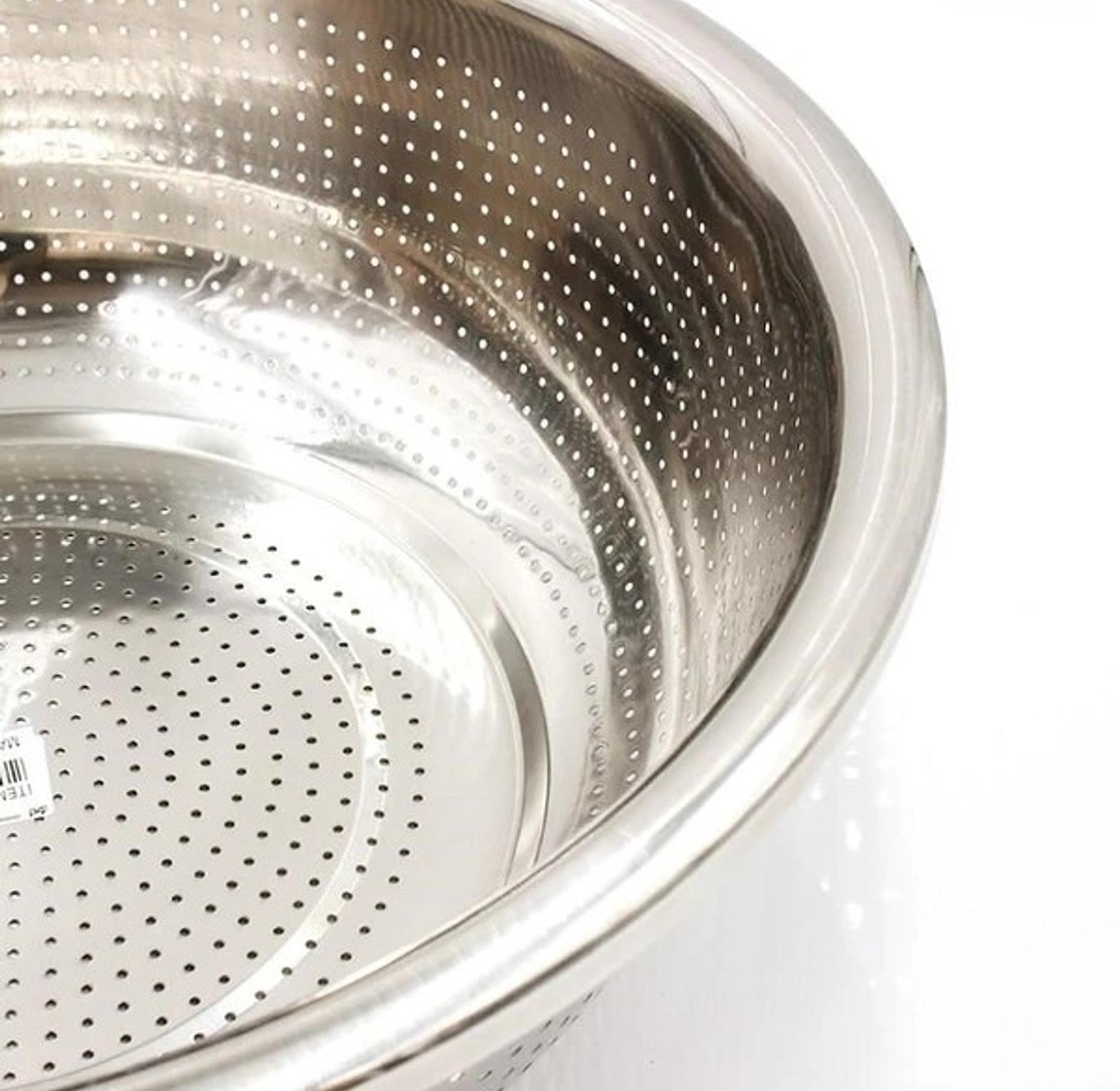 Vegetable drain basin basket strainer. diameter 32cm used to wash and drain vegetables and fruits. colander mesh drain basket, rice, beans and meat drainer. stainless steel egg flour mixing bowls rice sieve fruit vegetables drain basket soup basin mesh filter kitchen utensils.