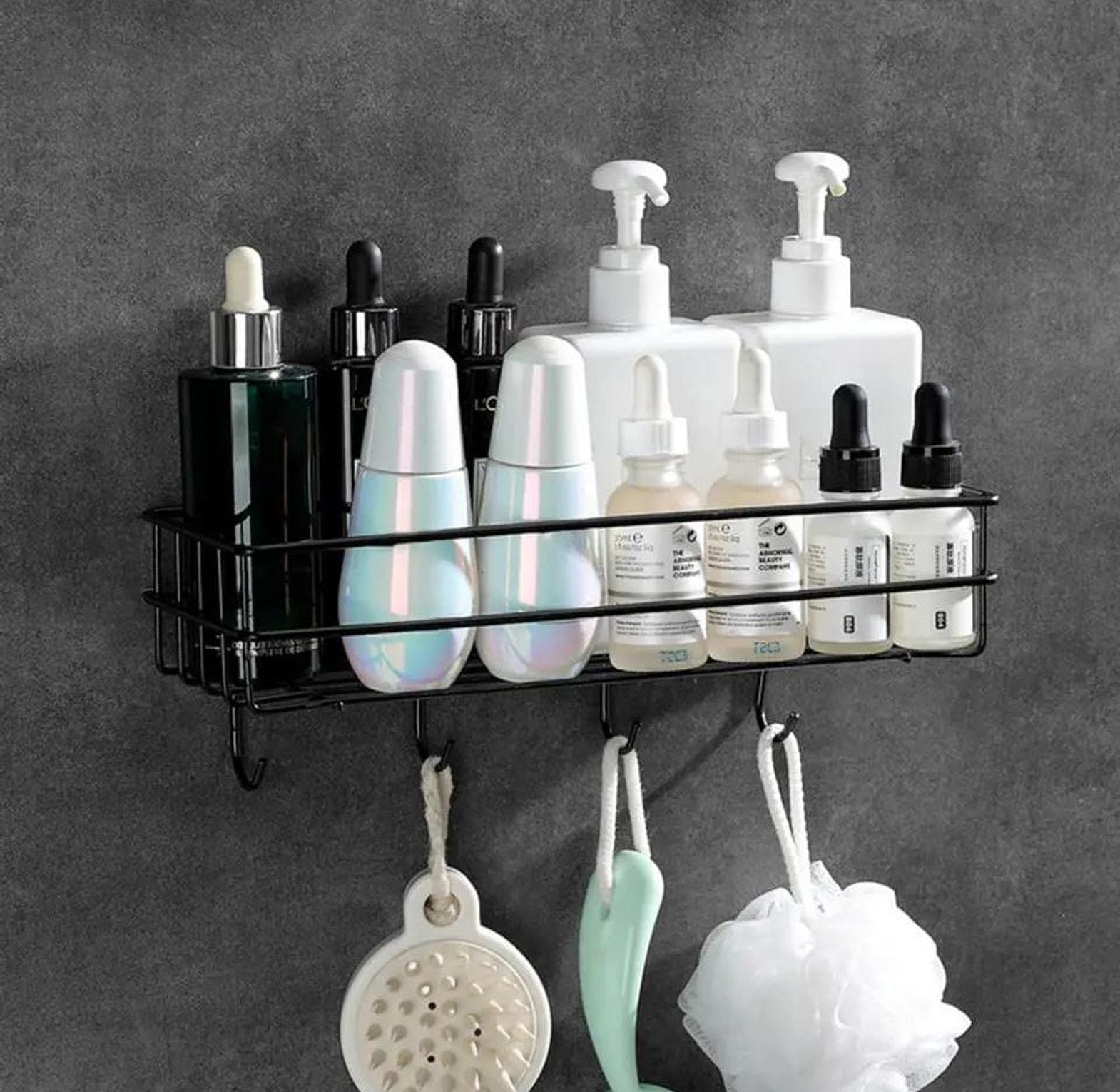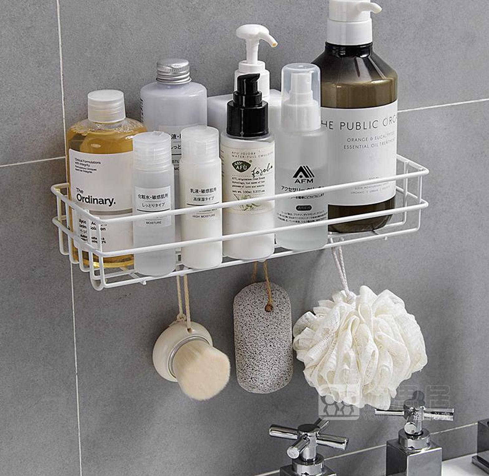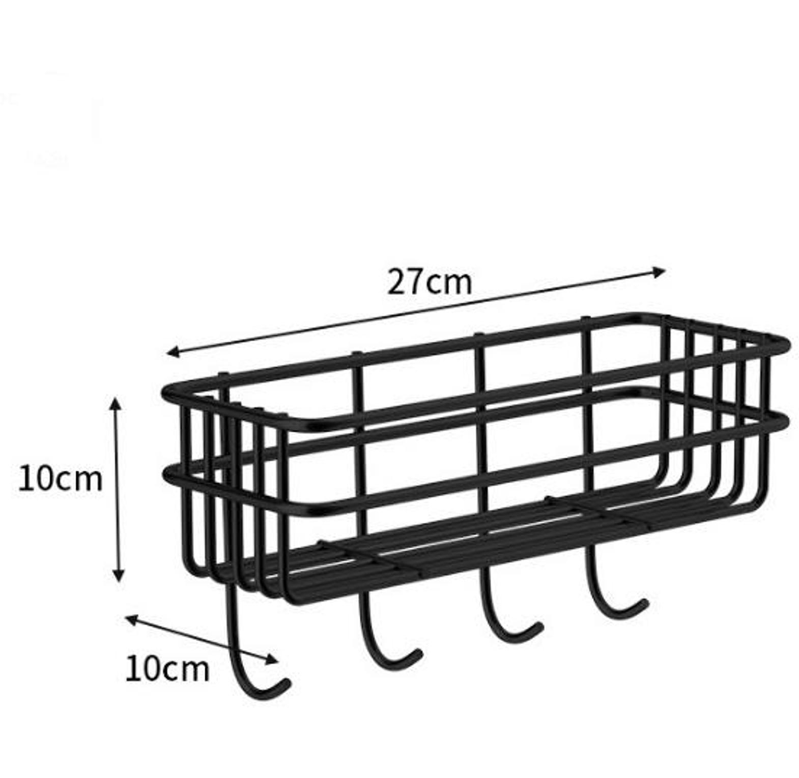 Wall mounted bathroom or kitchen organizer with hooks punch free storage rack /organizer type :wall mounted floating metallic shelf with hooks for more holding capacity uses : used in the kitchen as a seasoning storage rack bathroom non perforated organizer to hold shampoo ,face towel , shower gel etc size :28 by 10.5 by 9 cm