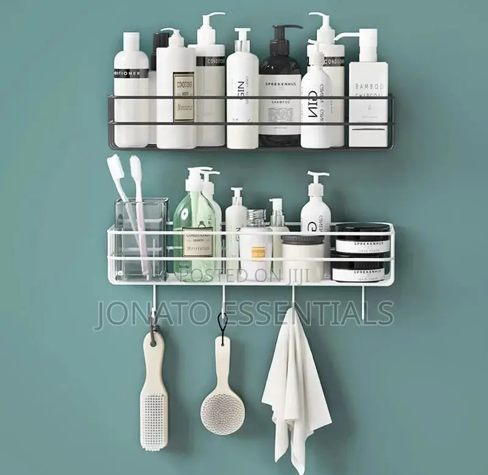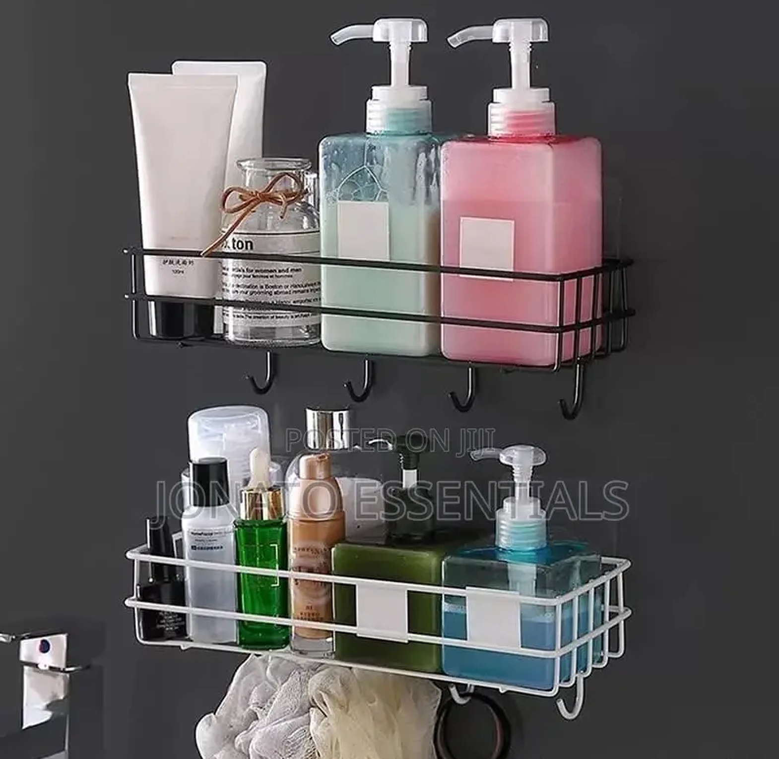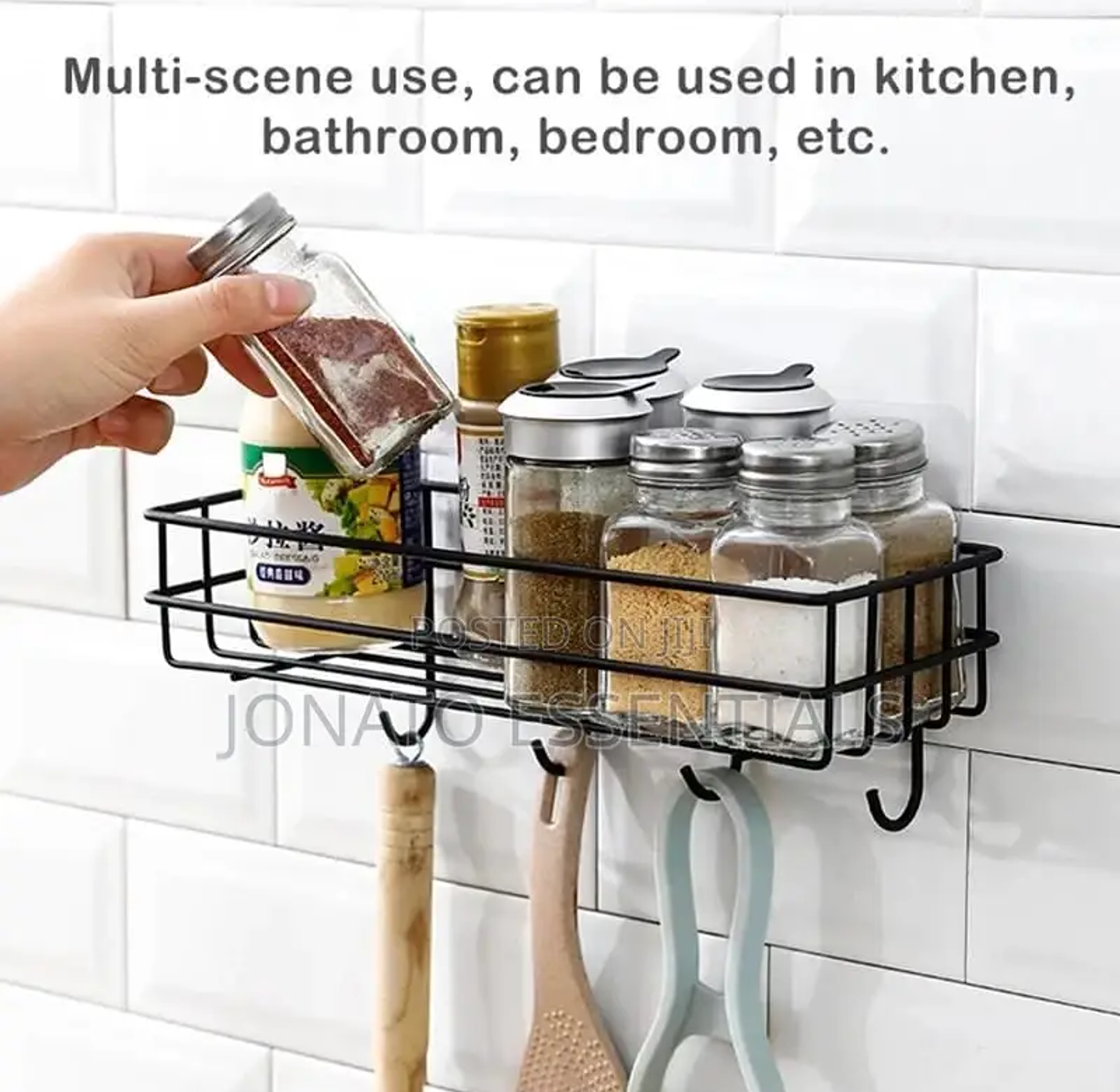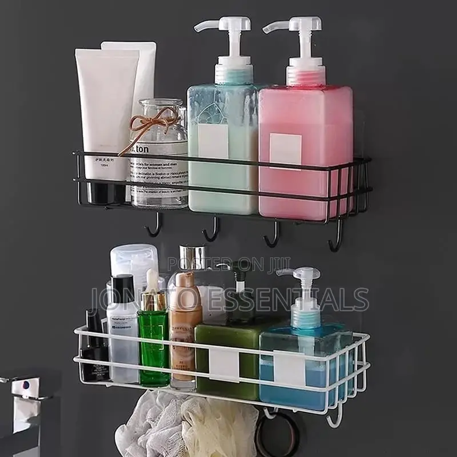 Wall mounted bathroom or kitchen organizer with hooks punch free storage rack /organizer type :wall mounted floating metallic shelf with hooks for more holding capacity uses : used in the kitchen as a seasoning storage rack bathroom non perforated organizer to hold shampoo ,face towel , shower gel etc size :28 by 10.5 by 9 cm