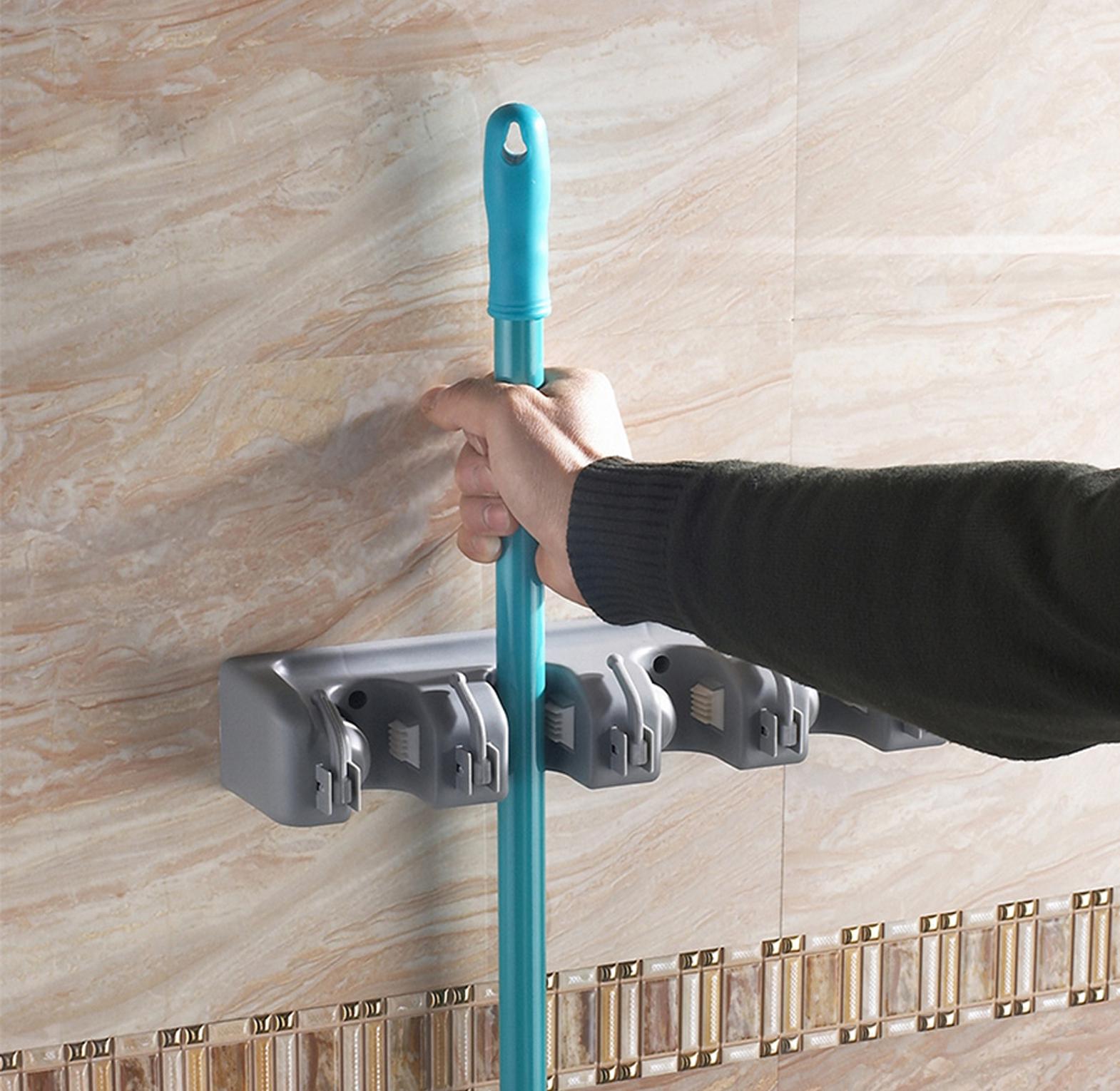 Wall mounted mop broom brush organizer holder the mop and broom holder organizer is made of tough plastic, which can hold up to 10 kg of weight. mounted with screws, drilling installation. fit to wall easily and never worry the hanger will fall down on the next morning perfect for kitchen bathroom ,hospitals,offices etc broom mop holder tidy organizer, wall mounted organizer with 5 position 6 hooks for brush mop and broom tool storage